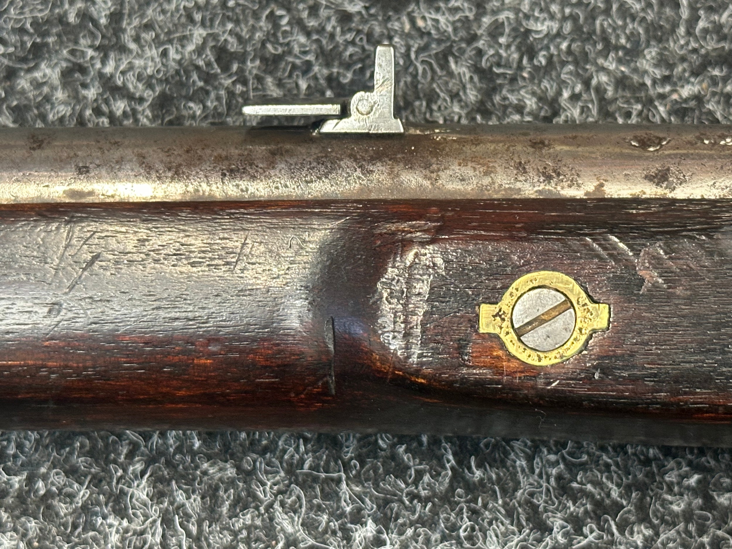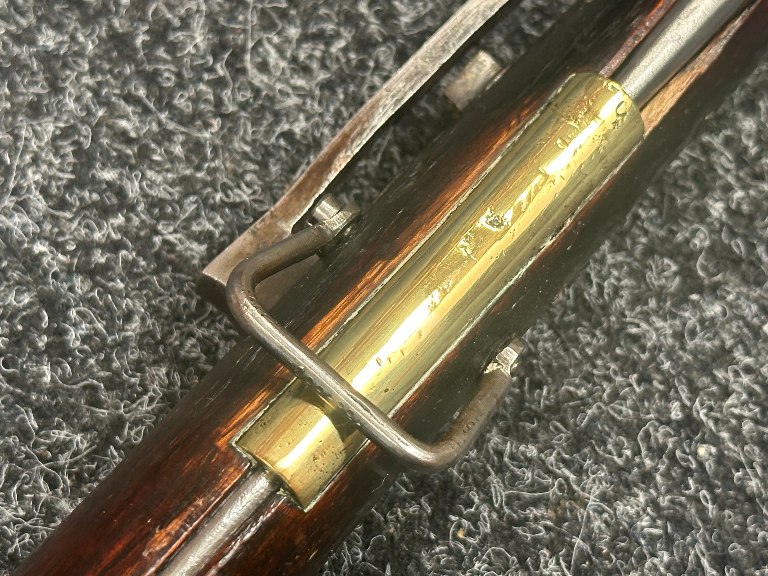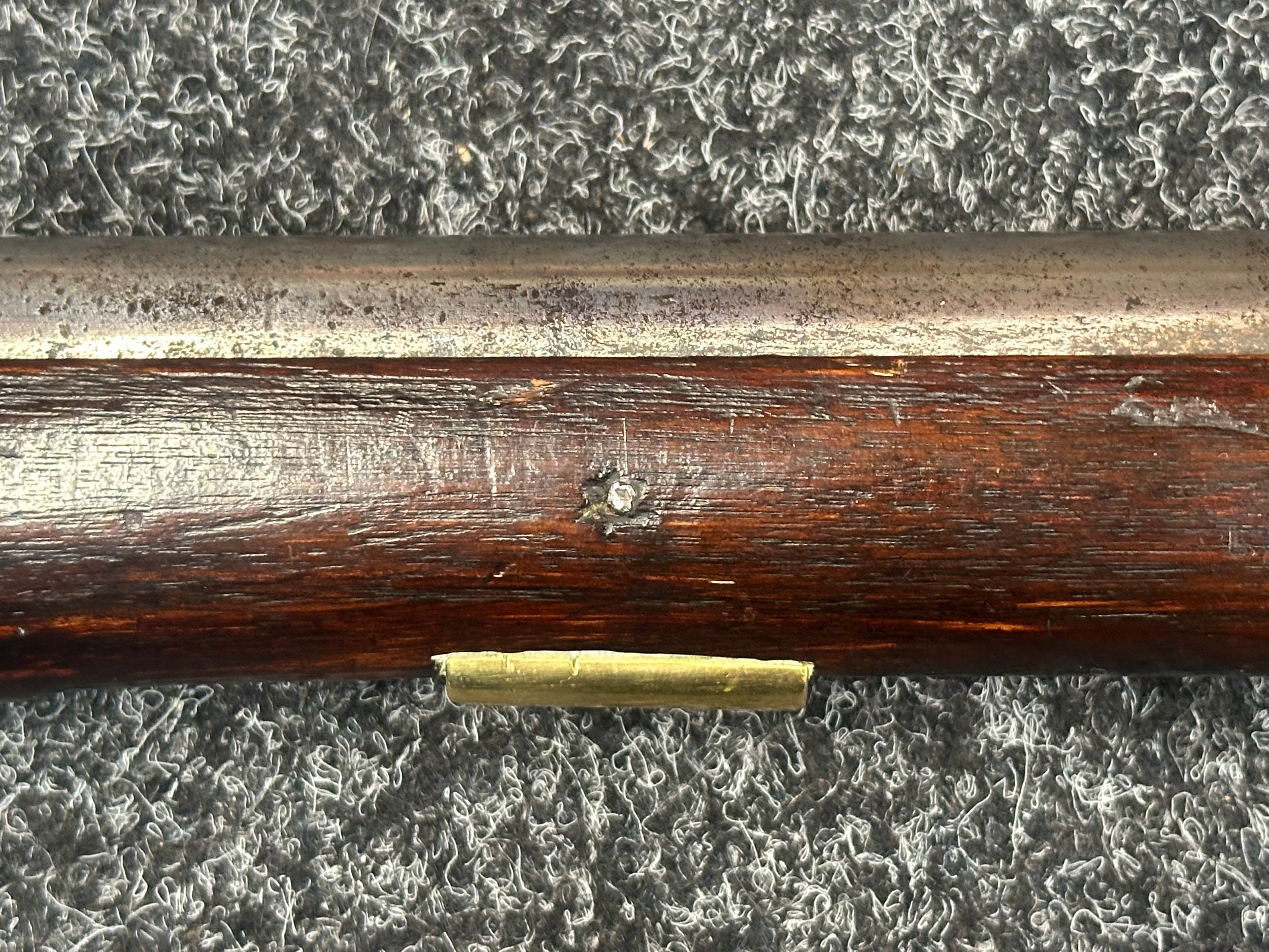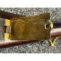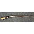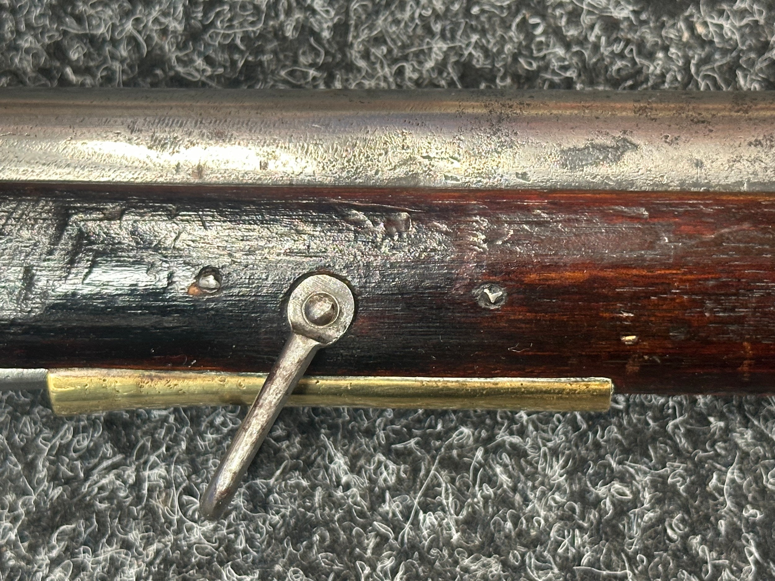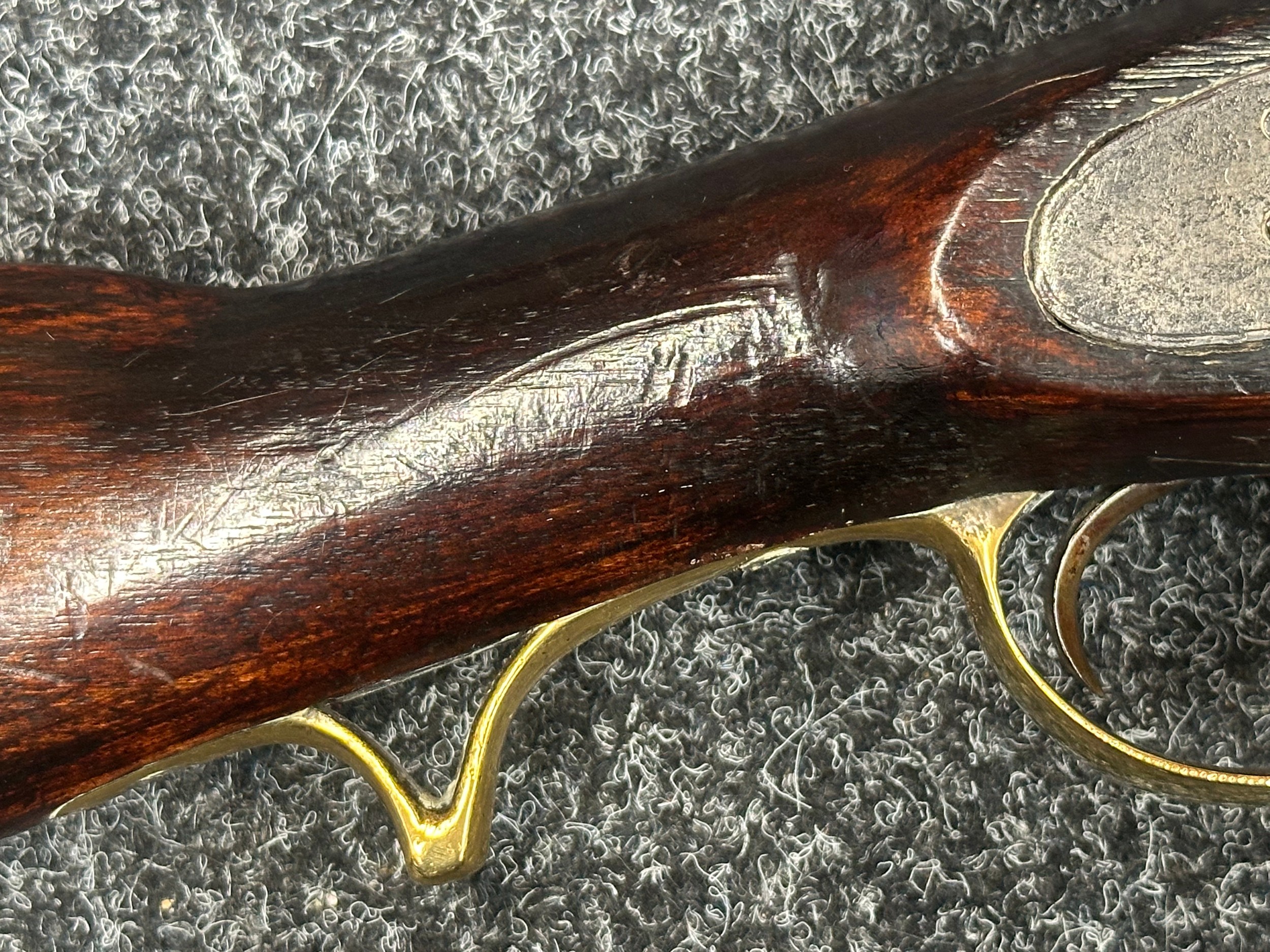 British P-1847 2nd Pattern Side Action Lock Brunswick 2-Groove Percussion Cap Rifle bearing the British East India Company "Rampant Lion" marking on the lock plate. Action a/f does not hold at either half or full cock. Two position flip up sight. Brass fittings. Barrel length 750mm. Overall length 115.5cm. Complete with ramrod. NOTE: Section 58 (2) No licence required in the UK.