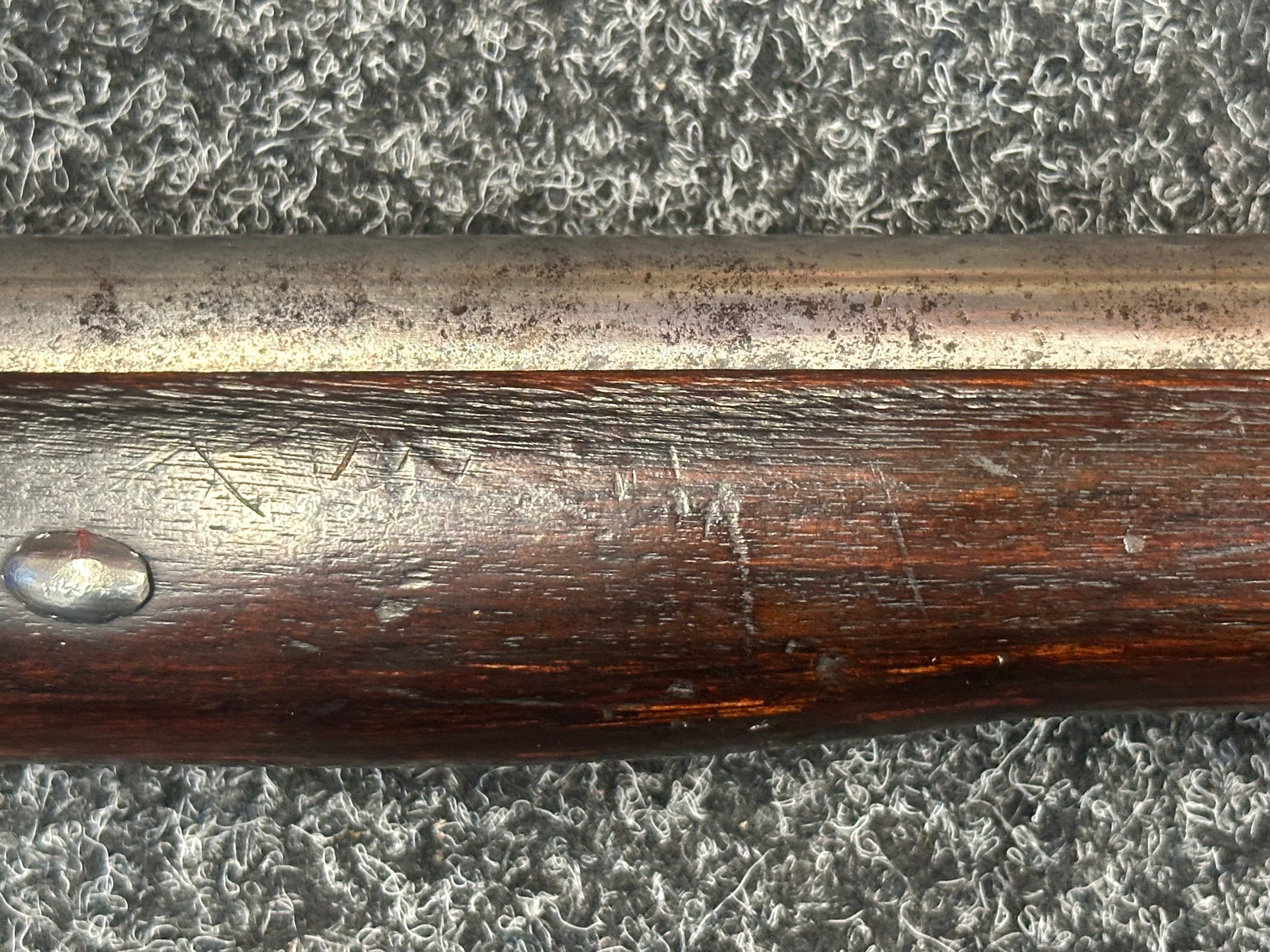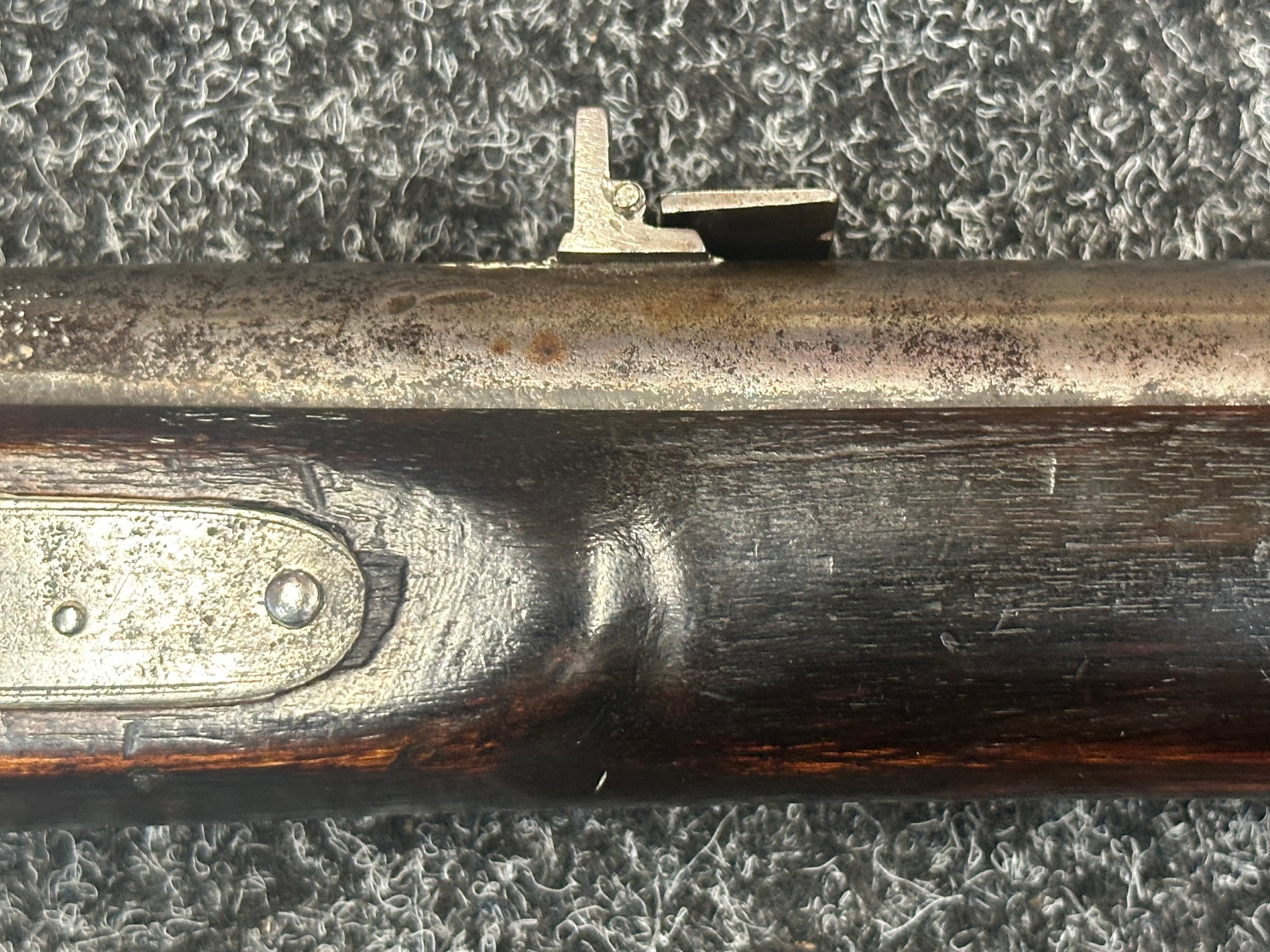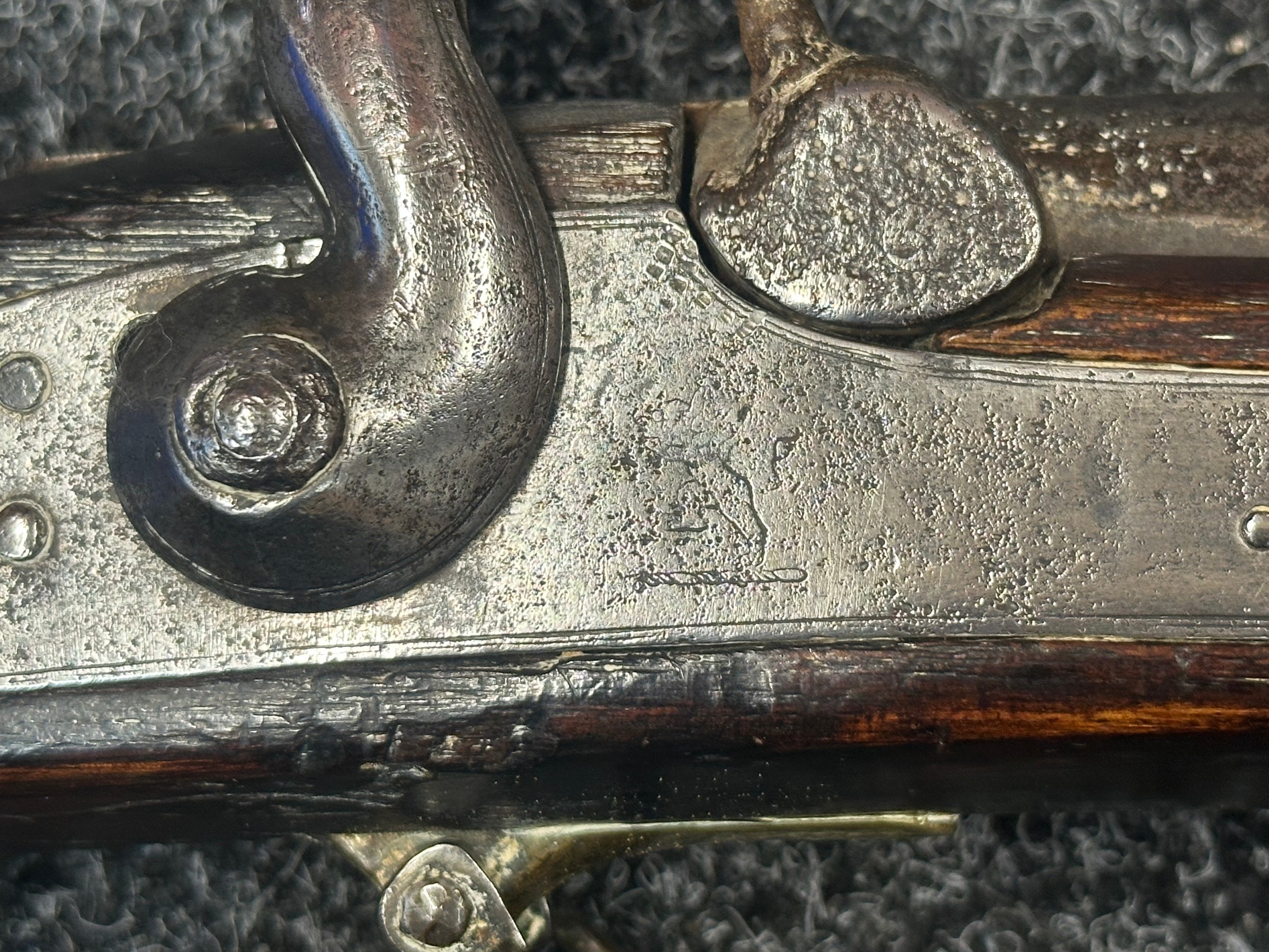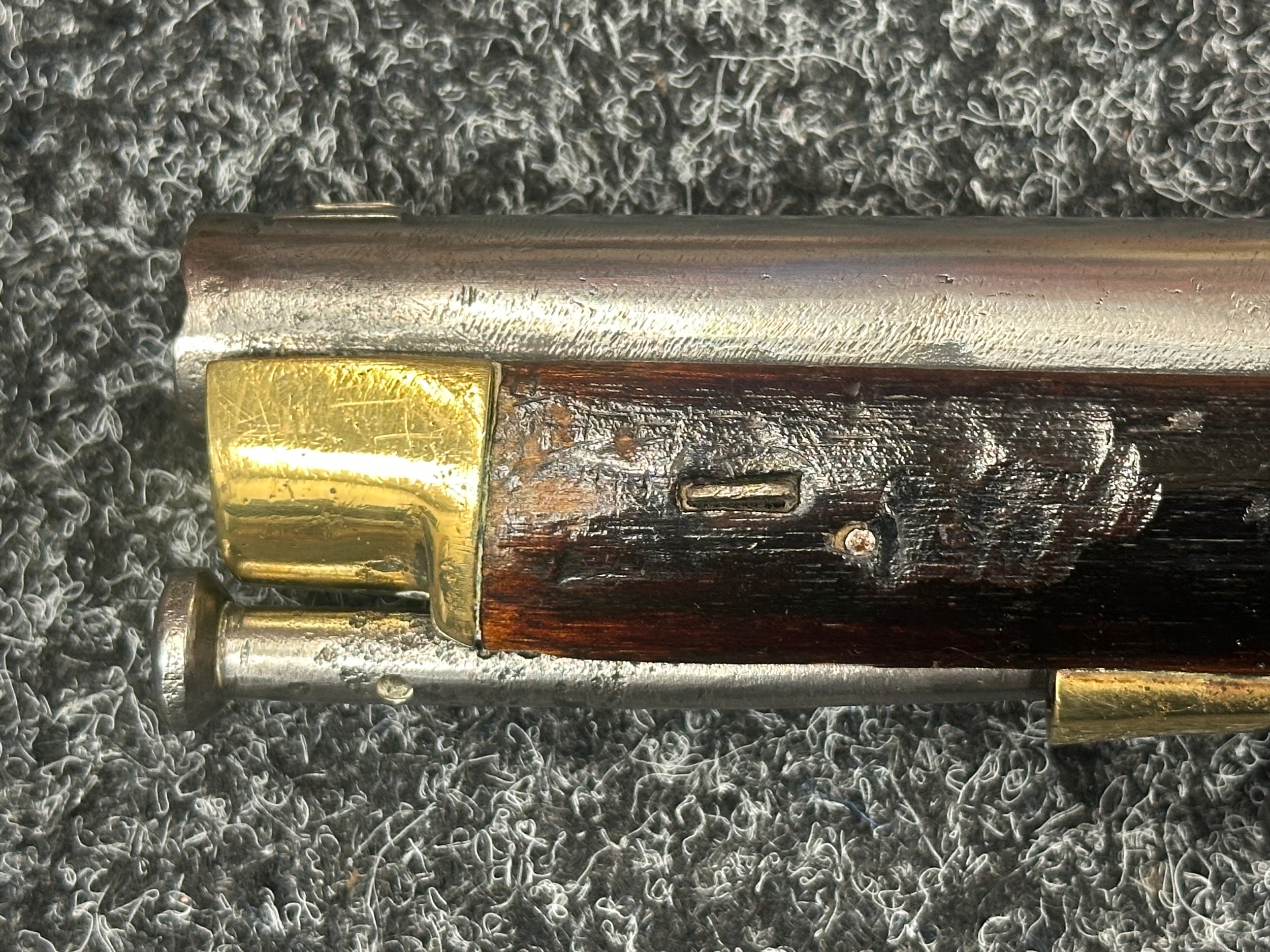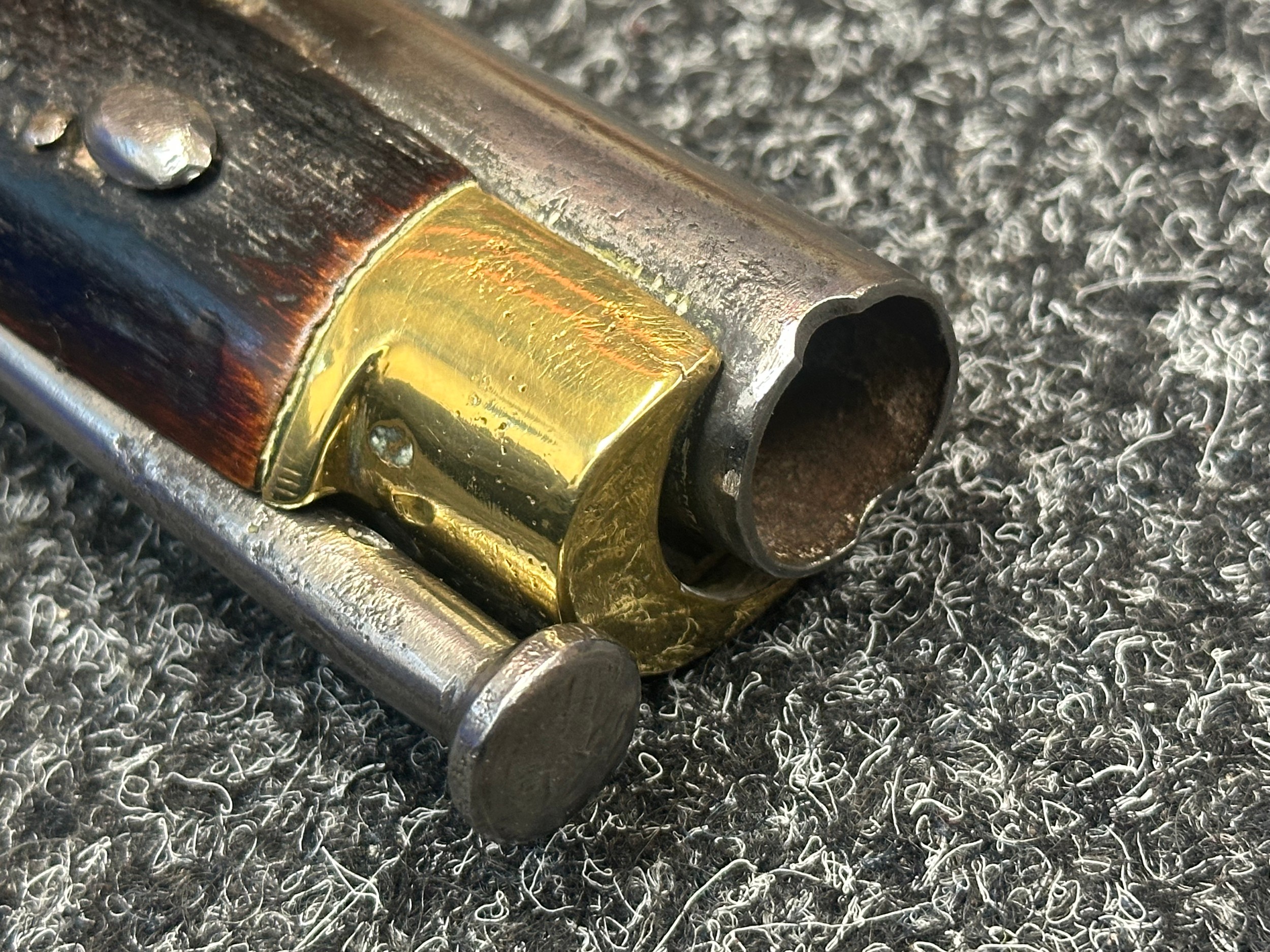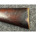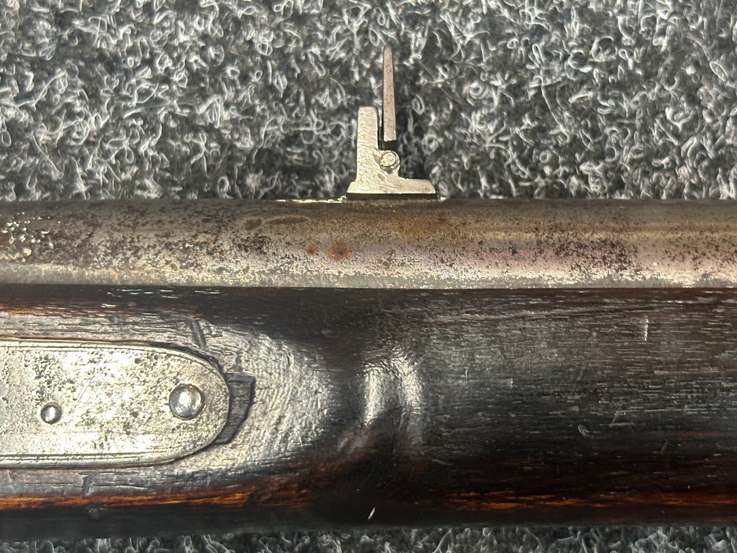 British P-1847 2nd Pattern Side Action Lock Brunswick 2-Groove Percussion Cap Rifle bearing the British East India Company "Rampant Lion" marking on the lock plate. Action a/f does not hold at either half or full cock. Two position flip up sight. Brass fittings. Barrel length 750mm. Overall length 115.5cm. Complete with ramrod. NOTE: Section 58 (2) No licence required in the UK.