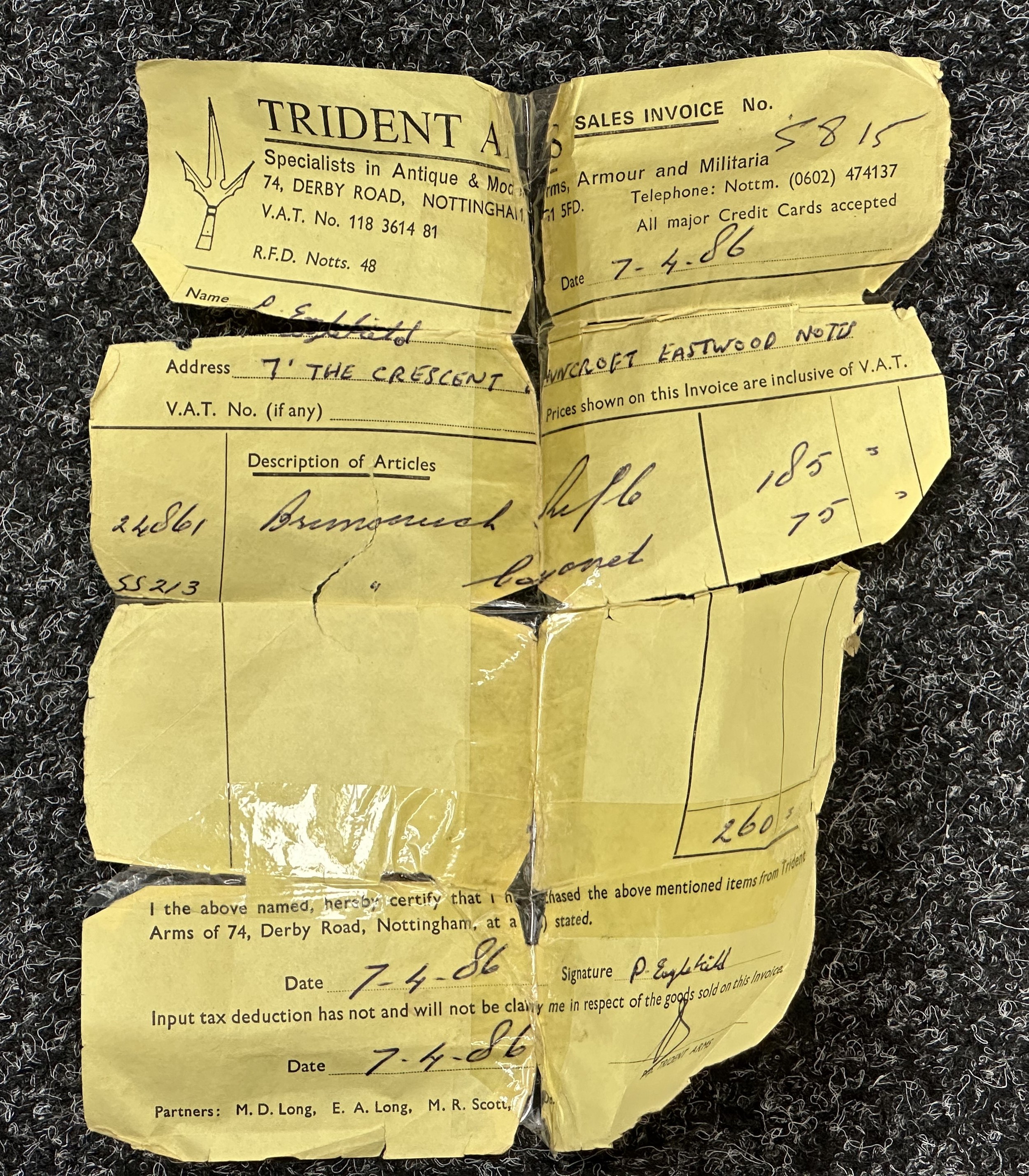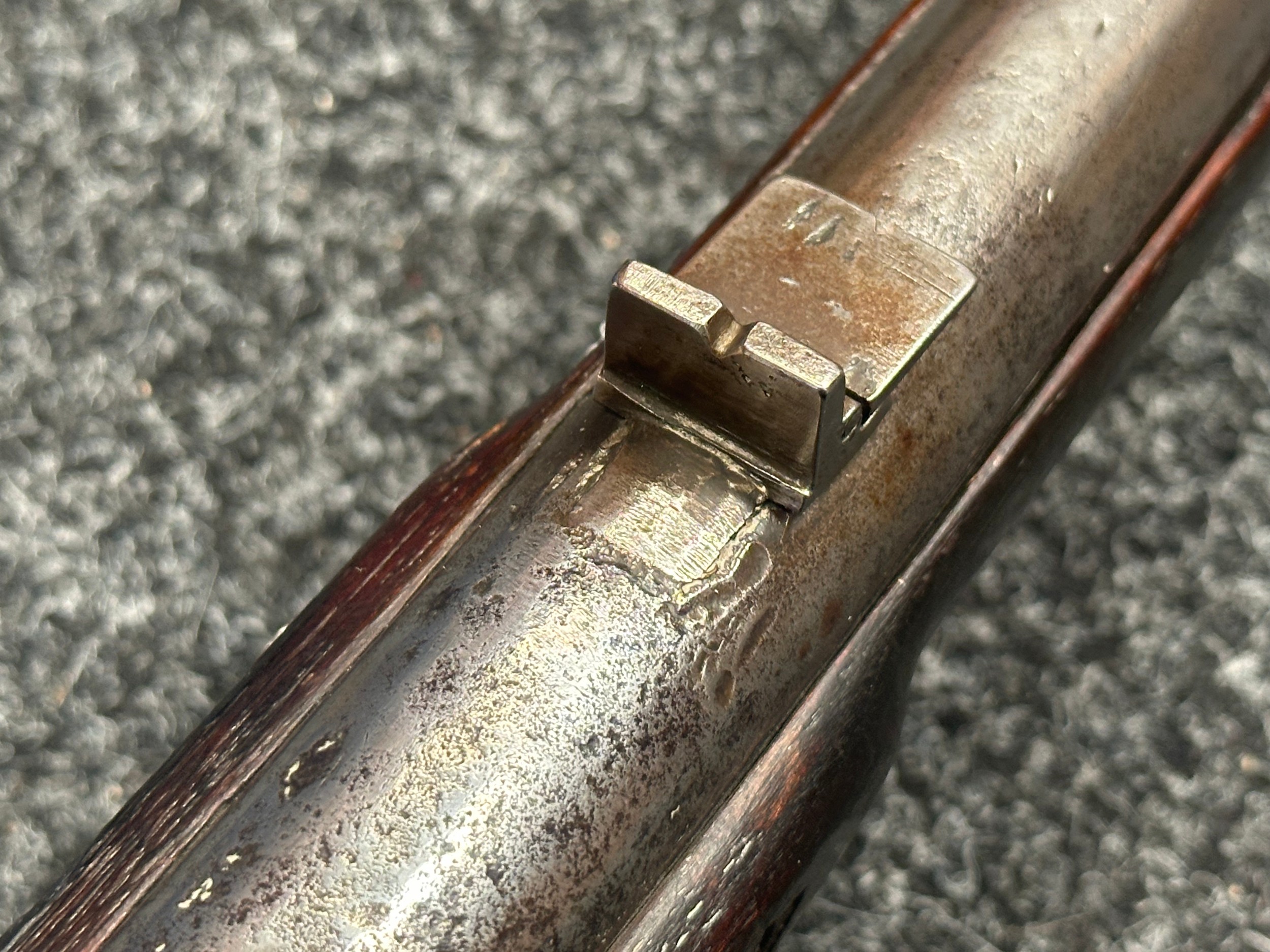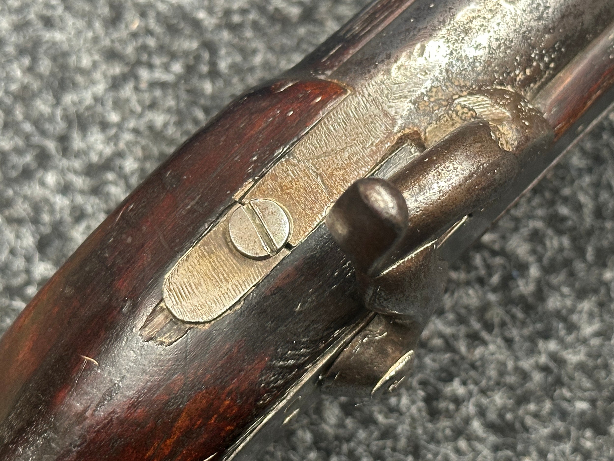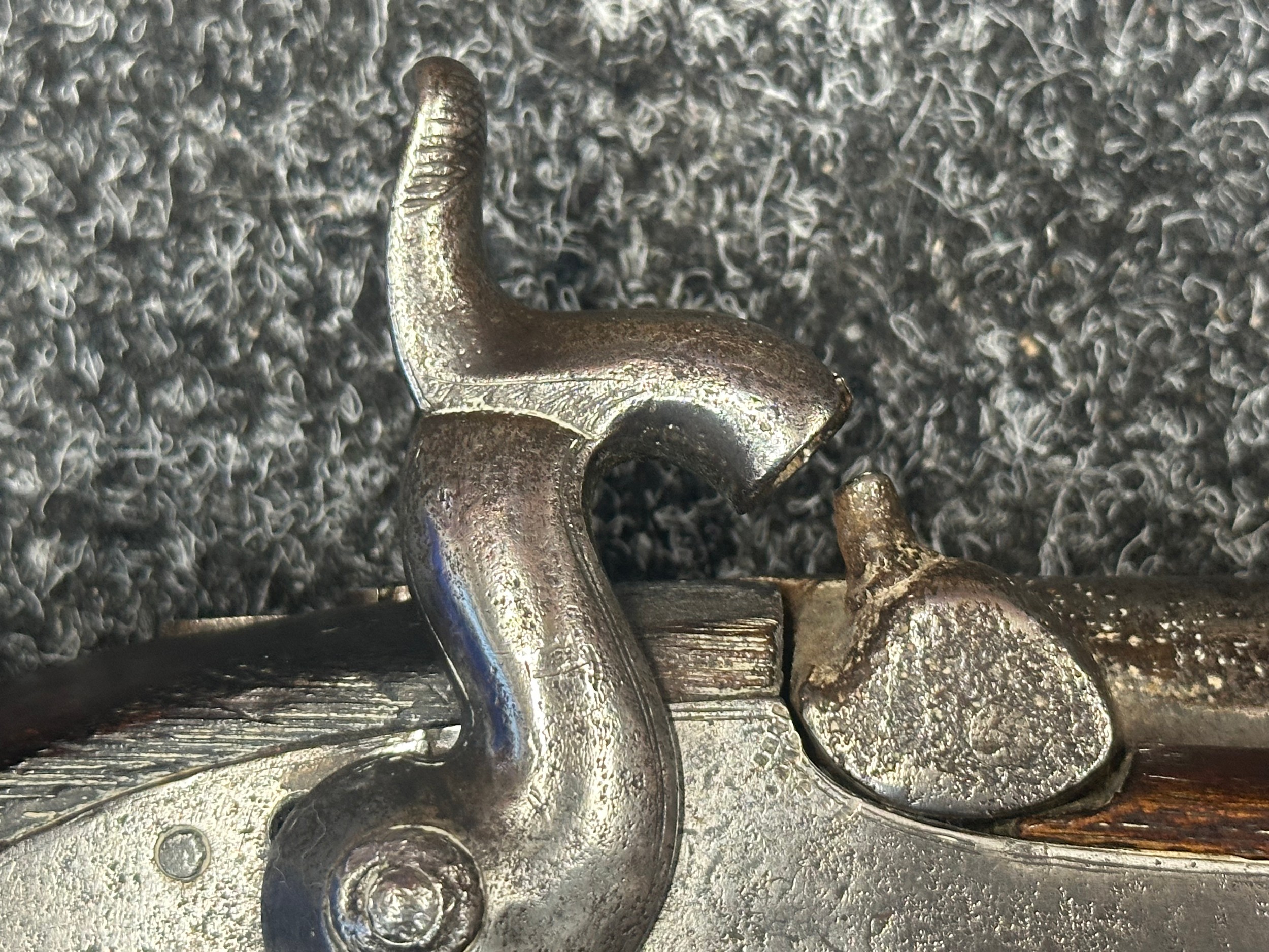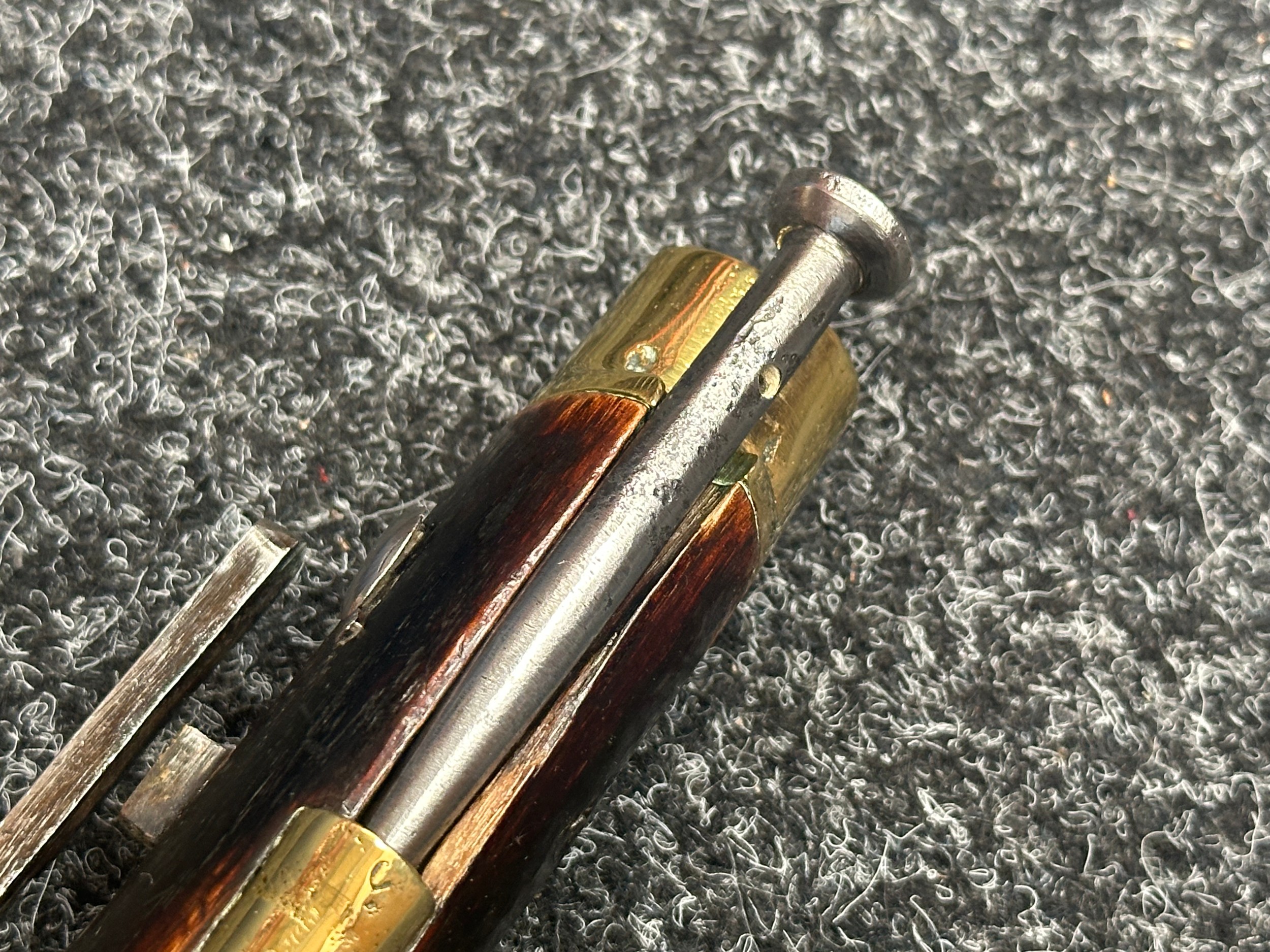 British P-1847 2nd Pattern Side Action Lock Brunswick 2-Groove Percussion Cap Rifle bearing the British East India Company "Rampant Lion" marking on the lock plate. Action a/f does not hold at either half or full cock. Two position flip up sight. Brass fittings. Barrel length 750mm. Overall length 115.5cm. Complete with ramrod. NOTE: Section 58 (2) No licence required in the UK.