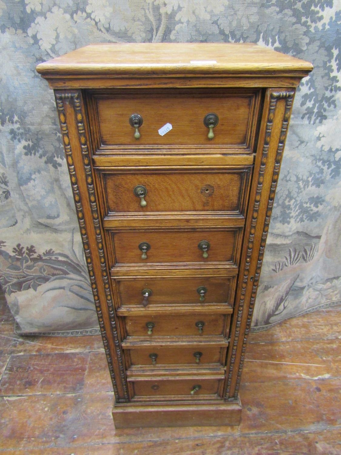 An Edwardian oak Wellington chest comprising seven drawers, with applied repeating moulded detail and central locking system, 107cm high