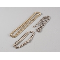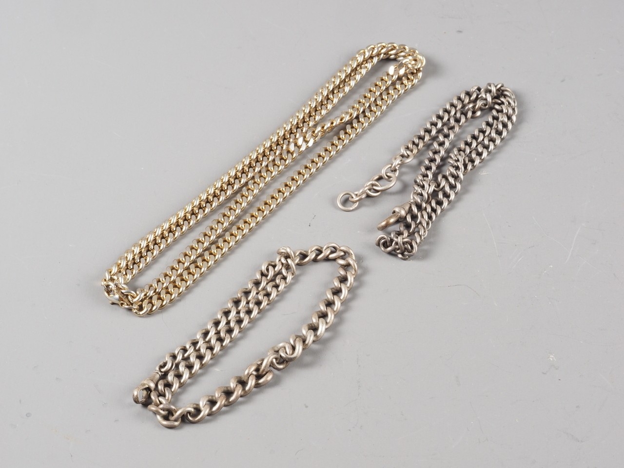 A silver curb link chain, 17" long, a similar smaller chain, 2.4oz troy approx, and a gold plated chain