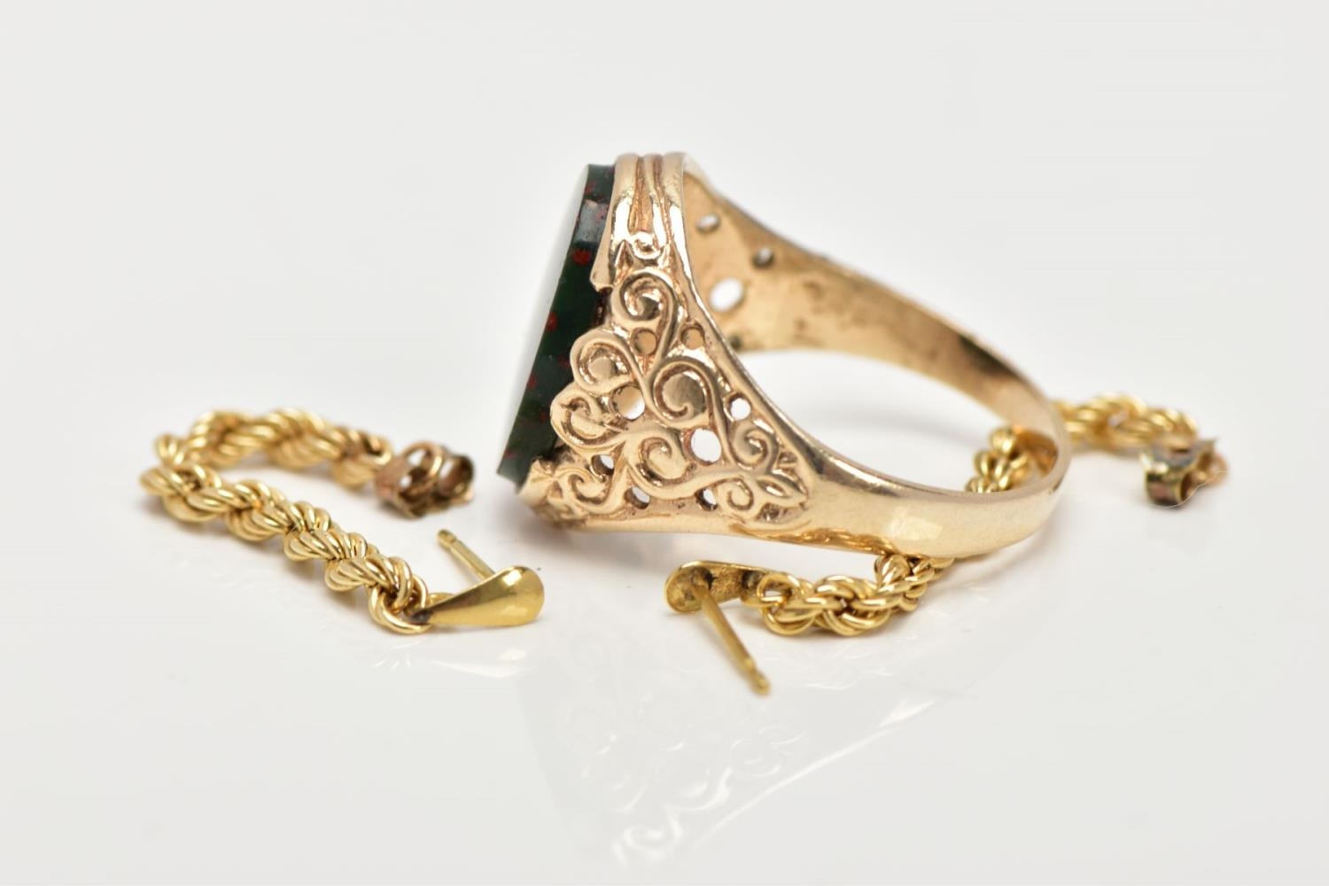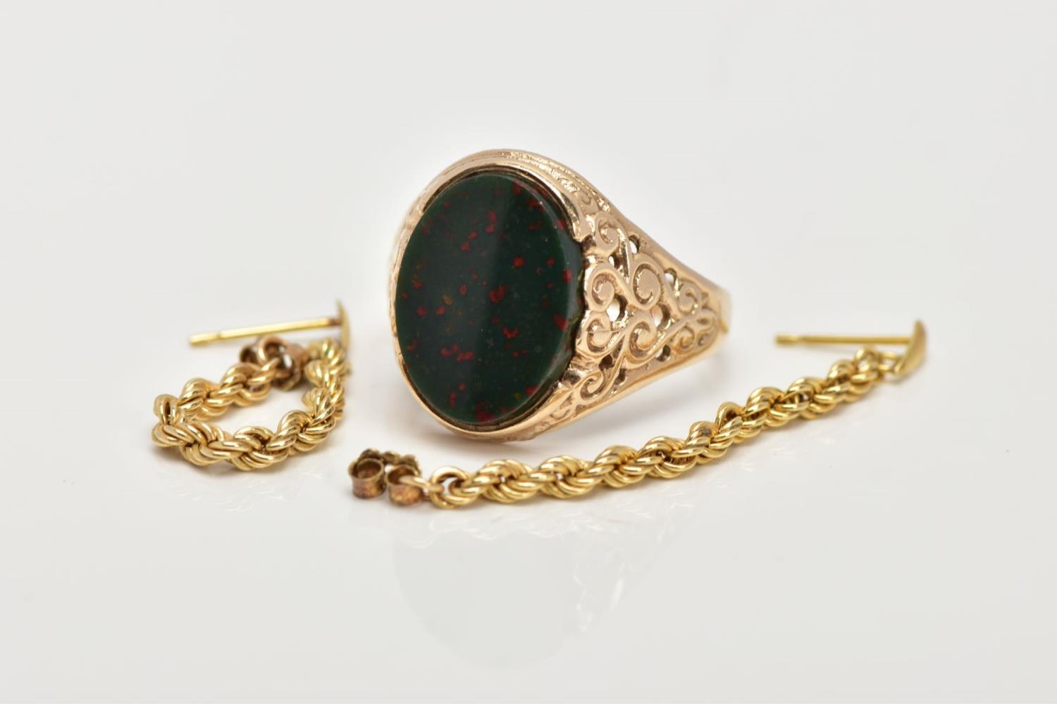 A GENTS 9CT GOLD SIGNET RING AND A PAIR OF YELLOW METAL ROPE TWIST EARRINGS, designed with an oval bloodstone, openwork scroll detailed shoulders, hallmarked 9ct gold Birmingham, ring size U, approximate gross weight 5.0 grams, together with a pair of rope twist earrings stamped '375' approximate gross weight 0.8 grams