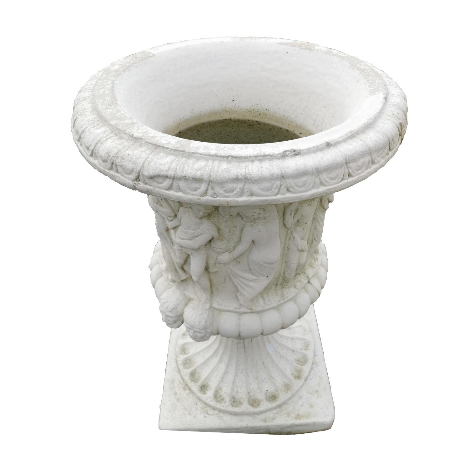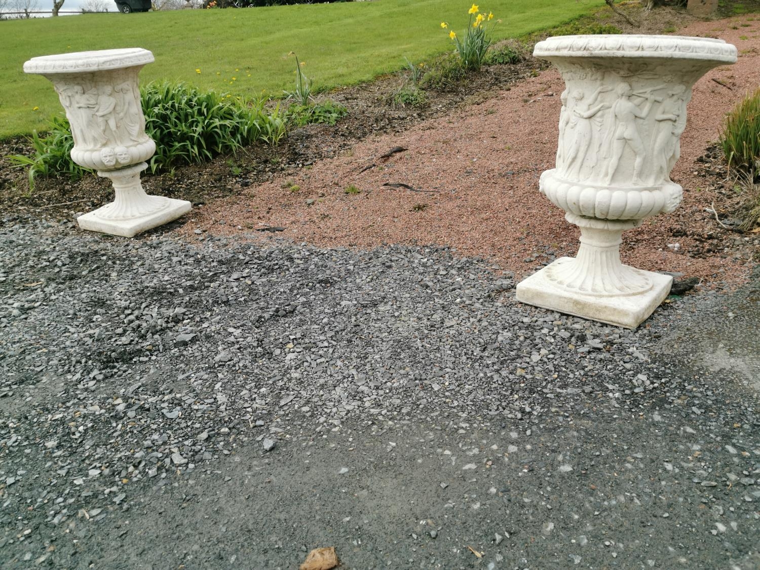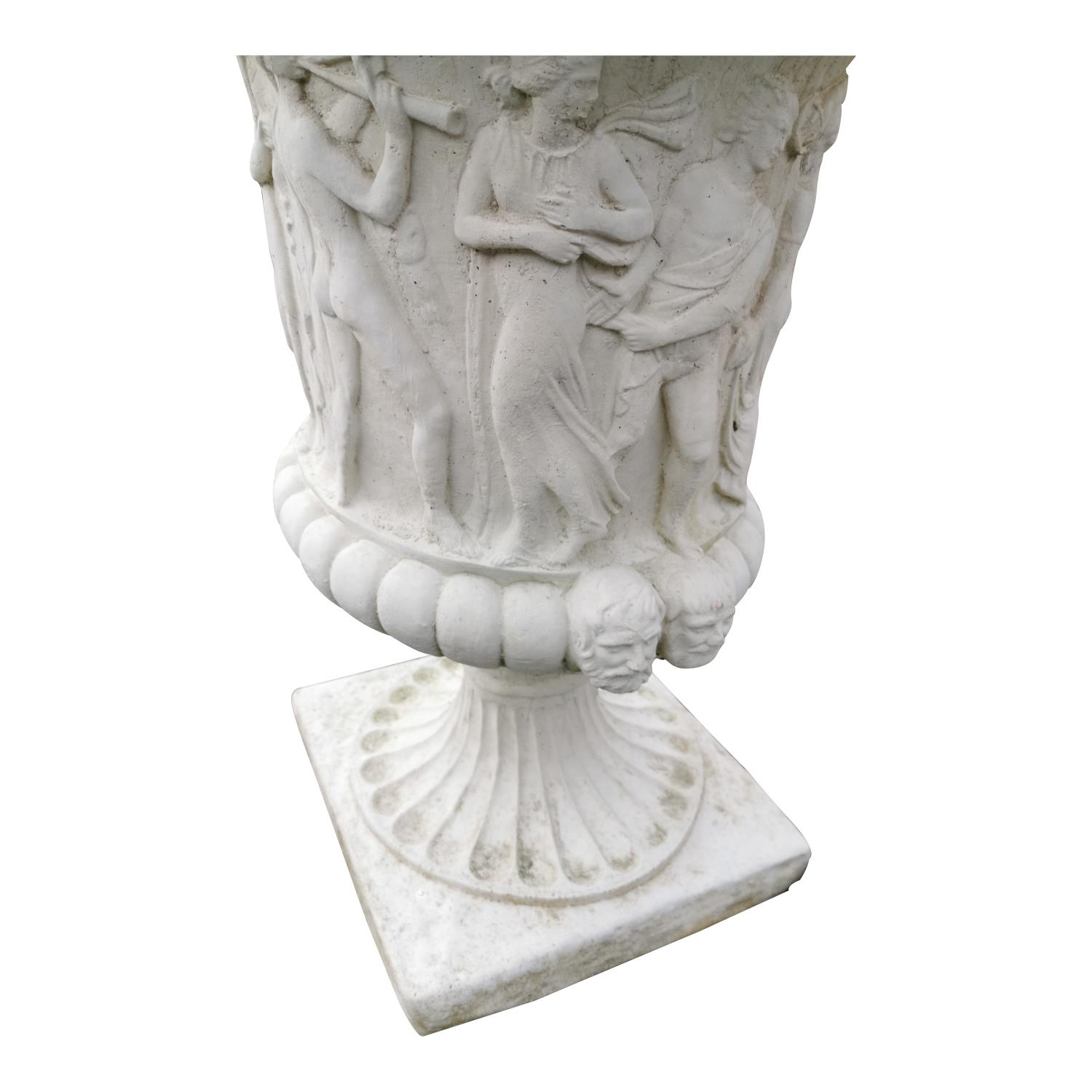 Pair of good quality composition urns in the Grecian style {94 cm H x 65 cm Dia.}.