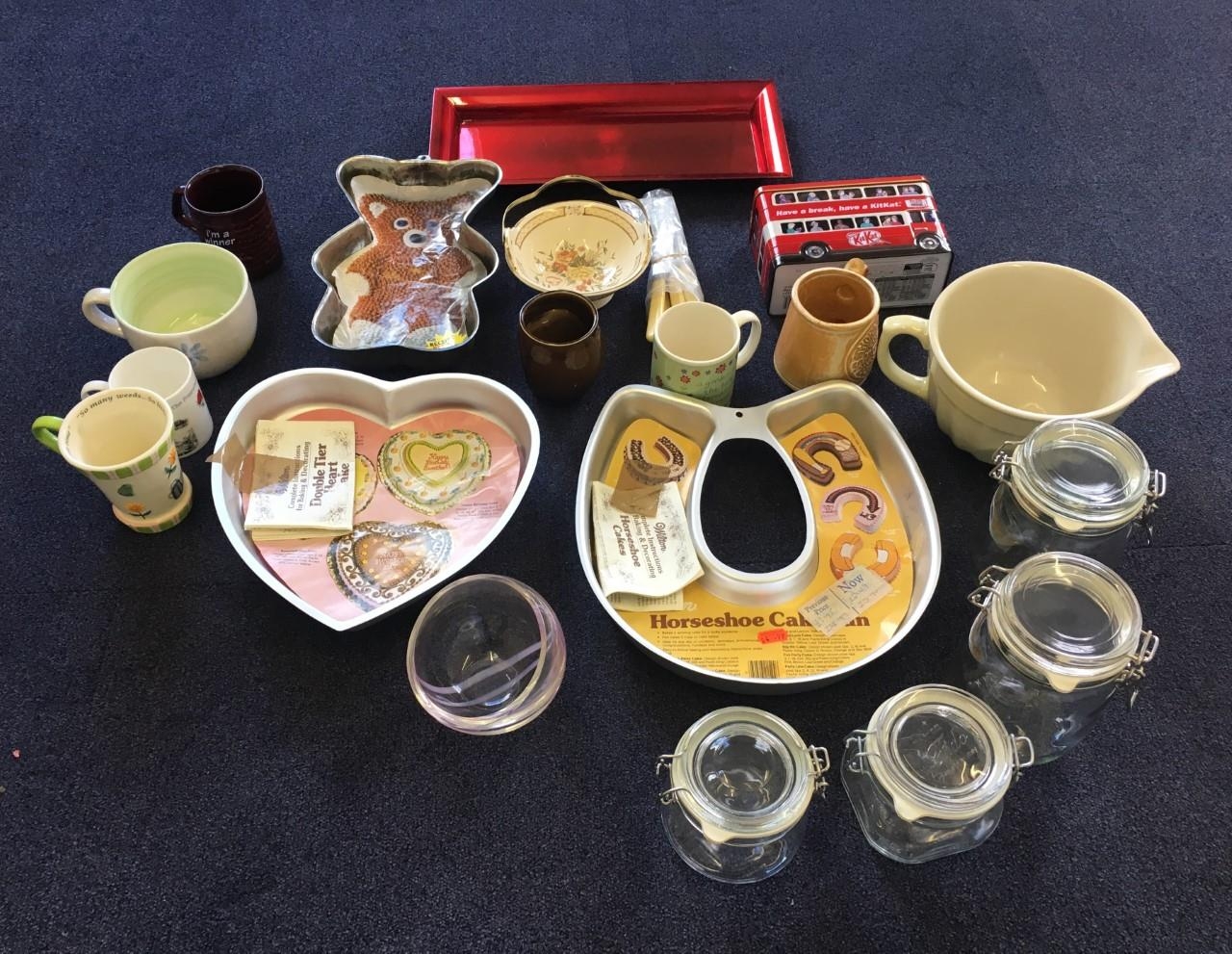 A selection of new & used kitchenware. Twenty pieces in total. Includes baking trays, glass jars, mugs, vintage butter knives etc.