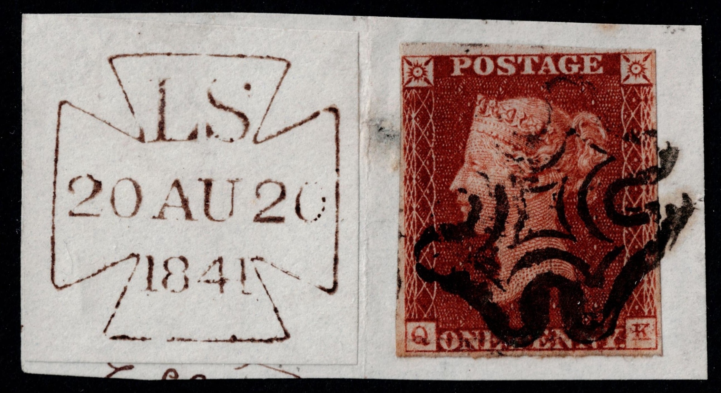 GB 1841 1d red black plate 11 CK 4m tied piece with 20.8.41 London datestamp attached sg7 Cat. £130
