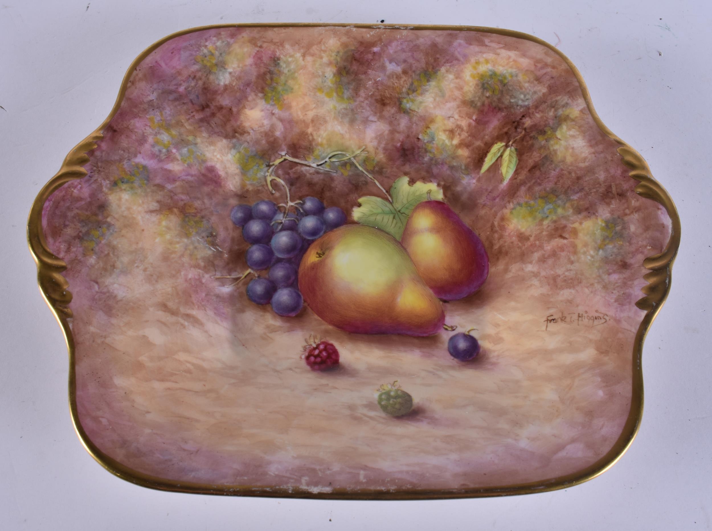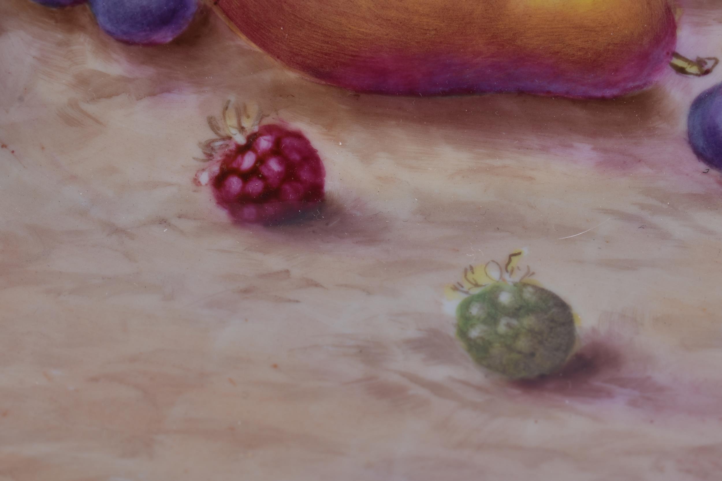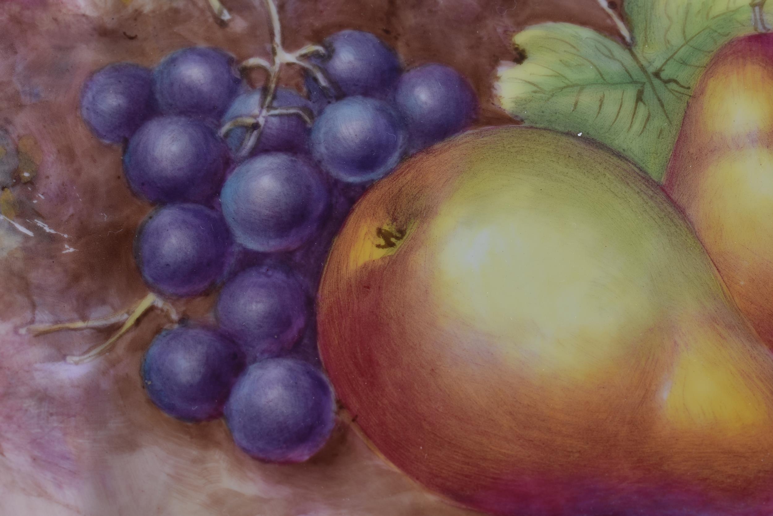 A ROYAL WORCESTER ARTIST FRUIT PAINTED PORCELAIN DISH by Frank Higgins. 26 cm wide.