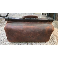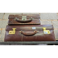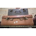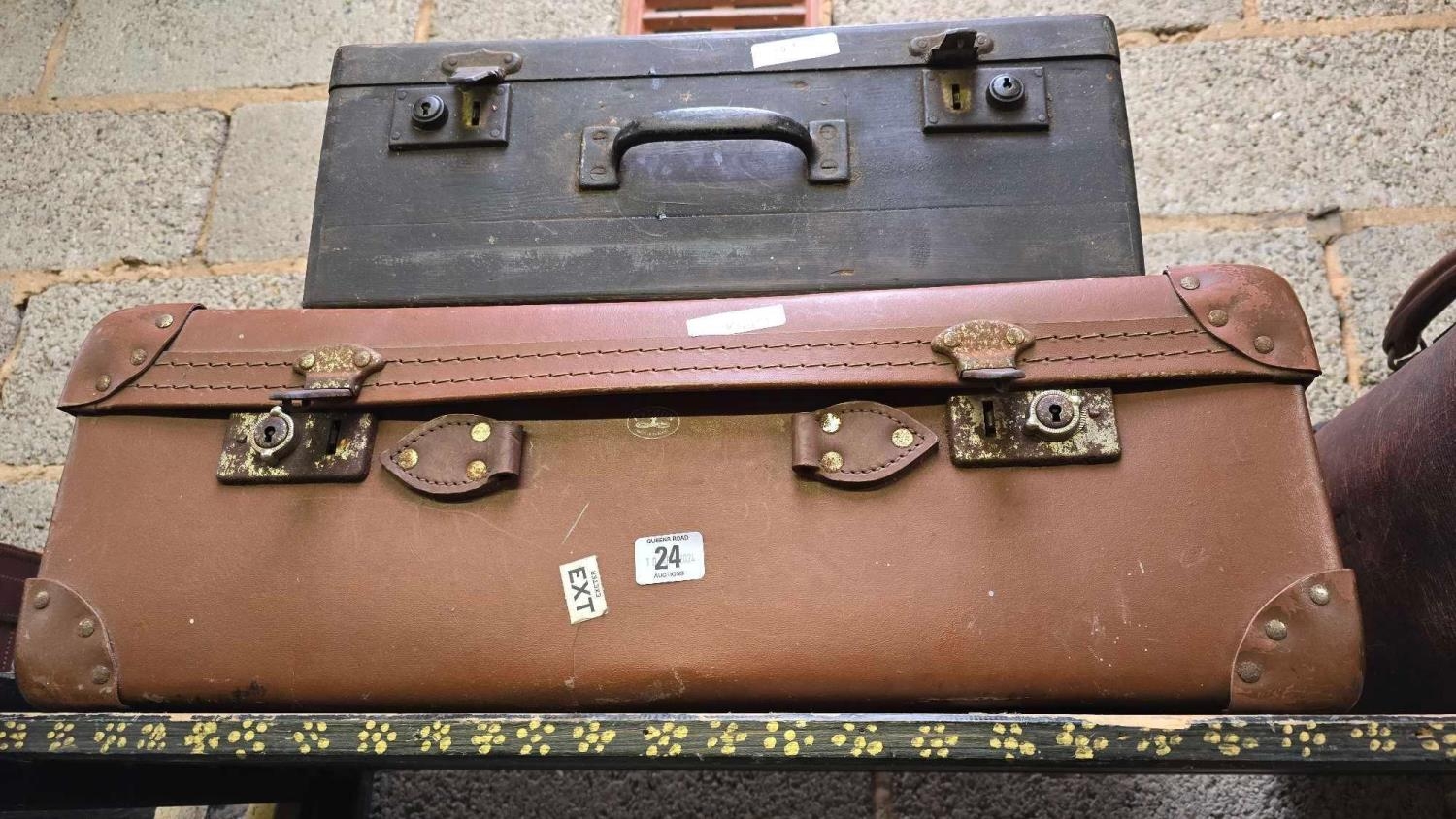 BROWN FIBRE SUITCASE MINUS HANDLE & A WOODEN DOCUMENT BOX