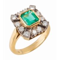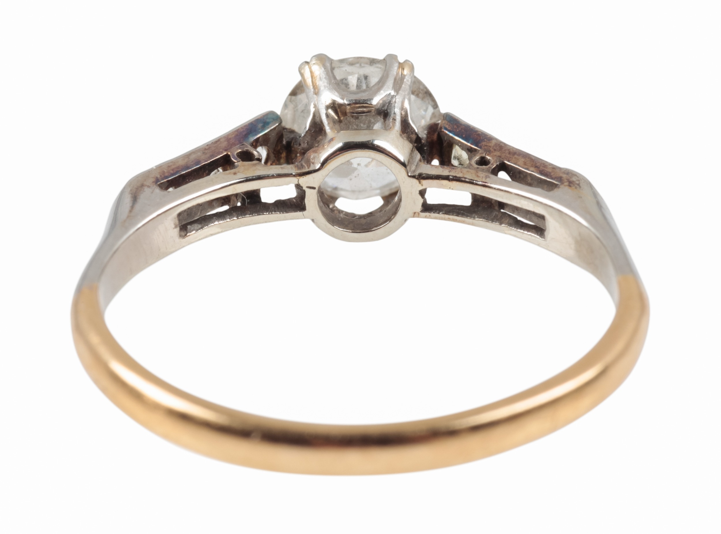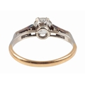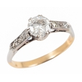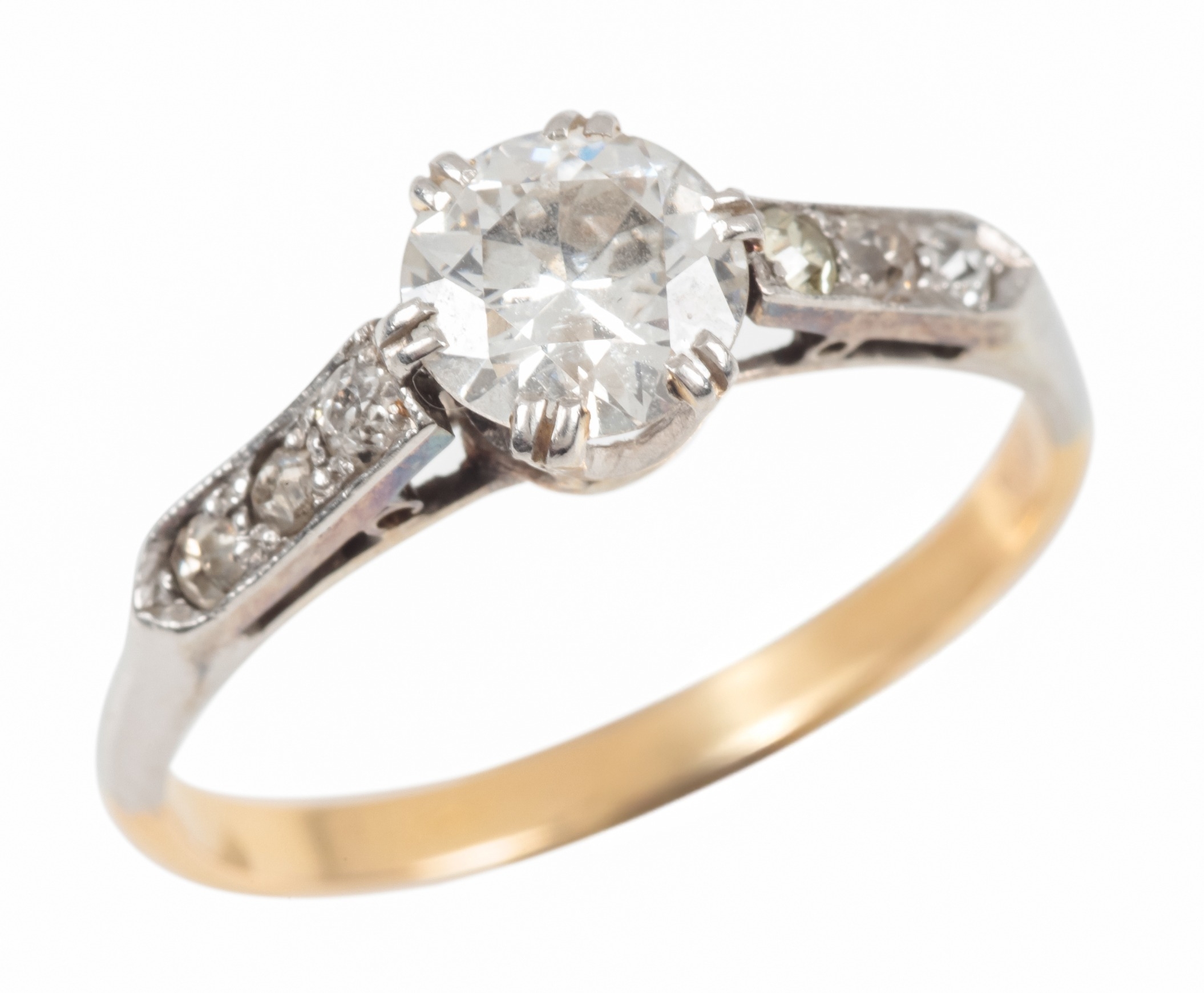 the transitional round brilliant cut diamond c. 0.86 carats, the white shoulders each set with three old cut and single cut diamonds, c. 0.15 carats combined, the shank unmarked testing as 18ct, ring size O, c. 2.8 grams