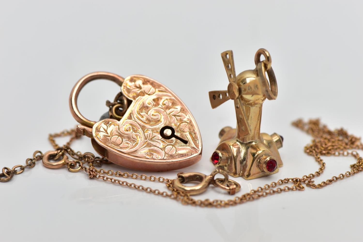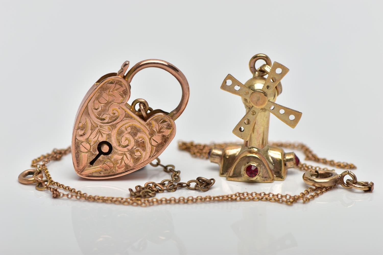 A YELLOW METAL PADLOCK CLASP, CHARM AND CHAIN, a yellow metal heart padlock with rose tones, engraved with a scrolling foliage design, fitted with a safety chain, stamped 'W.J.S 9ct', a yellow metal windmill charm pendant, moving sails, set with four circular cut red paste stones, approximate length 21mm, stamped 9k, a fine yellow metal trace chain, fitted with a spring clasp, together with a second spring clasp stamped 9k, approximate gross weight 7.2 grams (condition report: general moderate wear, padlock clasp secure, chain knotted)