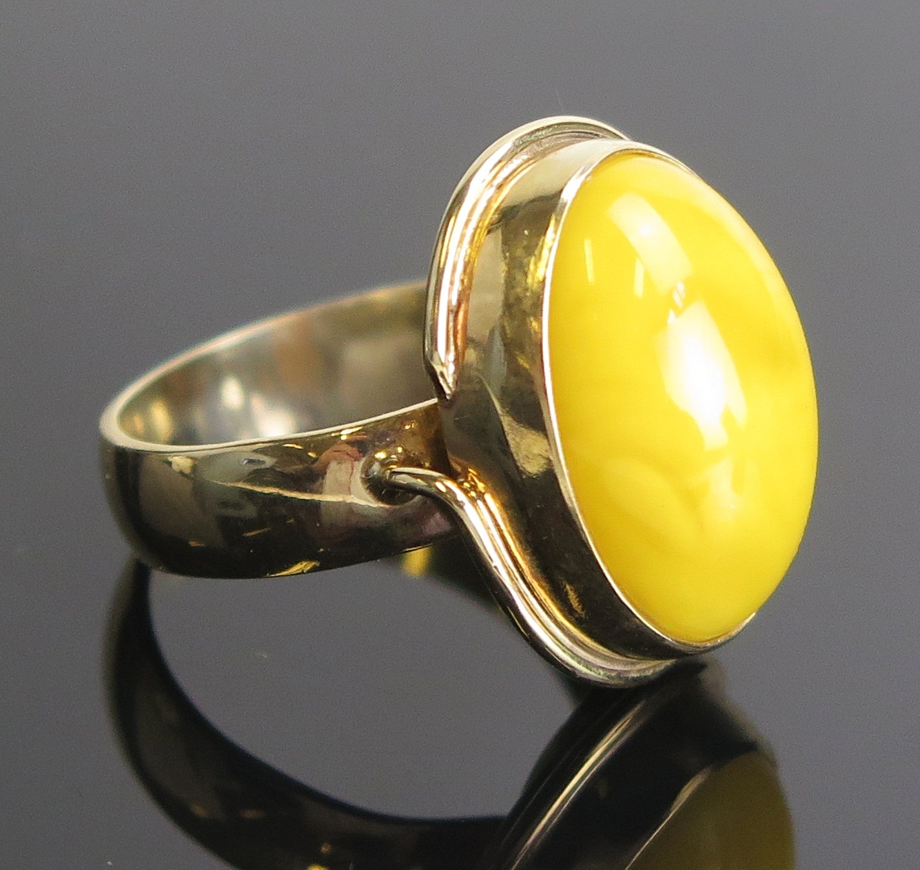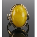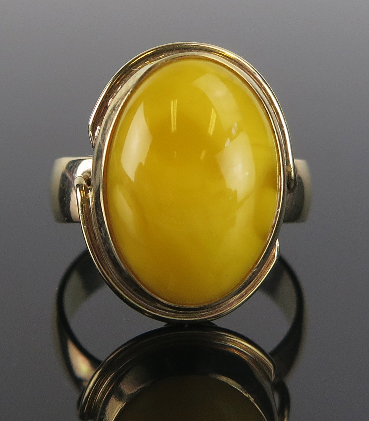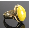 An amber ring in a 9ct yellow gold setting, c. 21x16.5mm head, size P.75, hallmarked, 6.68g. Boxed
