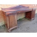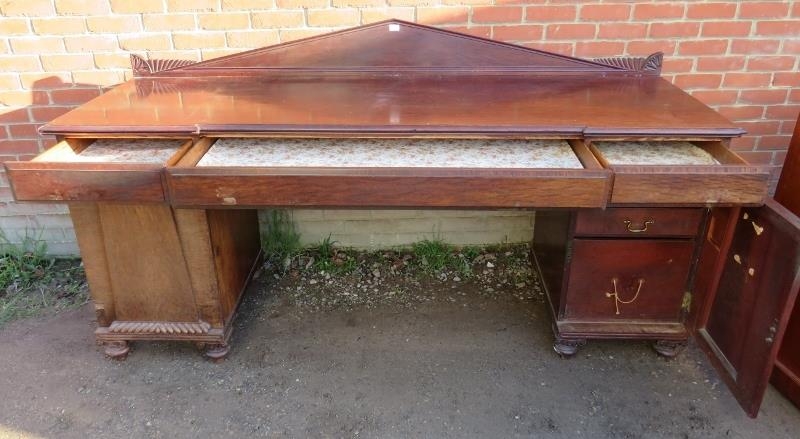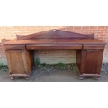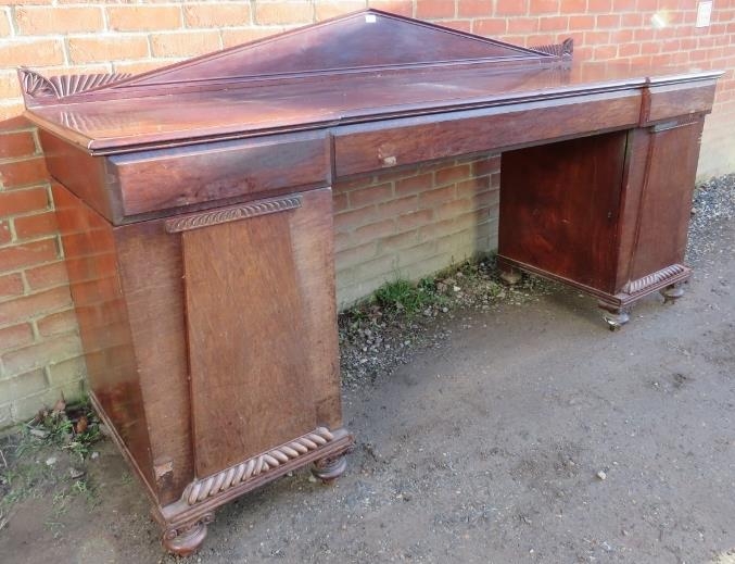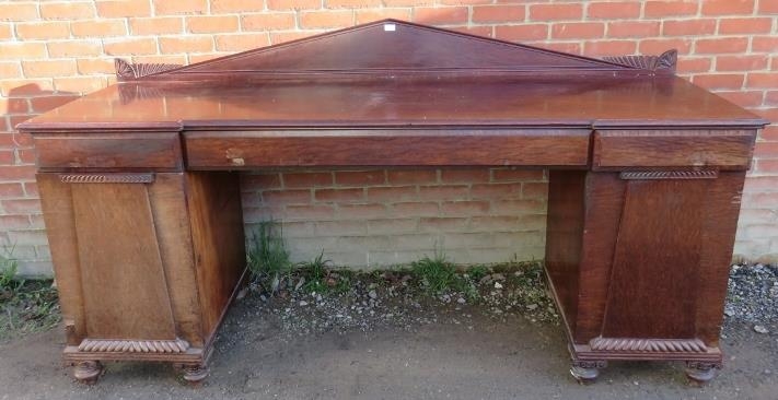 A stylish 19th century mahogany twin pedestal buffet/sideboard, of three blind frieze drawers, featuring gadrooned detailing and lead lined wine cellarette, on tapered bun feet.