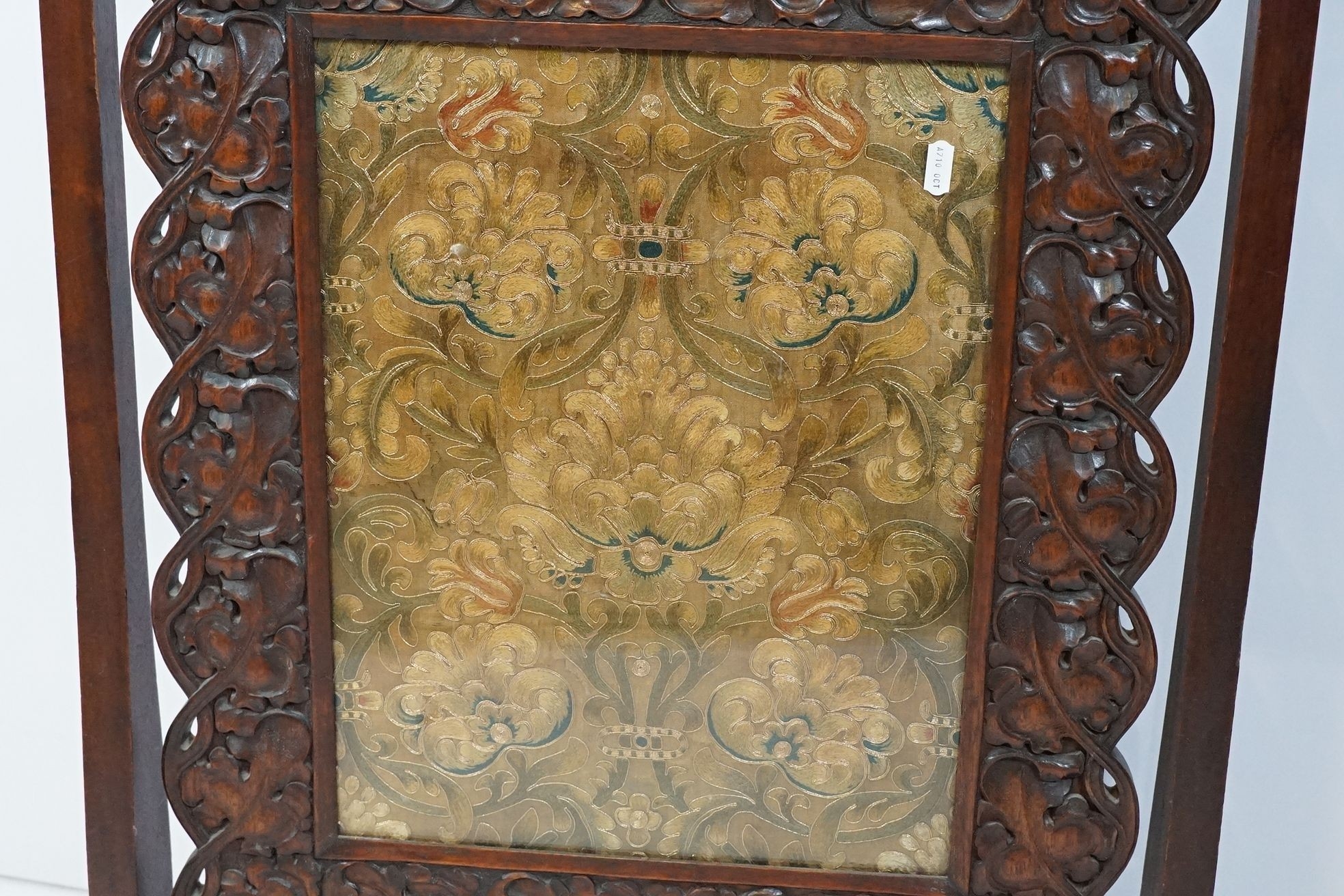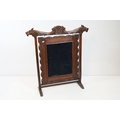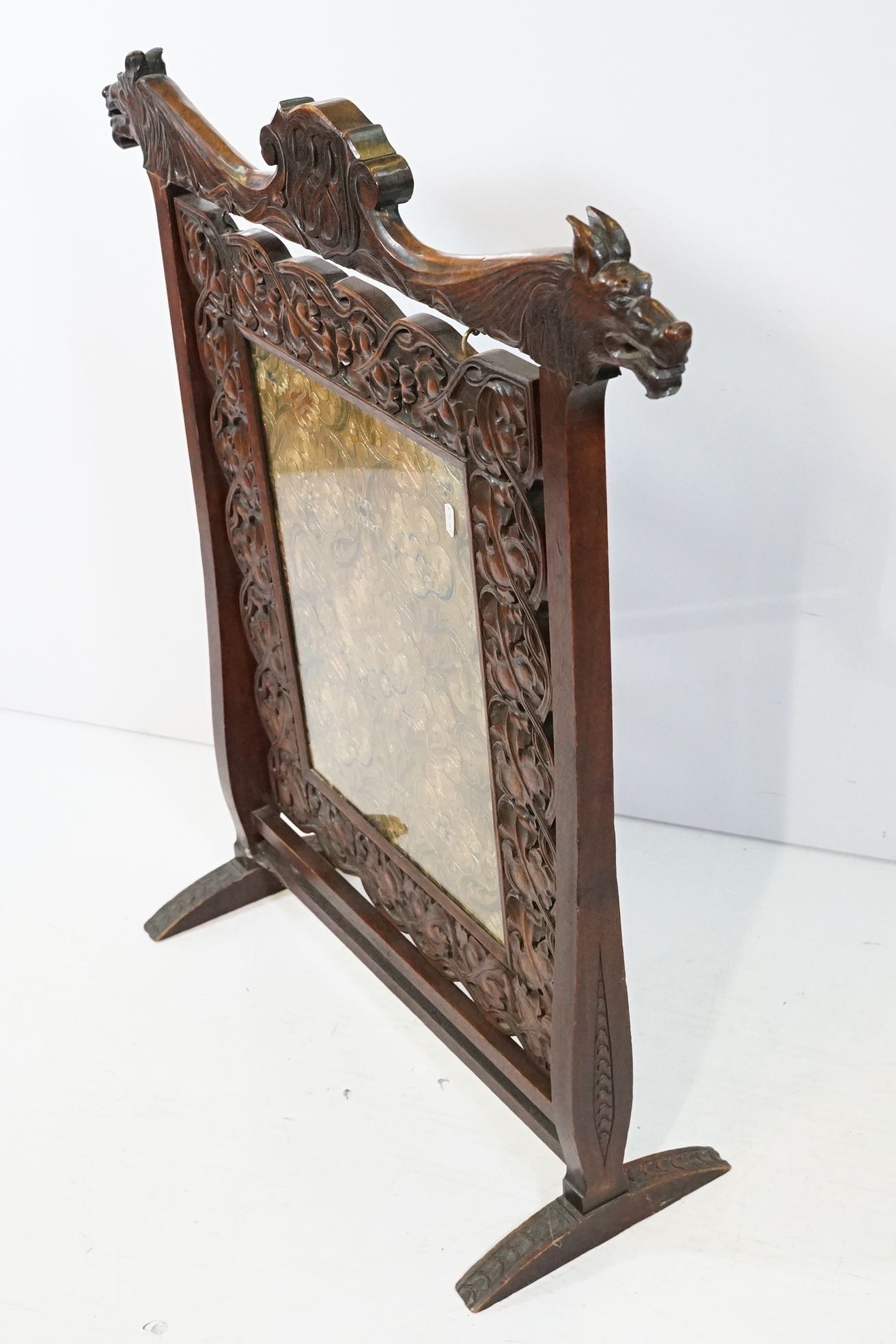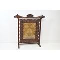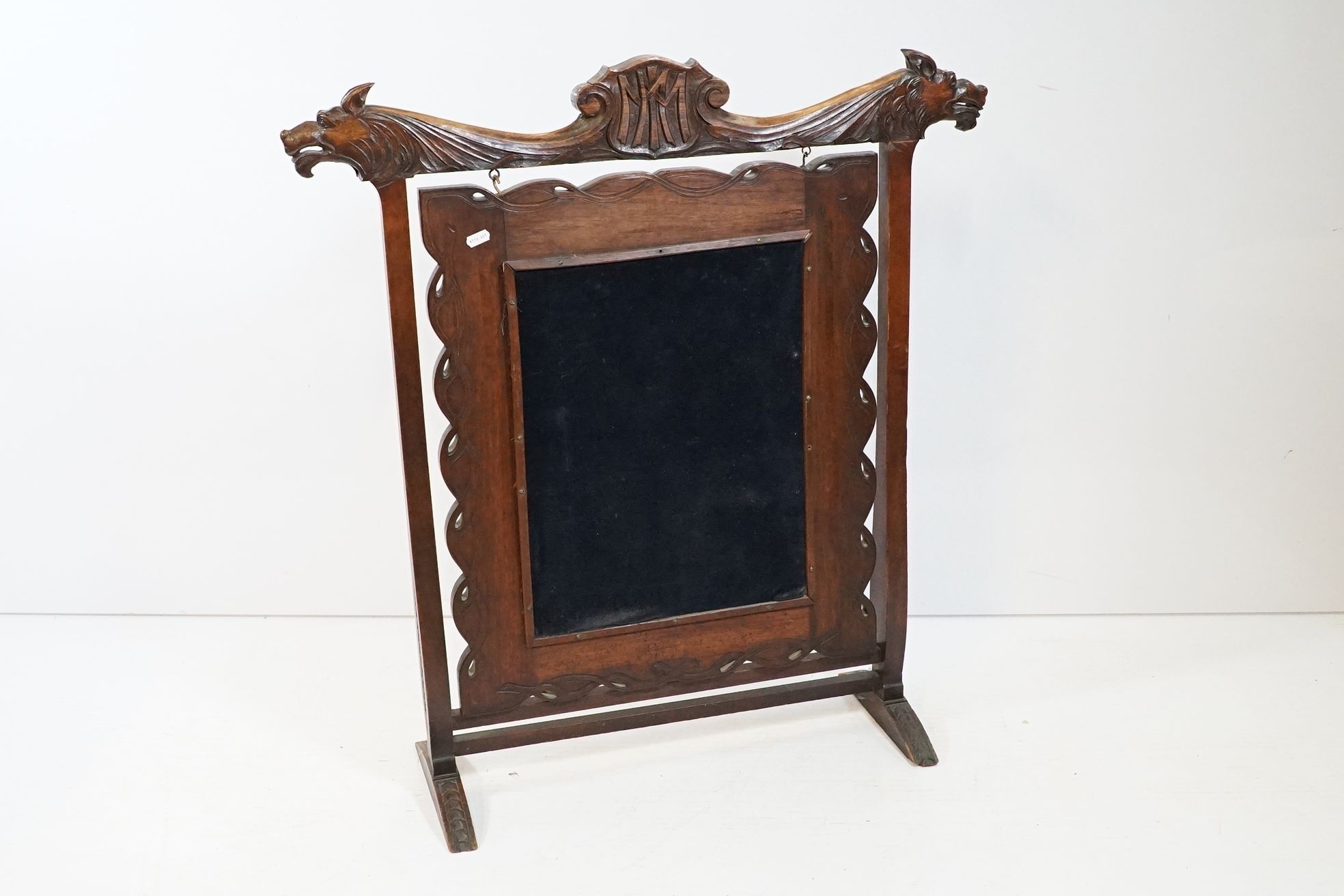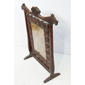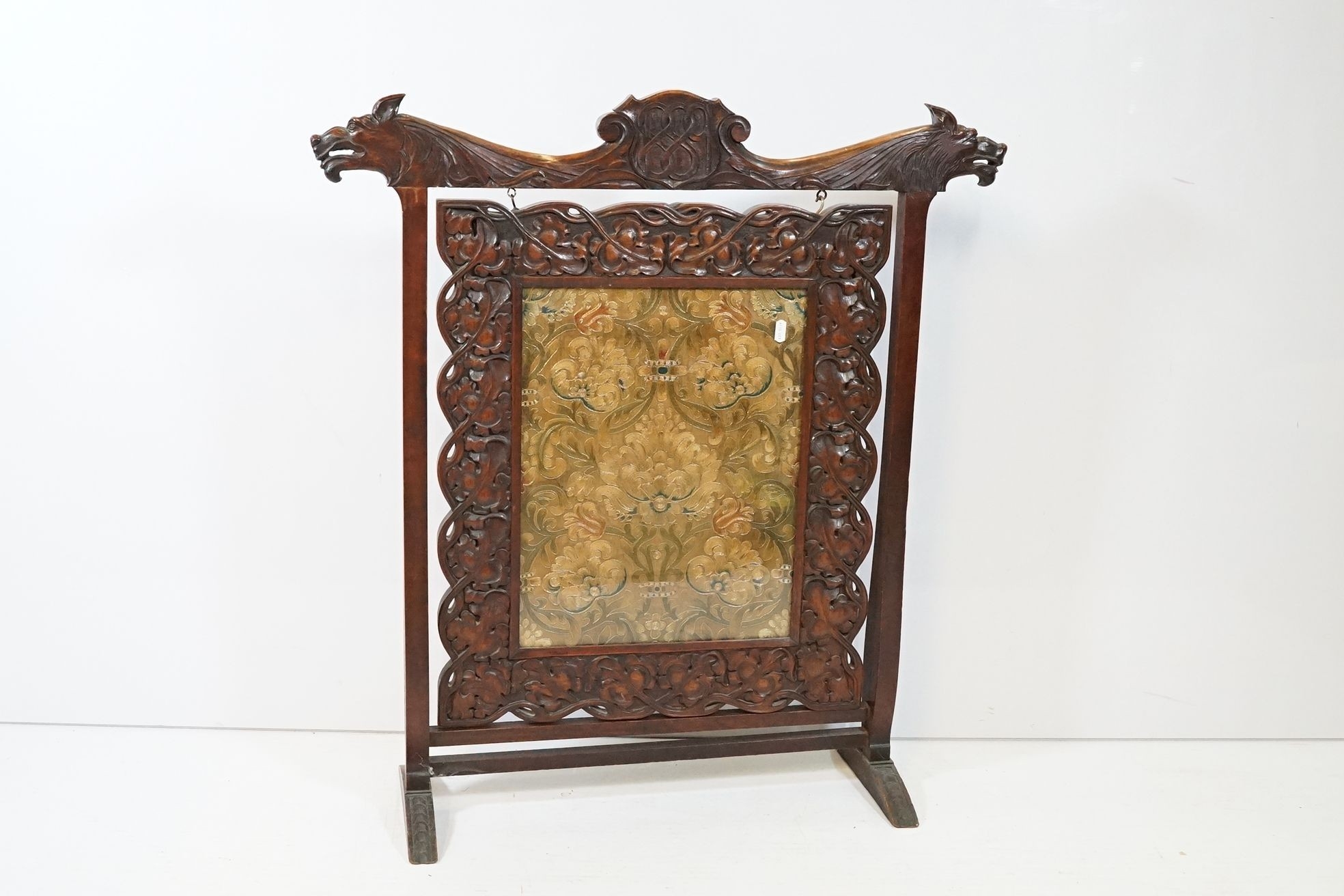 Victorian mahogany framed fire screen, having carved top rail dated 1889 flanked with dogs mask heads upon needlework screen, W 79cm x H 86cm