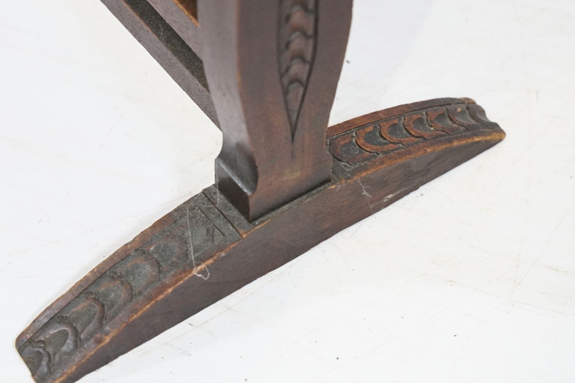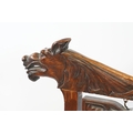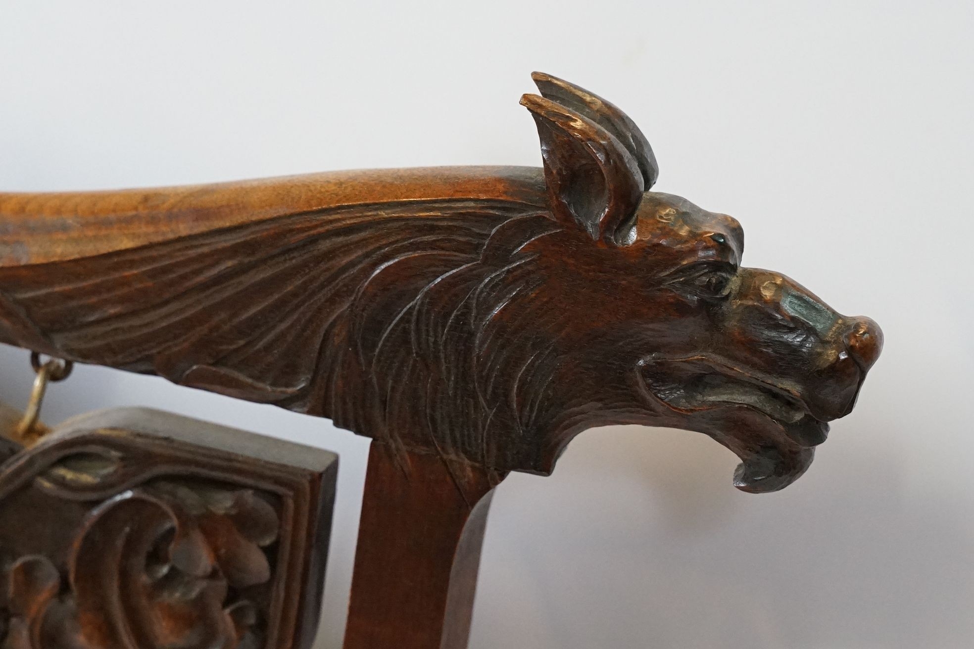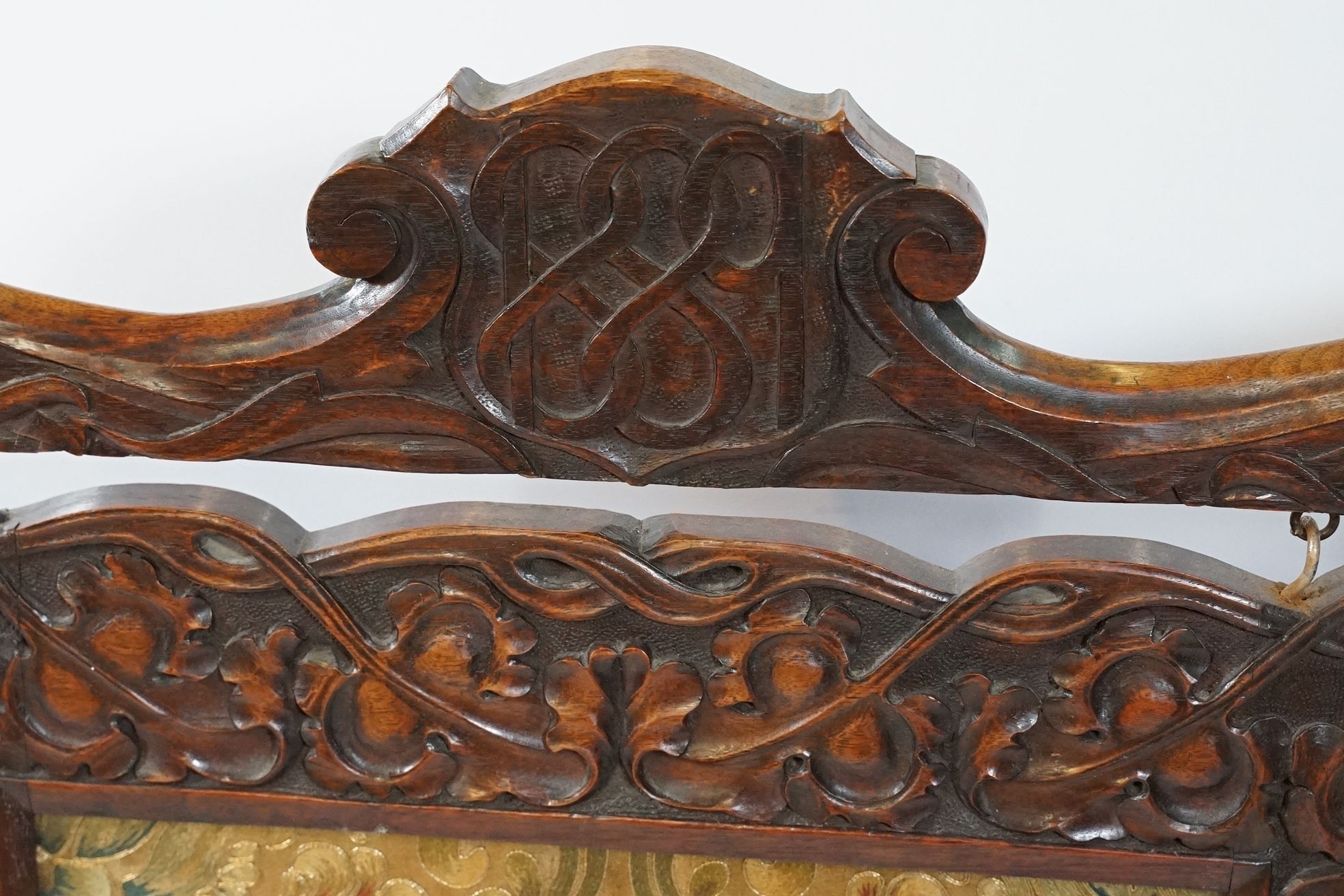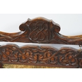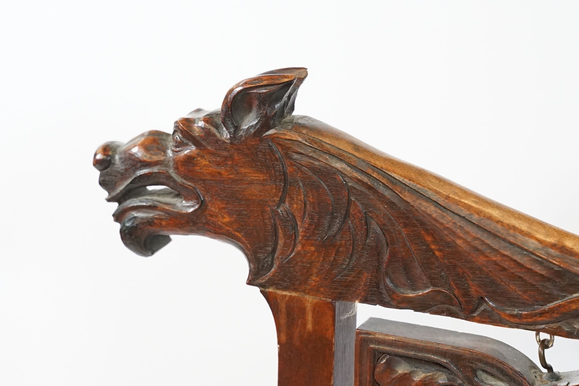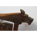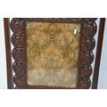 Victorian mahogany framed fire screen, having carved top rail dated 1889 flanked with dogs mask heads upon needlework screen, W 79cm x H 86cm