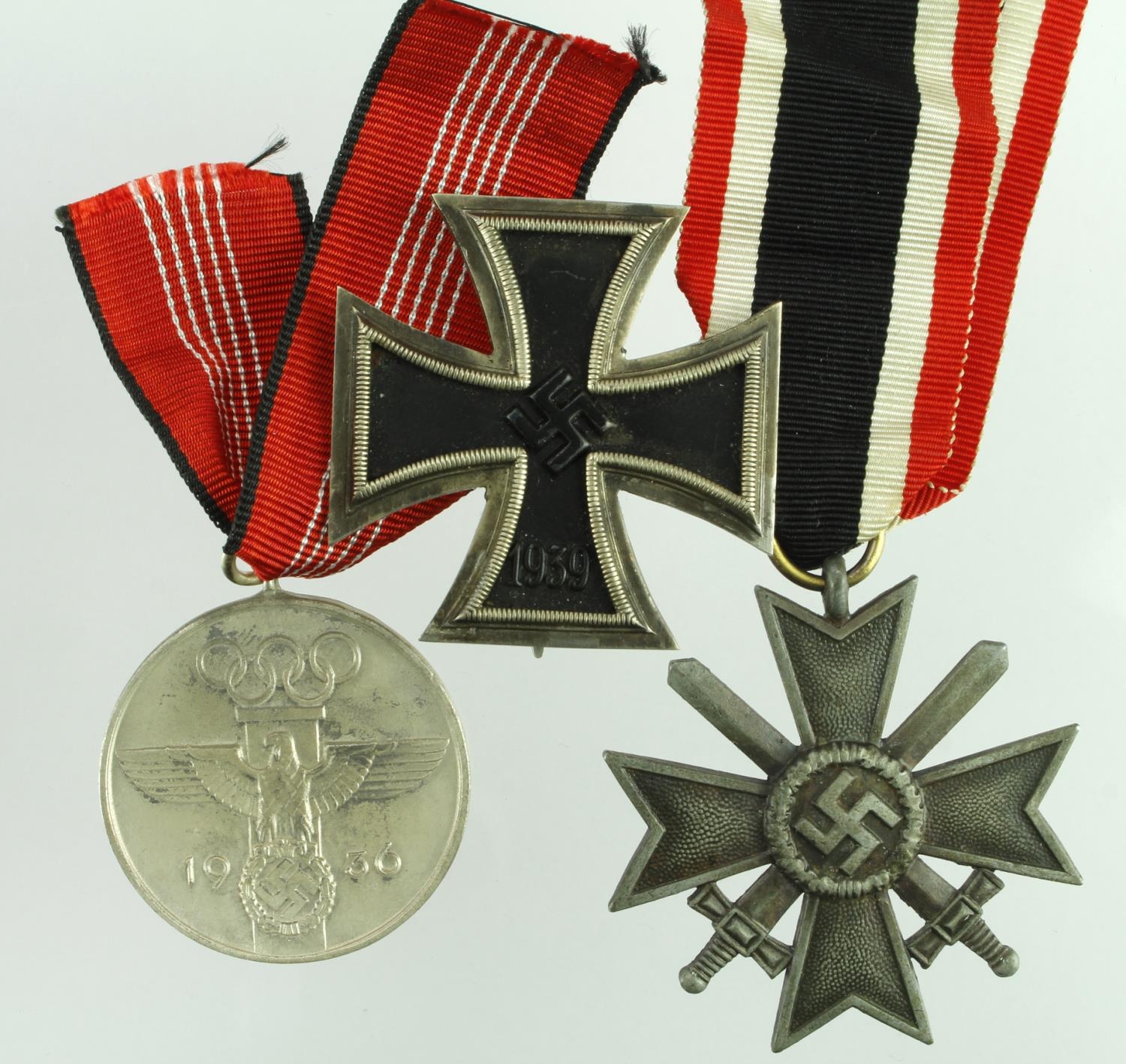 German Nazi Iron Cross 1st Class, 1936 Olympic Games Medal, and War Merit Cross with Swords. (3)