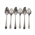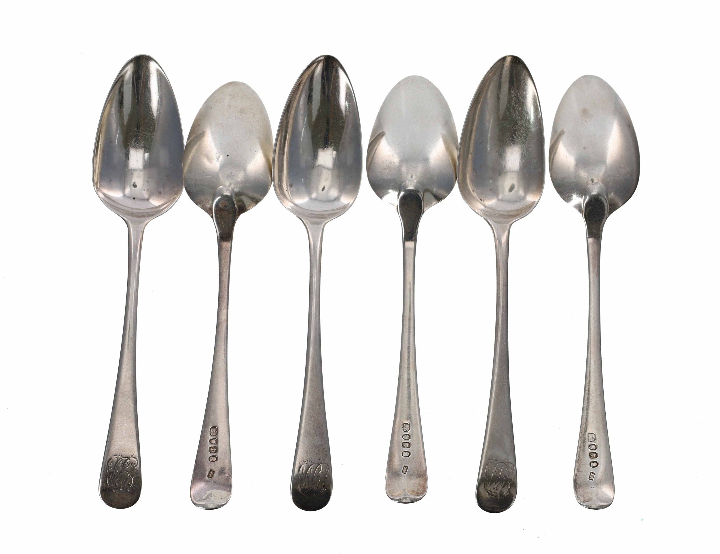 Set of six George III old English pattern silver table spoons, engraved with initials, maker Solomon Hougham, London 1794, 331gm total
