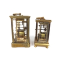 Large carriage clock timepiece stamped with the Richard & Co trademark logo on the back plate, the dial signed John Hall & Co., Manchester, within a foliate engraved corniche brass case, 6.75" high, with outer Morocco travelling case; also another a smaller carriage timepiece, 6" high, key (2)