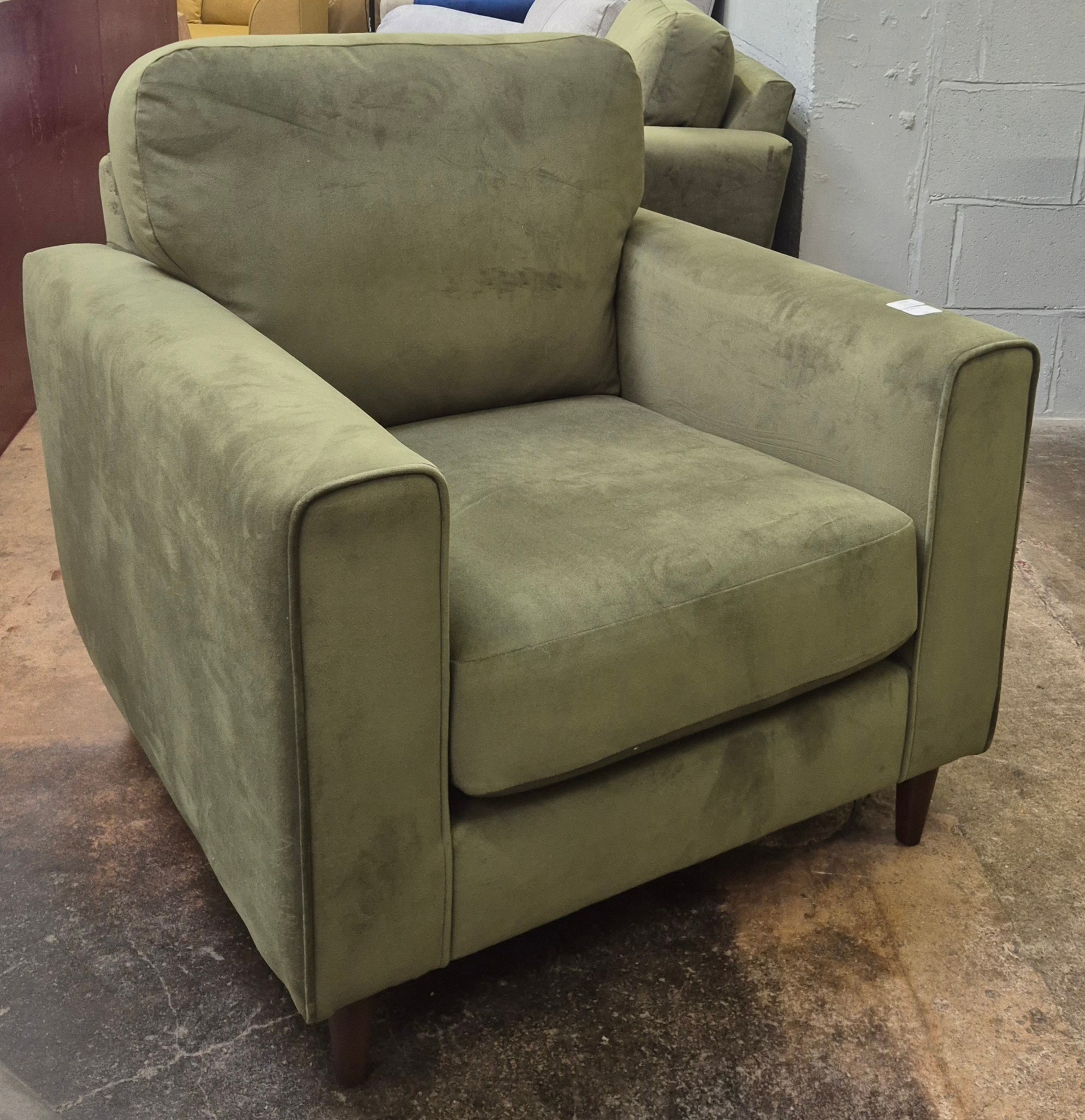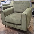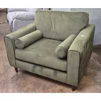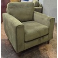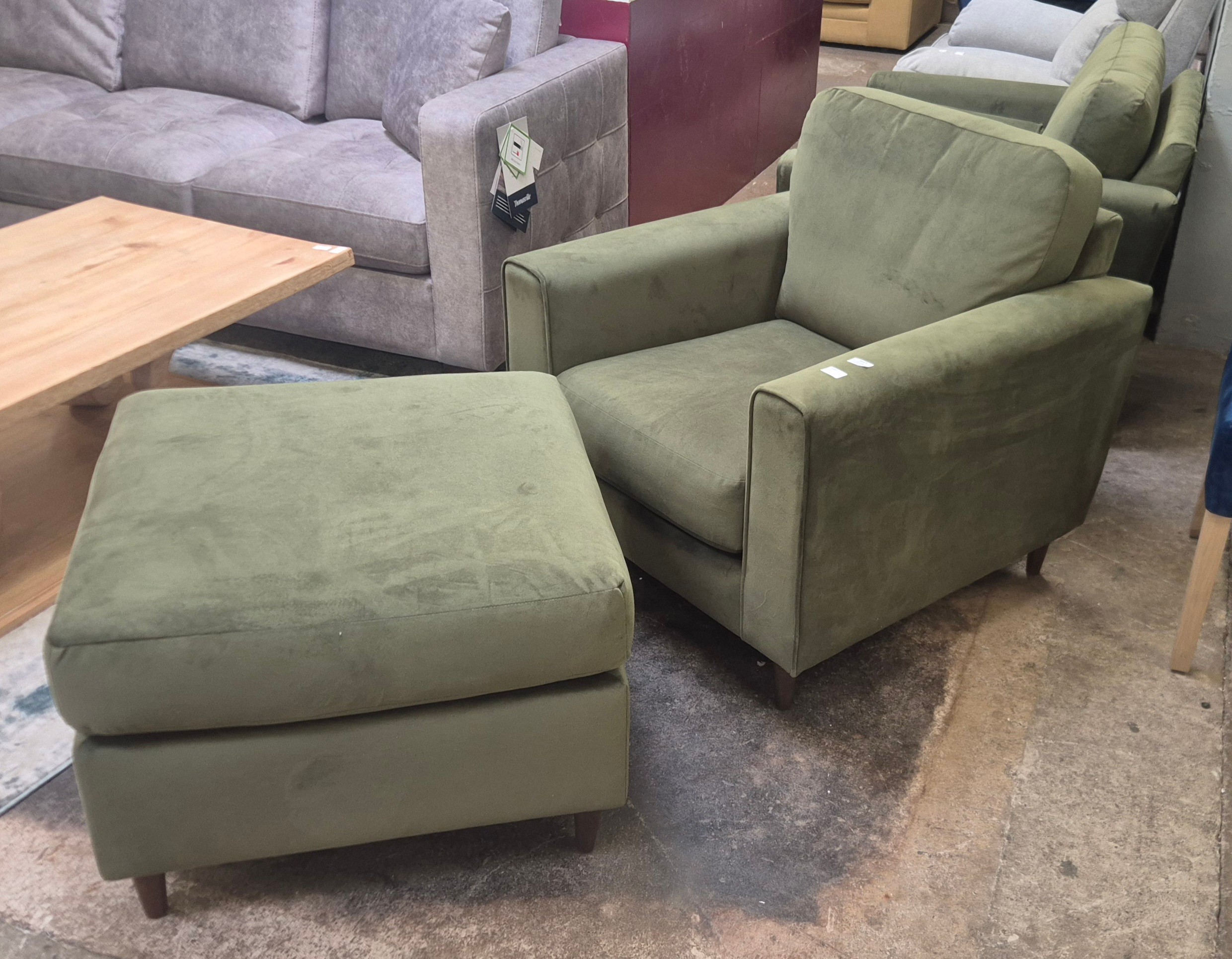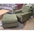 A moss green velvet upholstered armchair and matching pouffe