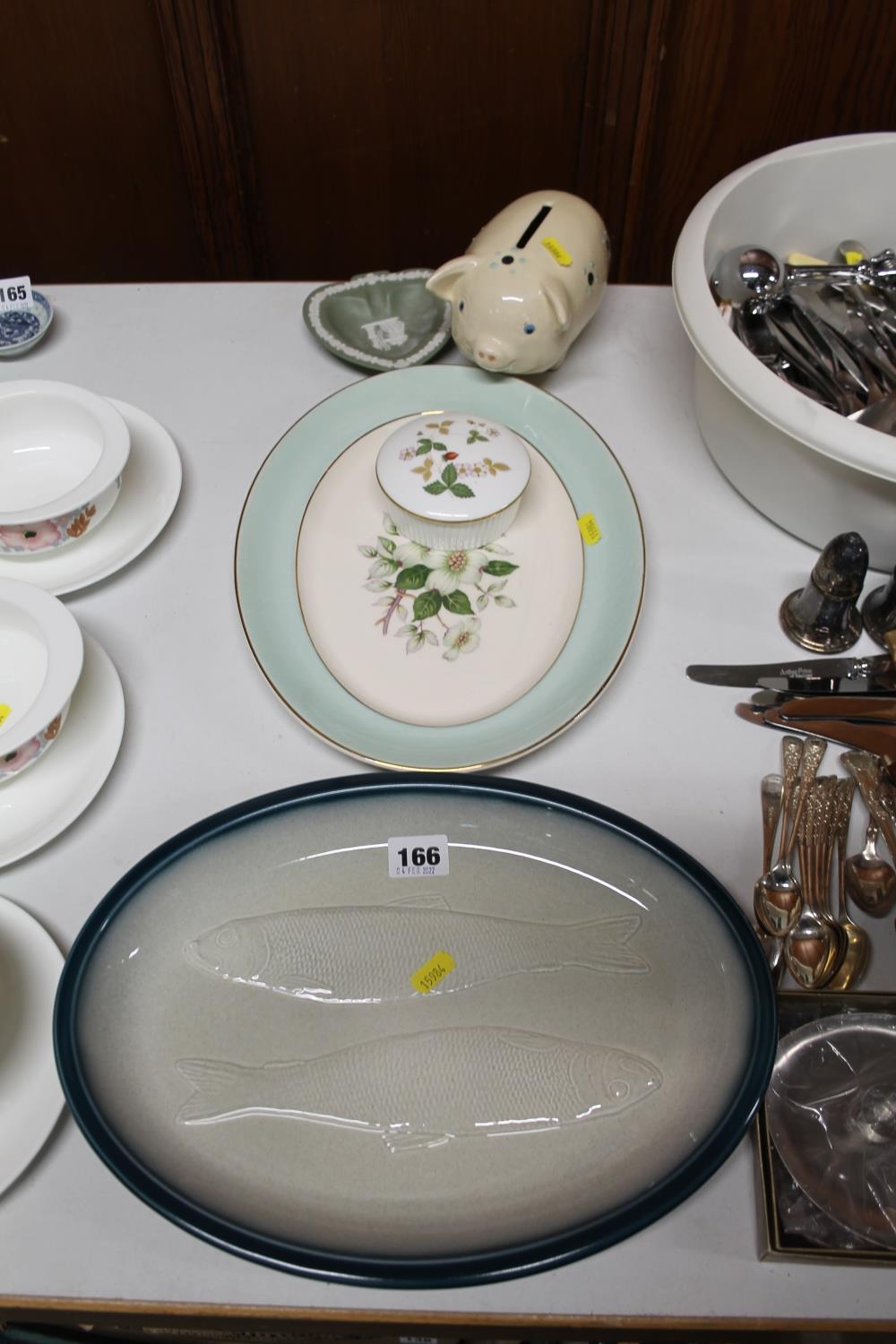 Wedgwood fish dish, a trinket dish, a box and cover, a piggy bank, floral decorated serving dishes, etc.