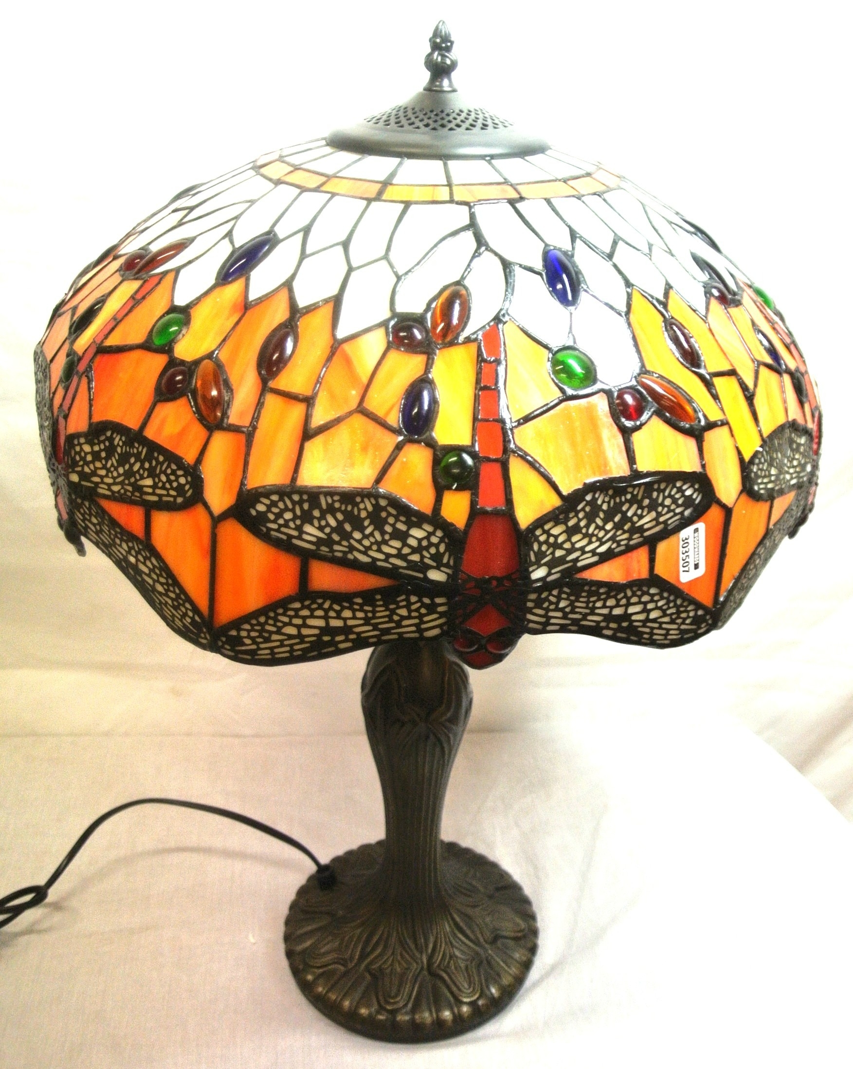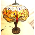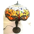 Art deco style electric lamp with multi-coloured butterfly decorated shade, baluster shaped bronzed base