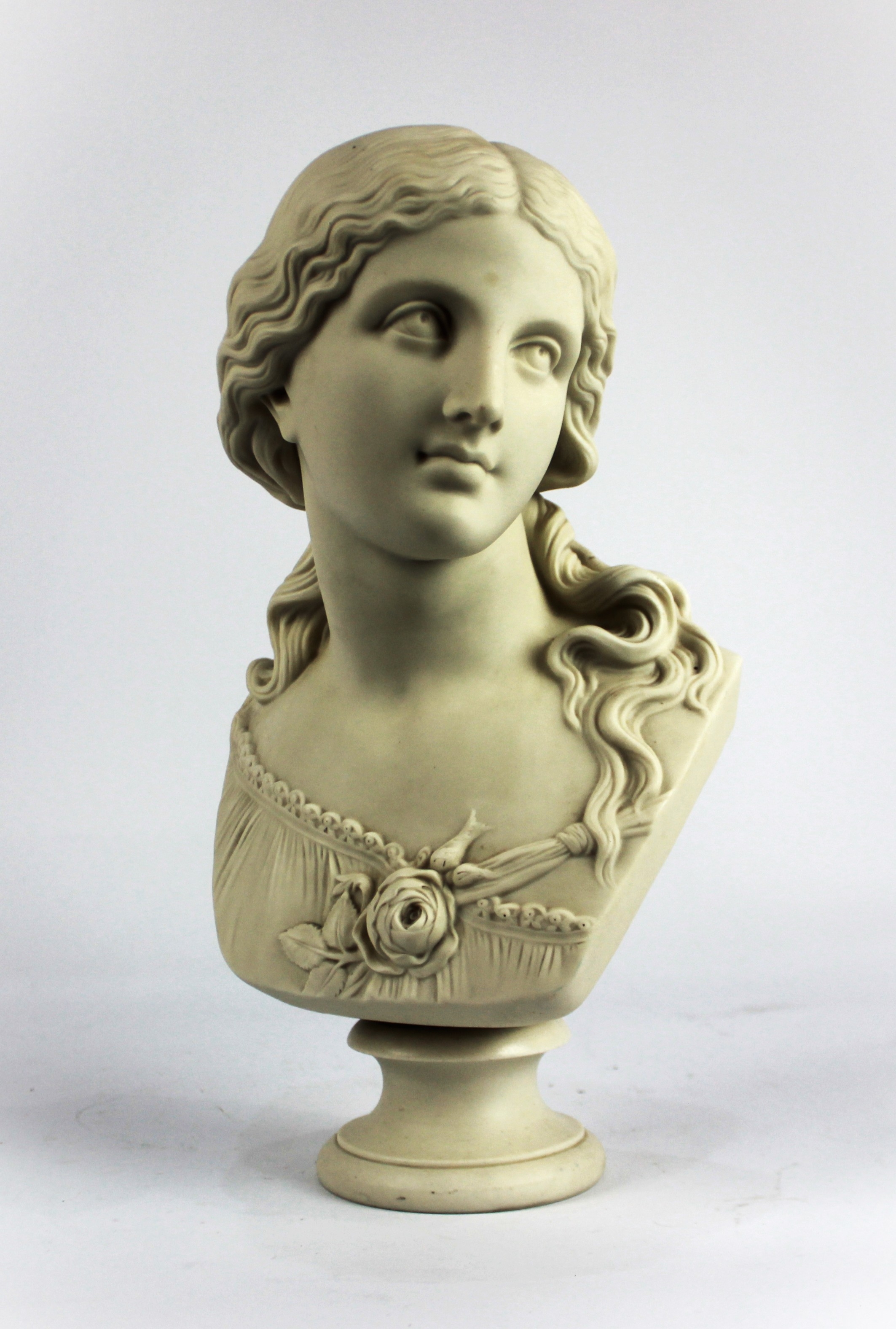 A Copeland parian ware bust of a female figure, after R. Monti, bearing impressed signature and impressed marks to back 'Ceramic and Crystal Palace Art Union', height 35cm