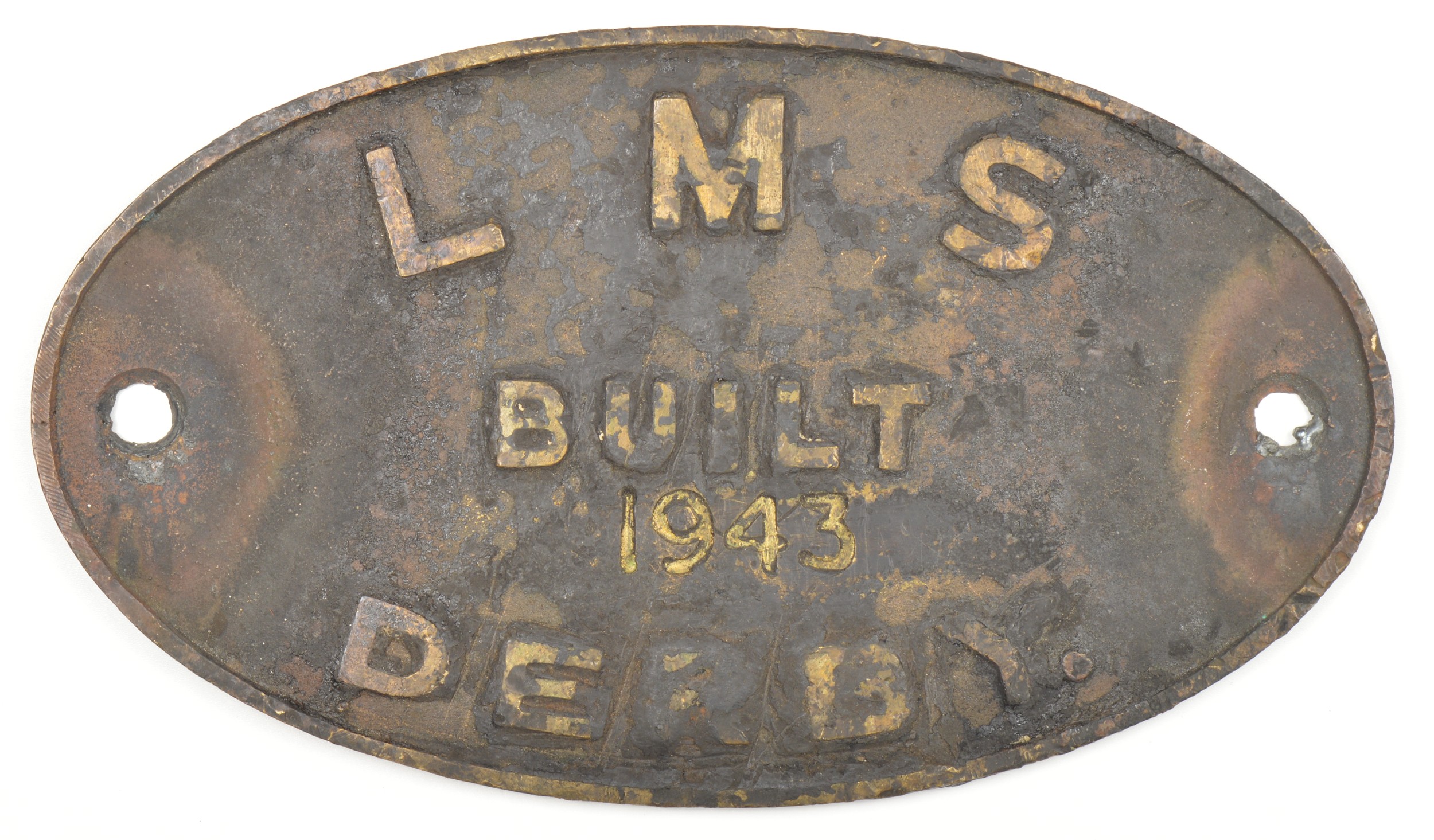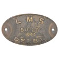 Worksplate, LMS BUILT DERBY 1943. Locomotives built that year were 2 Stanier 4P 2-6-4Ts and 20 Stanier 5MT 4-6-0s. Cast brass with engraved date. Ex loco condition 10 3/8 x 5 15/16 inches. Shipping band - B.