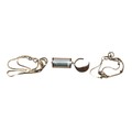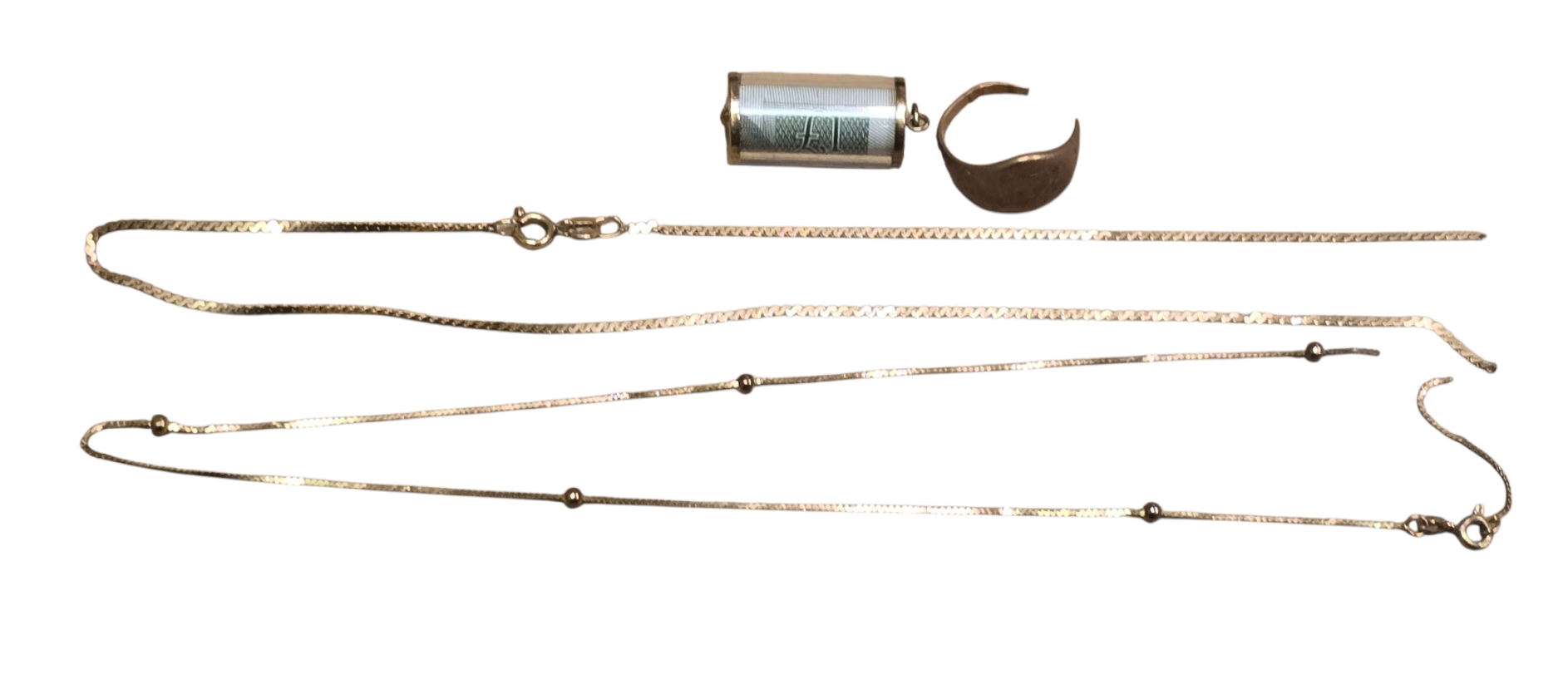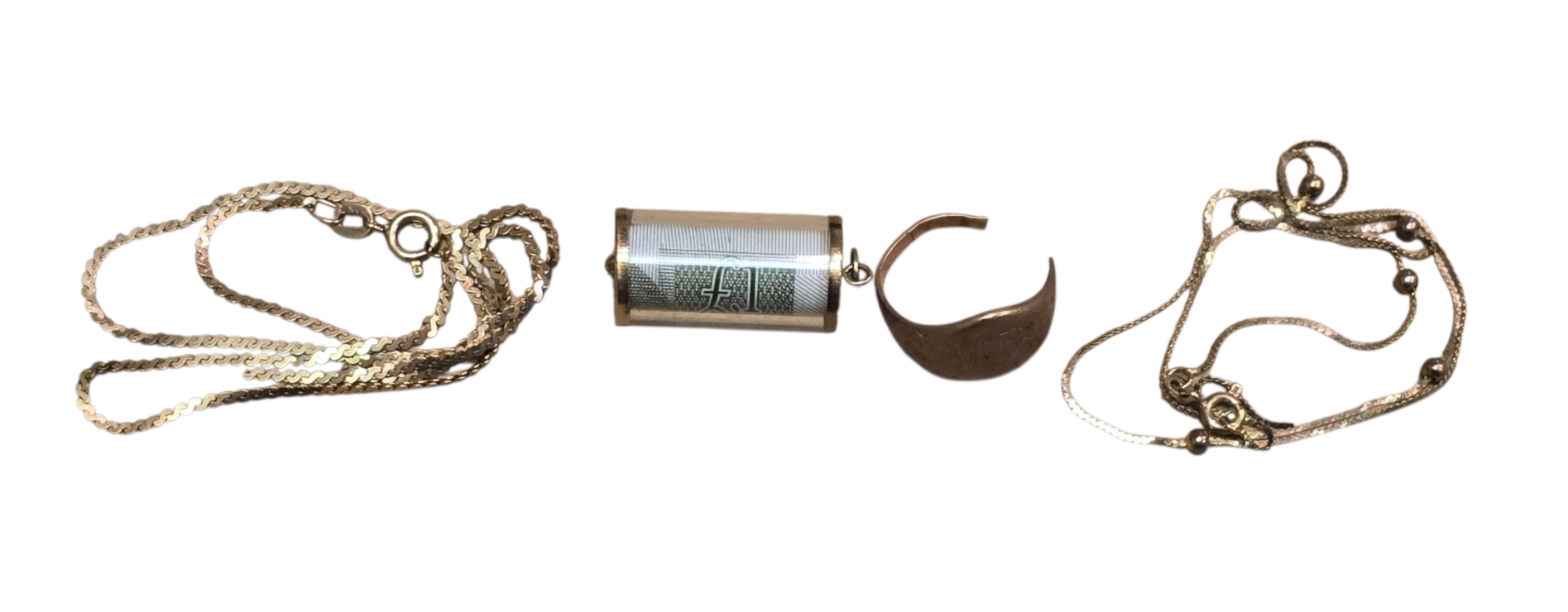 A 9ct gold cylindrical pendant containing a rolled Bank of England £1 note, together with two 9ct gold necklaces and a 9ct gold ring. (AF)