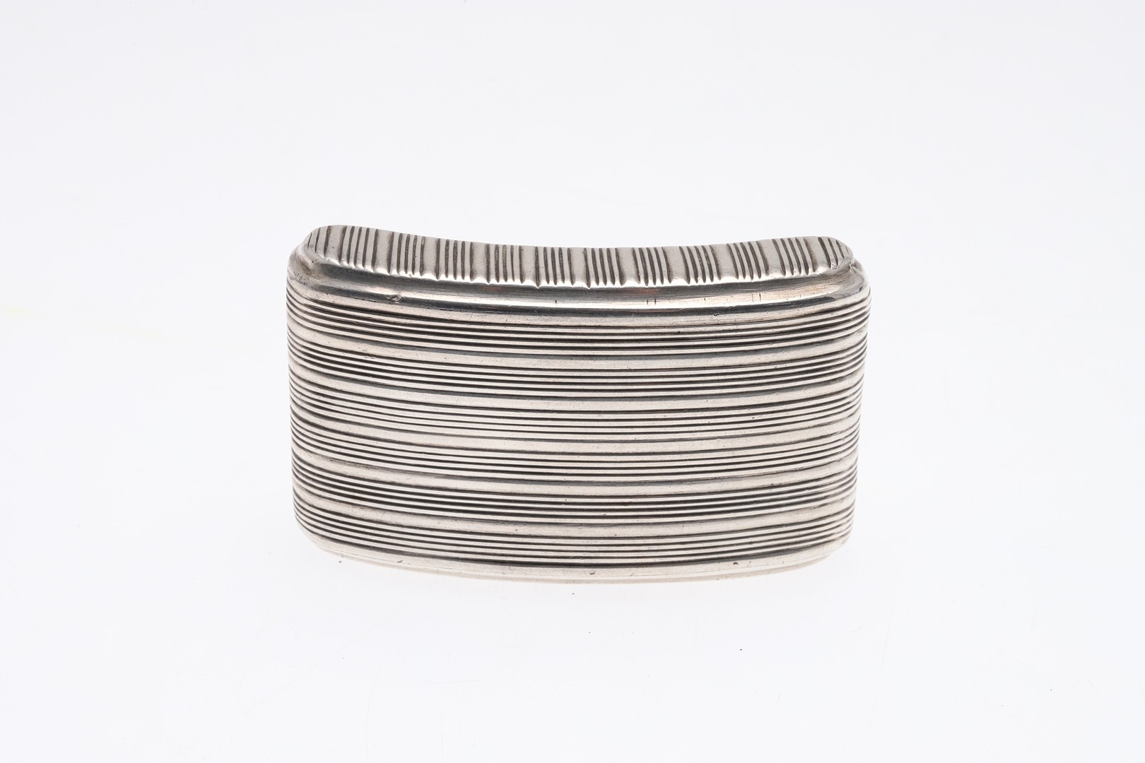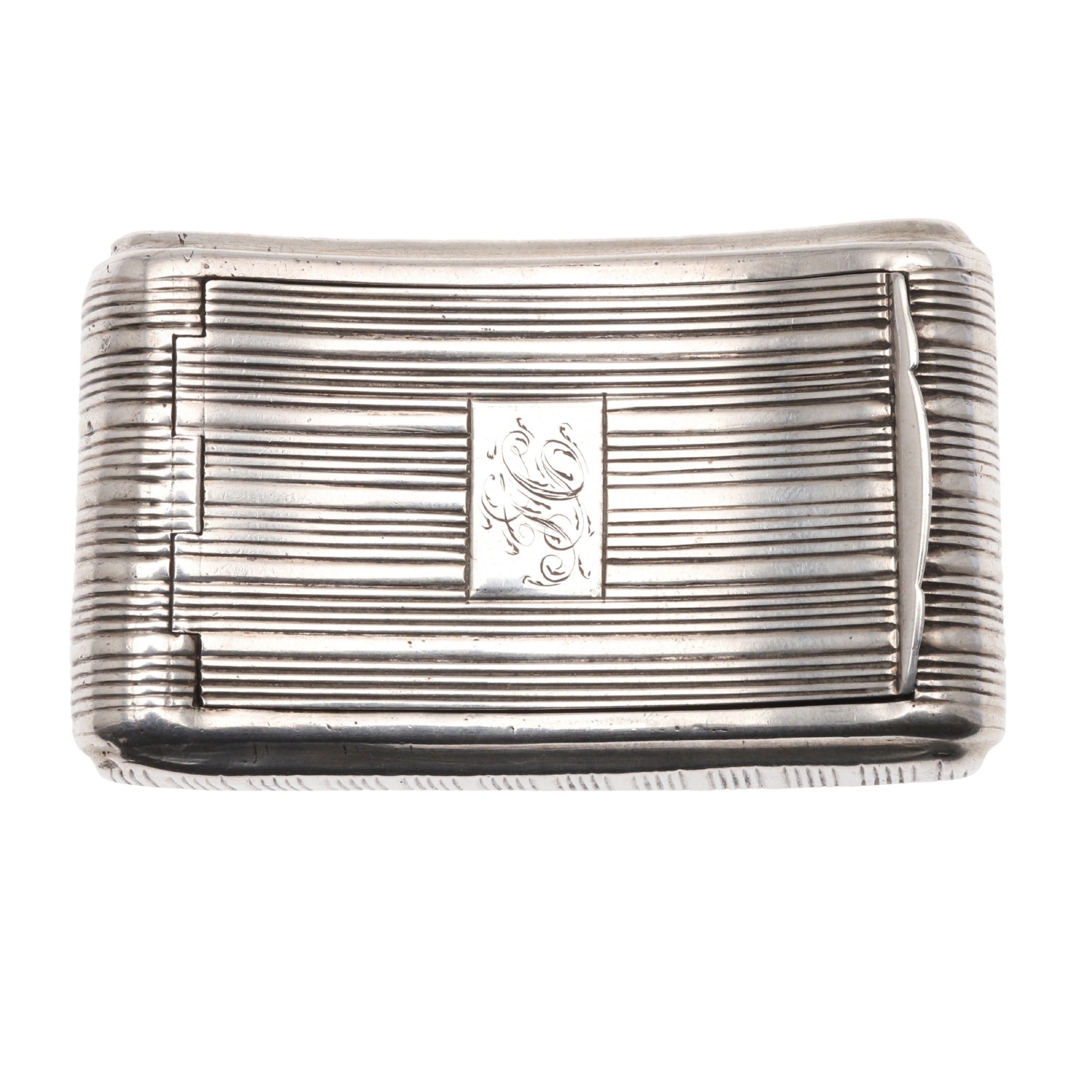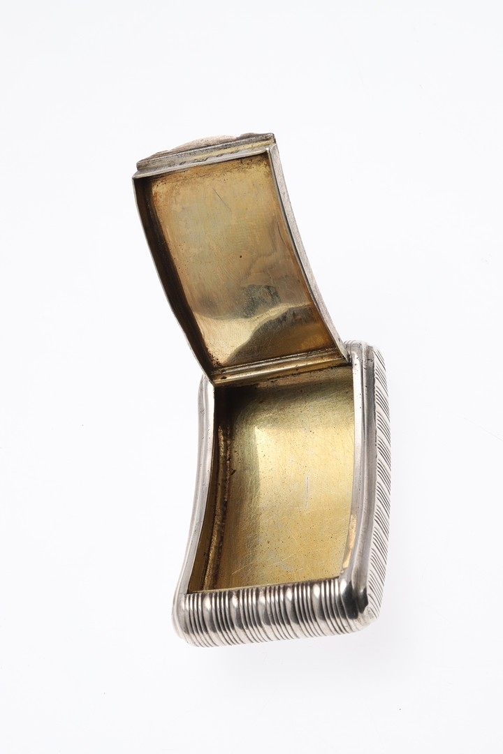 A GEORGE III SILVER SNUFF BOX. Of concave oblong form, with reeded decoration and engraved cartouche, with gilt interior and a hinged lid, by John Shaw, Birmingham, 1813. 7.5cm x 4.5cm, 2.1ozt.