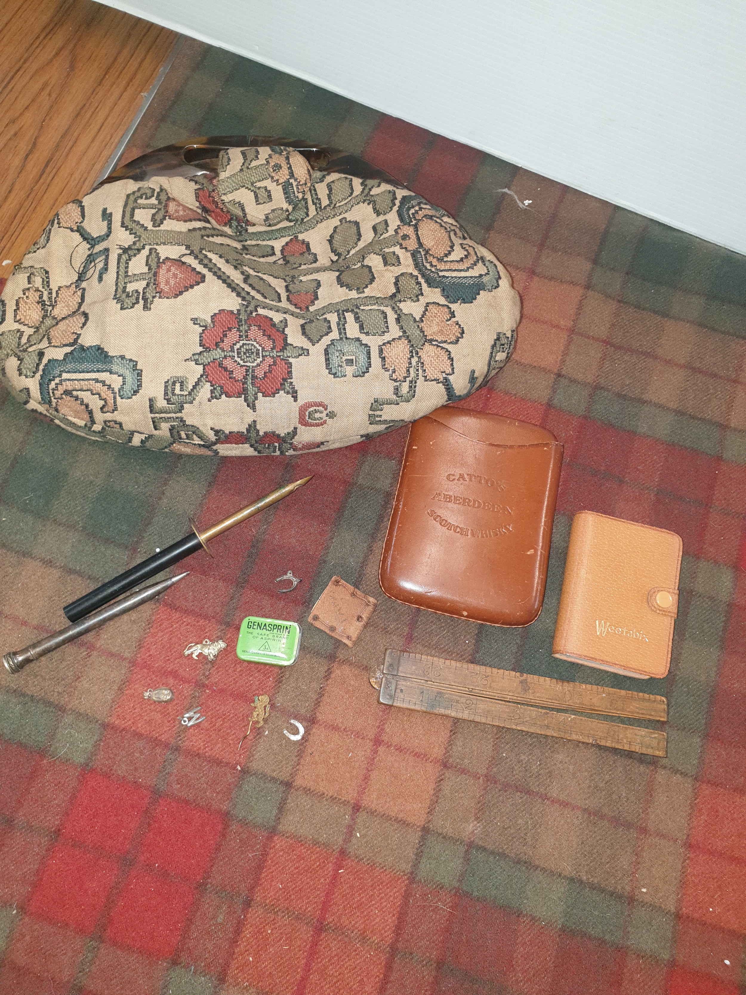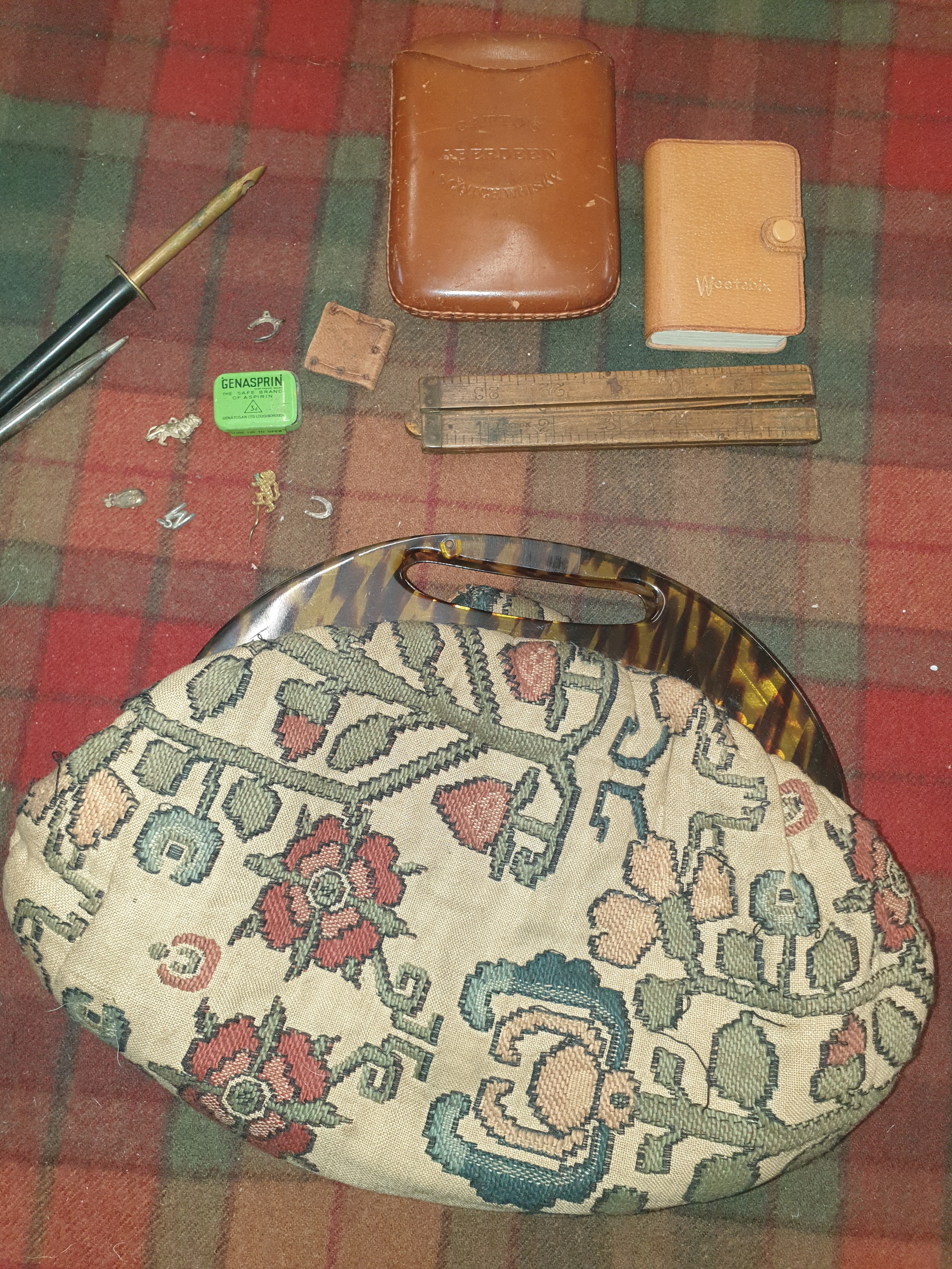 Selection of collectables; 20th century ladies bag with faux handle, box wood four section ruler & other items