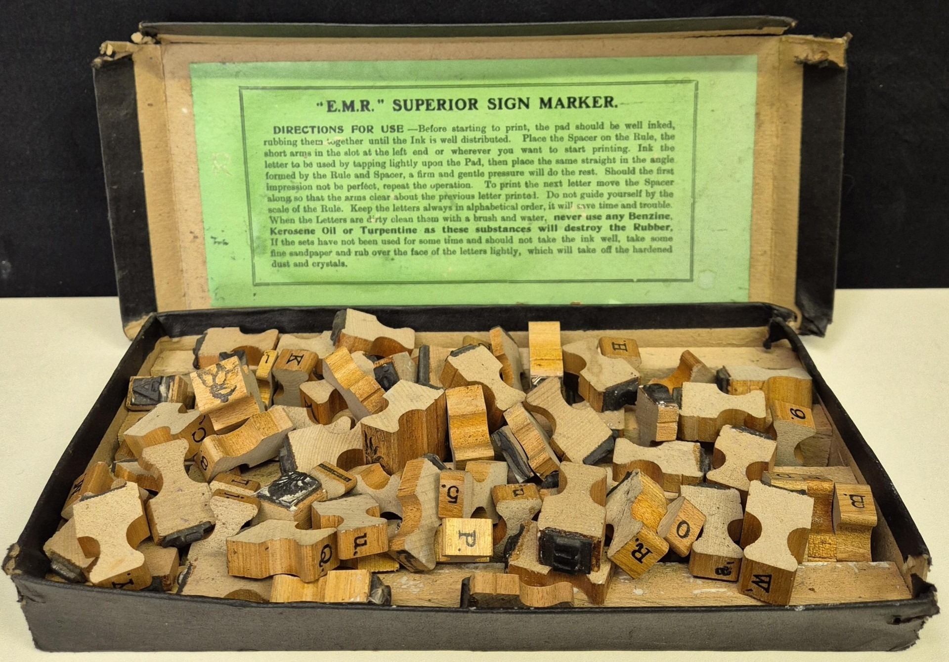 Vintage, boxed E.M.R. Sign Marker Kit, featuring multiple printing blocks.