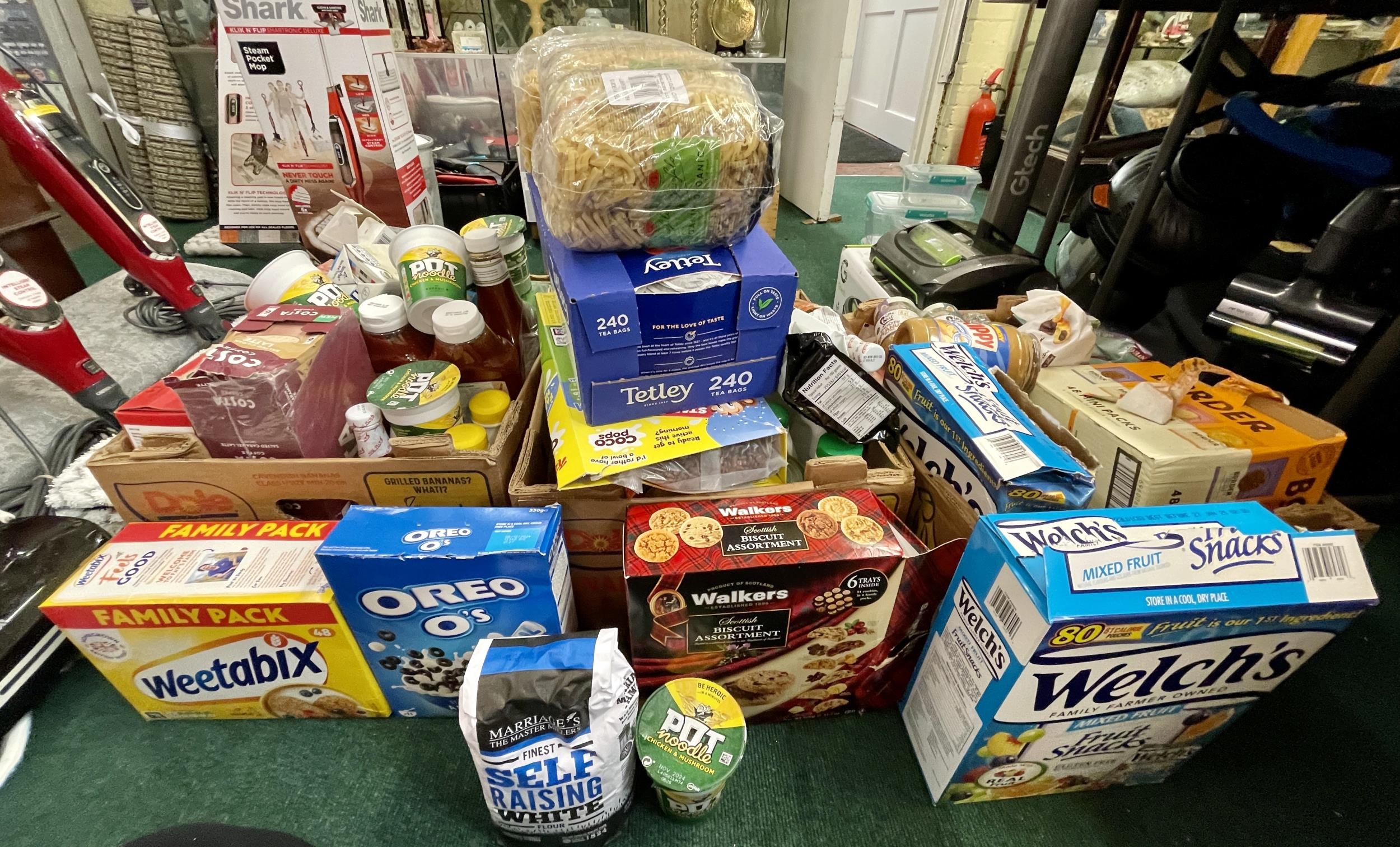 3 X LARGE BOXES OF FOODSTUFFS INC. VARIOUS TEABAGS, POT NOODLES, HEINZ KETCHUP, VARIOUS CEREALS, BISCUITS, PEANUT BUTTER, TINNED TOMATOES, PASTA ETC.