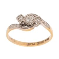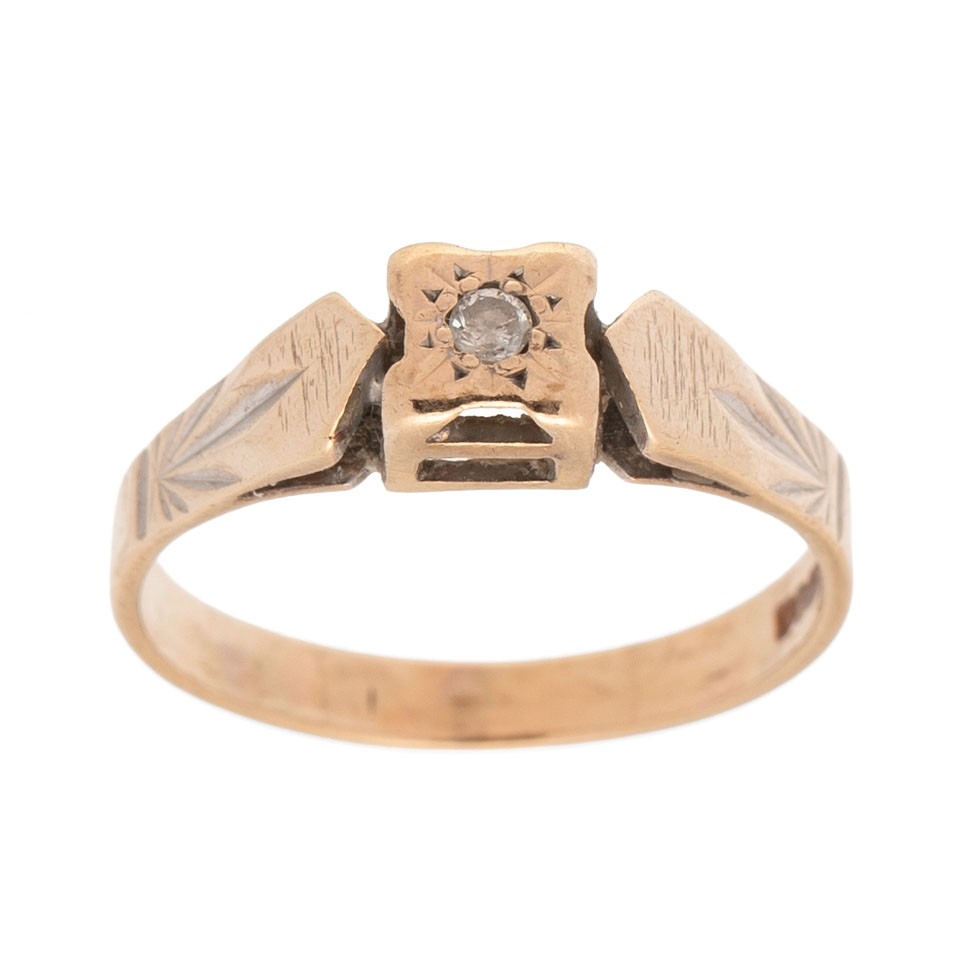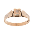 A 9ct gold and diamond ring, with illusion set diamond of approximately 2.0mm diameter, to the central square mount with raised facetted shoulders, ring size O/P, 2.4g.