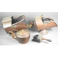 Two Victorian copper coal scuttles together with a copper kettle, coal scoop and tongs.