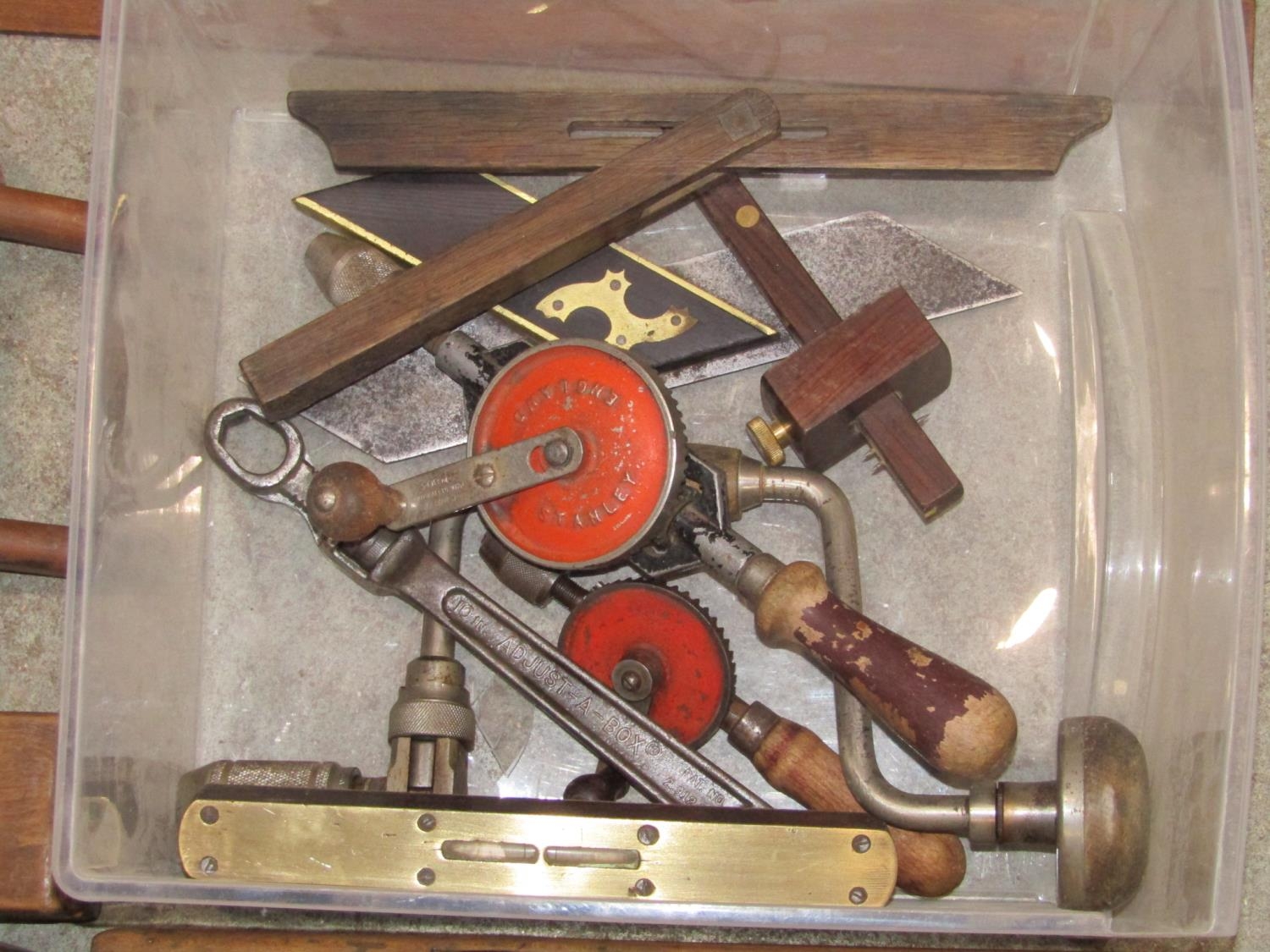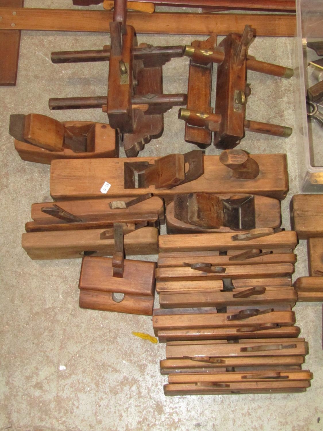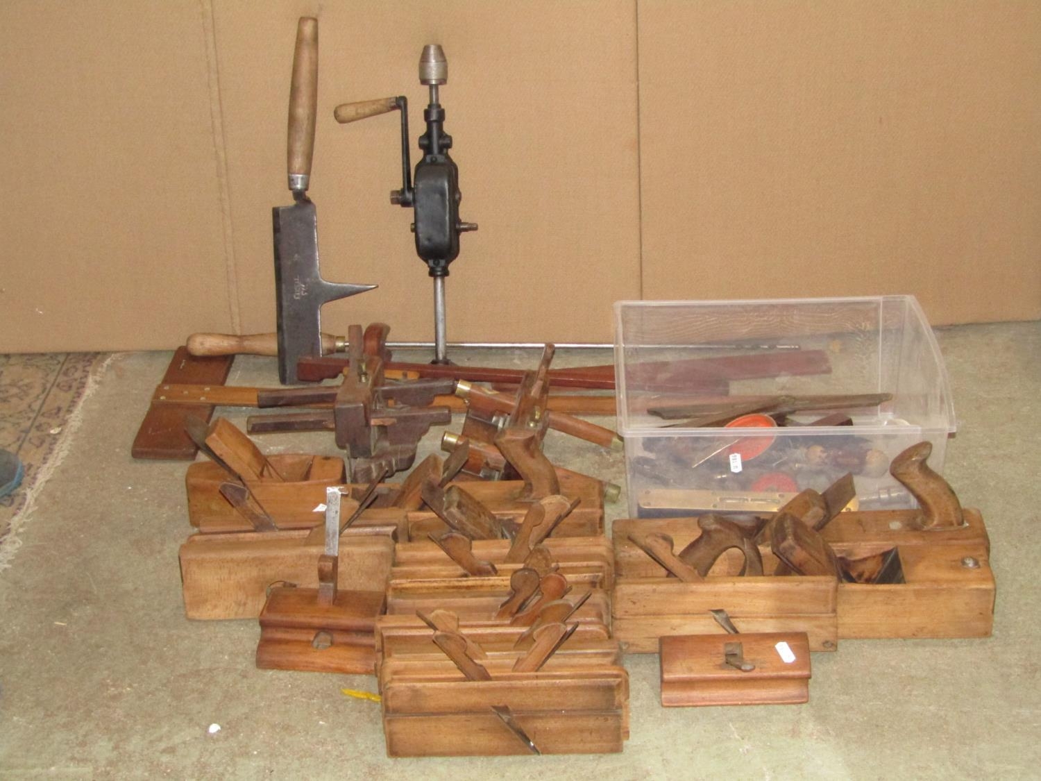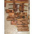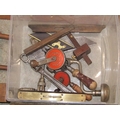 A collection of vintage carpentry tools mainly a variety of planes, square gauges, etc