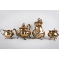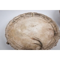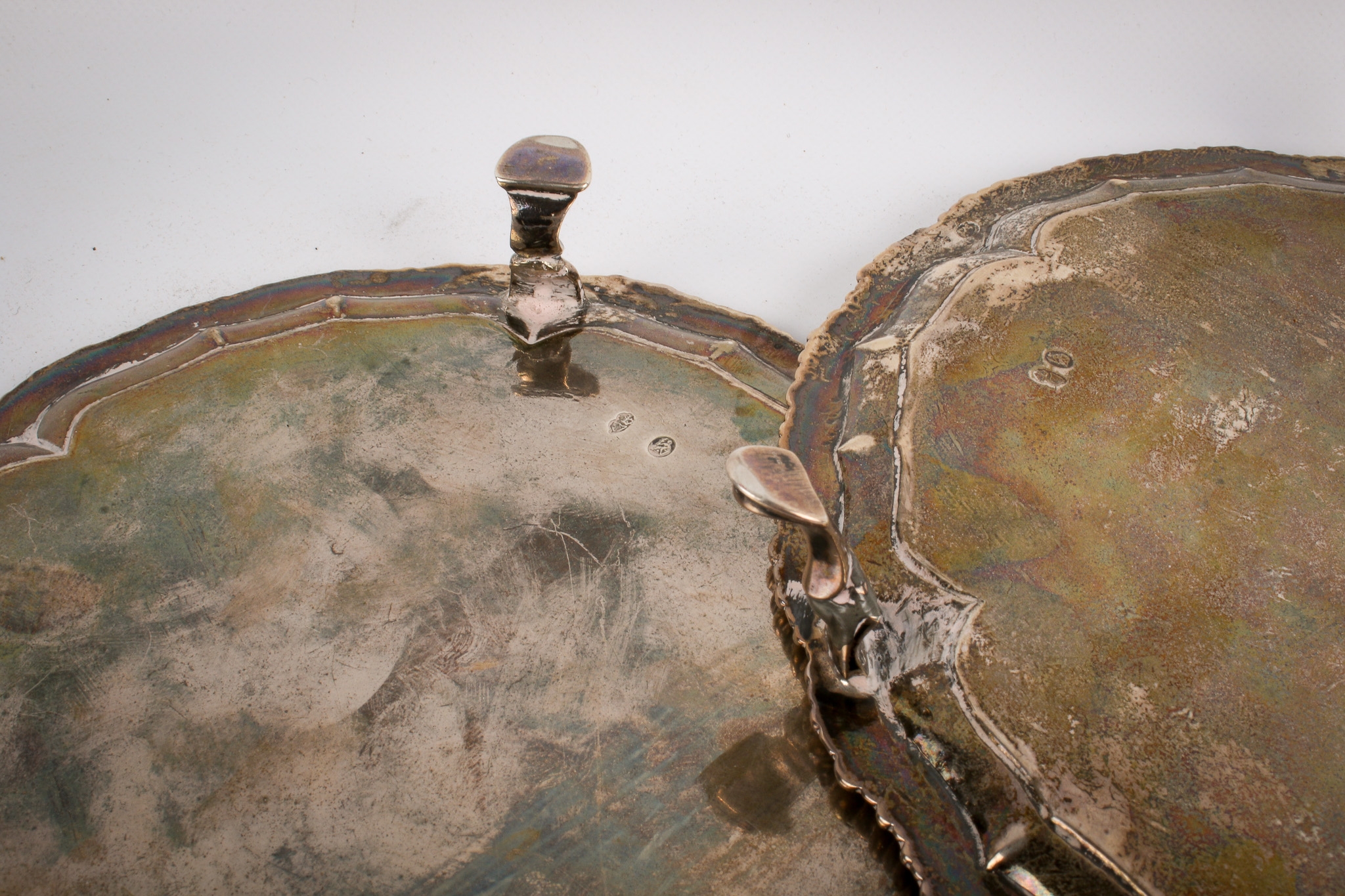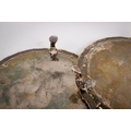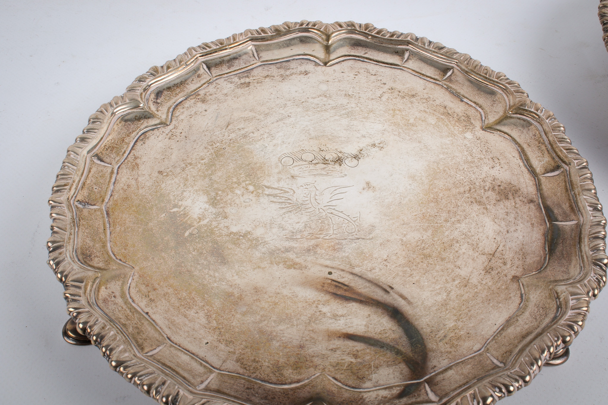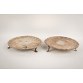A pair of 19th century Irish silver round trays. With shaped rims, central engraved crown over gryphon motif, raised on three short hoof feet. Both with Hibernia and harp marks to base, rubbed maker's mark to rim, diameter 18.2cm, gross weight 642.5g.