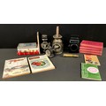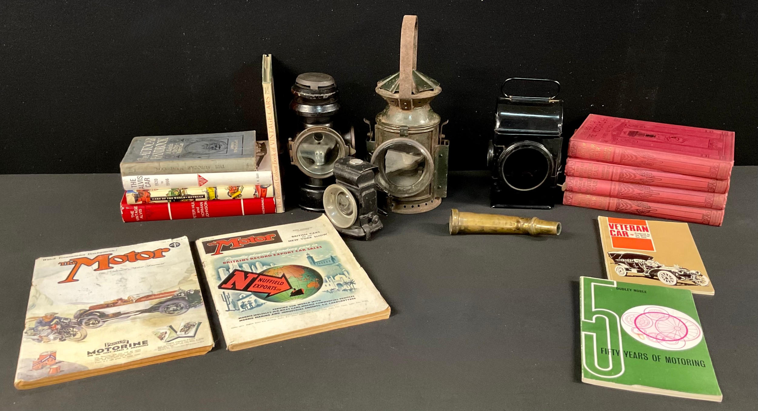 An early 20th century Dekla black painted metal vehicle tail lamp, 22cm high; a mid 20th century railway lamp; other vehicle lamps; a brass Liqall petrol filler; a collection of motor vehicle reference books/handbooks, qty