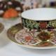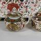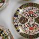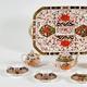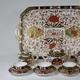 A CROWN DERBY PORCELAIN CABERET SET, 1884, printed and overpainted in the Imari palette with pattern No.198, and comprising octagonal teapot, sugar basin and milk jug all with lift off covers with pierced scroll knops, four tea cups and saucers and a canted oblong tray with lug handles, painted marks in blue, tray 19" wide (Illustrated)