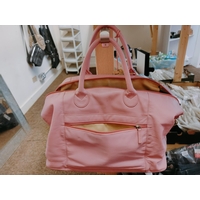 Lovely bright red multi compartment back pack together with a bright navy blue, orange and pink shoulder bag