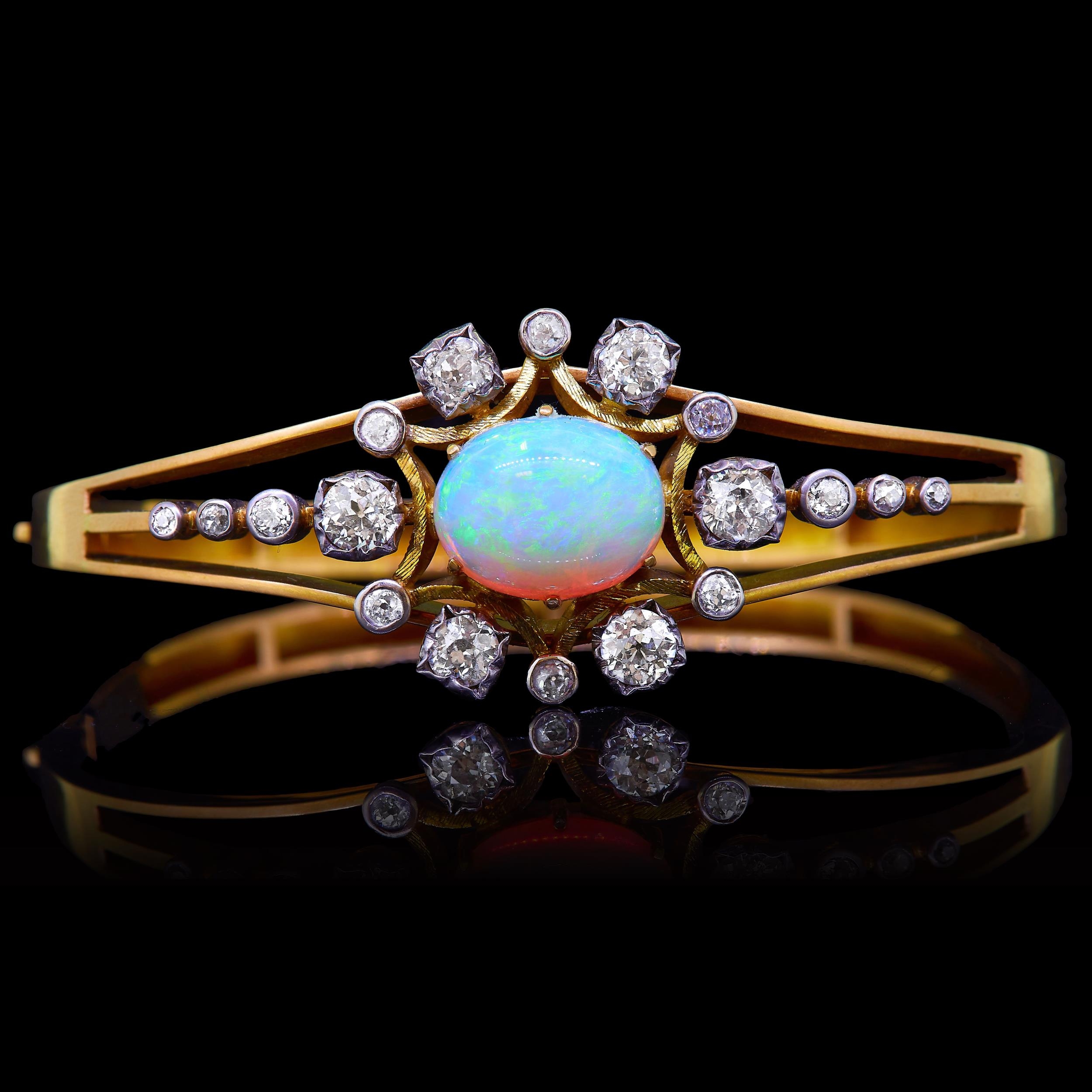 IMPORTANT OPAL AND DIAMOND BINGED BANGLE, set to the center of the top with a cabochon cut oval opal, surrounded by diamonds and diamonds on the shoulders totalling approx. 2.60 ct. Inner diam. 5.8 cm. 31.3 grams.