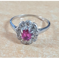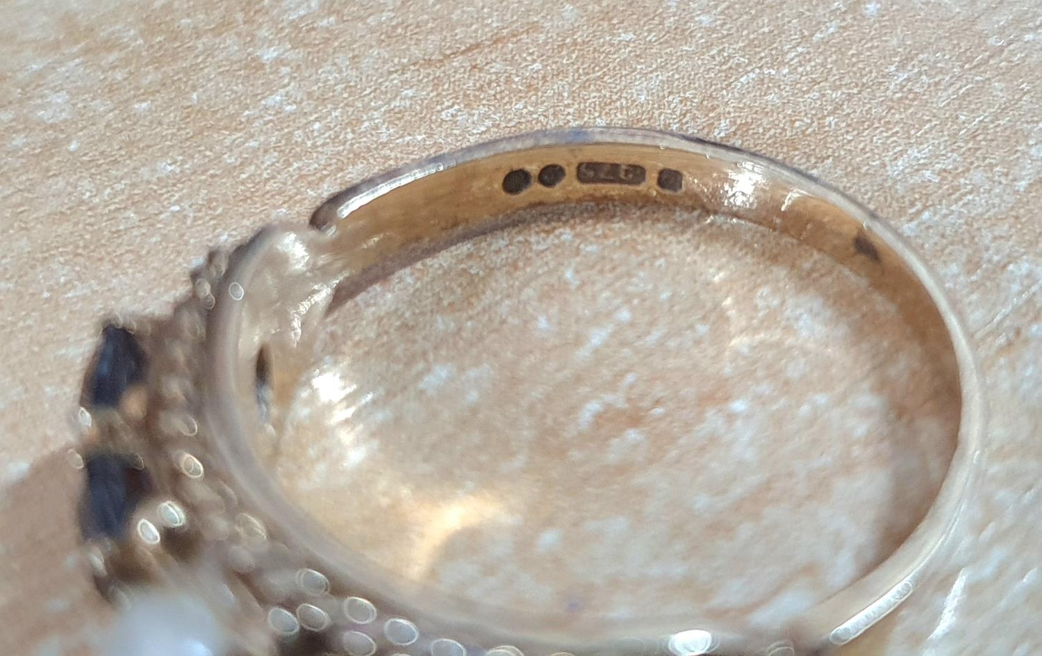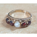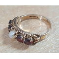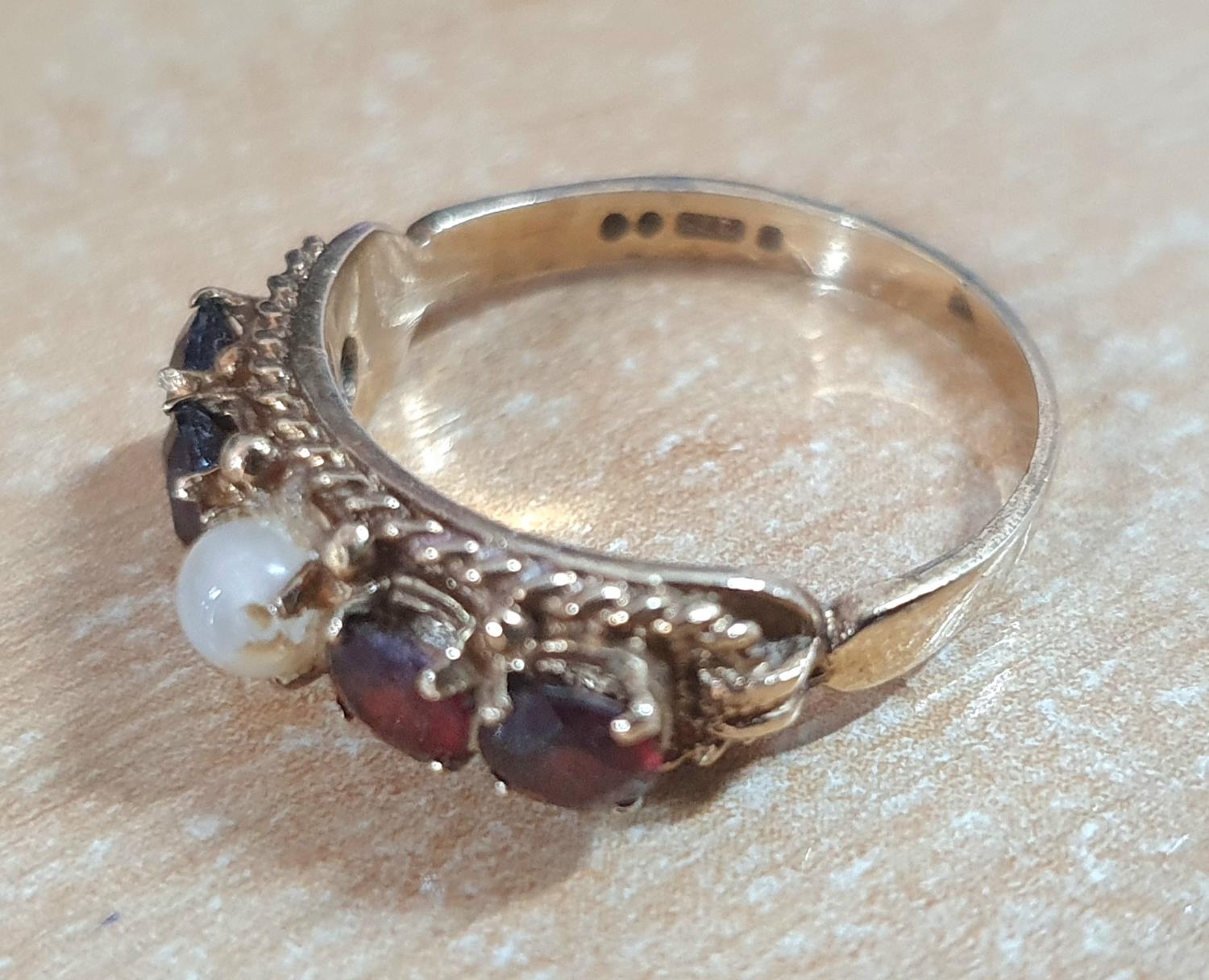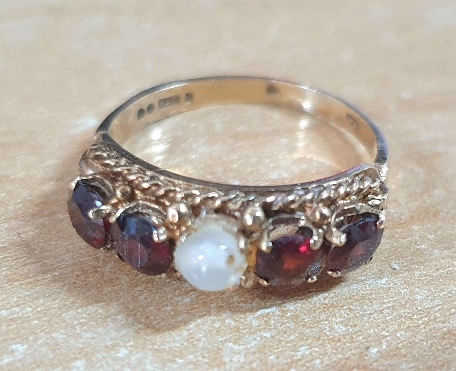9ct Rose gold ring with central pearl flanked by 2 Garnets to either side,