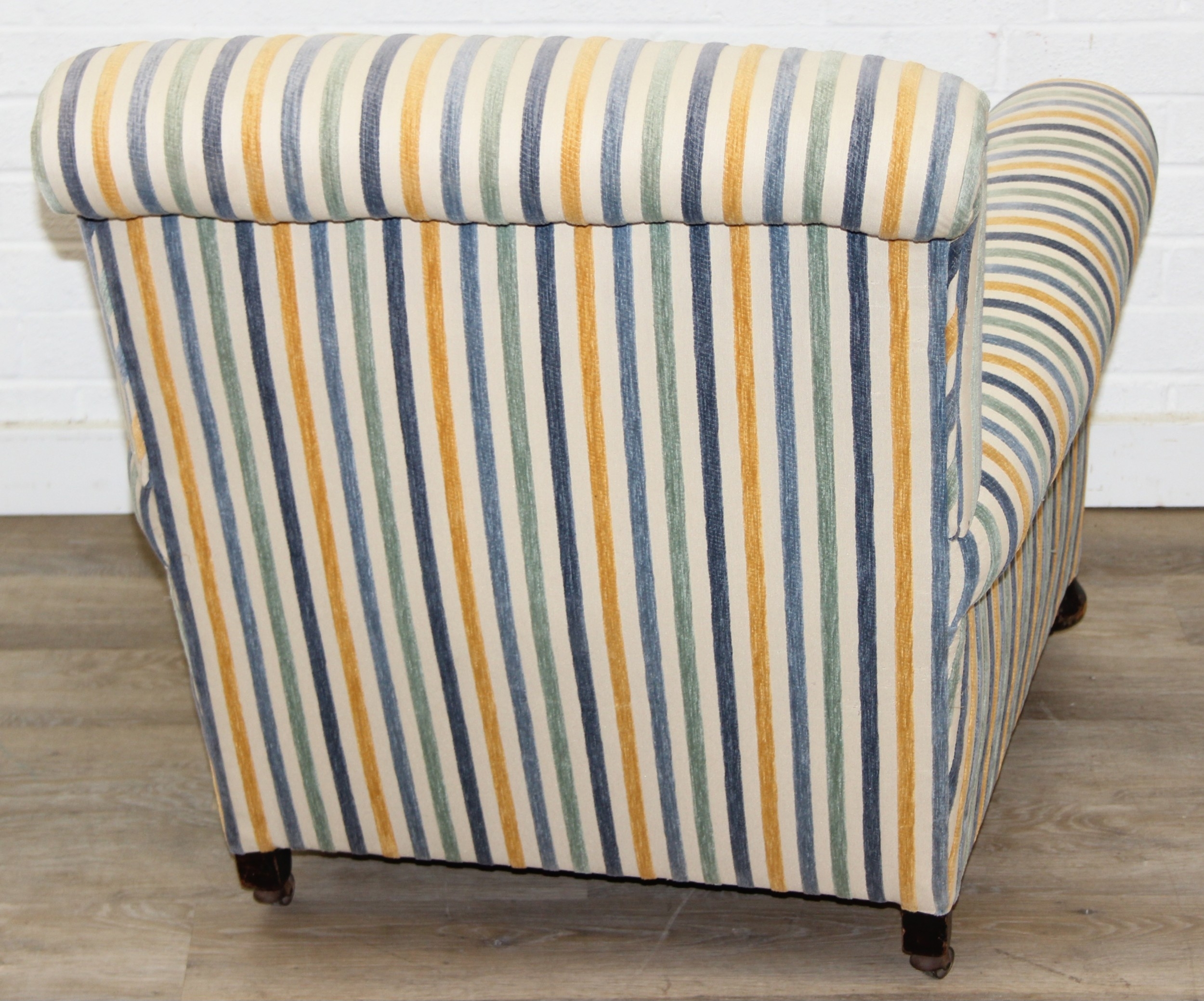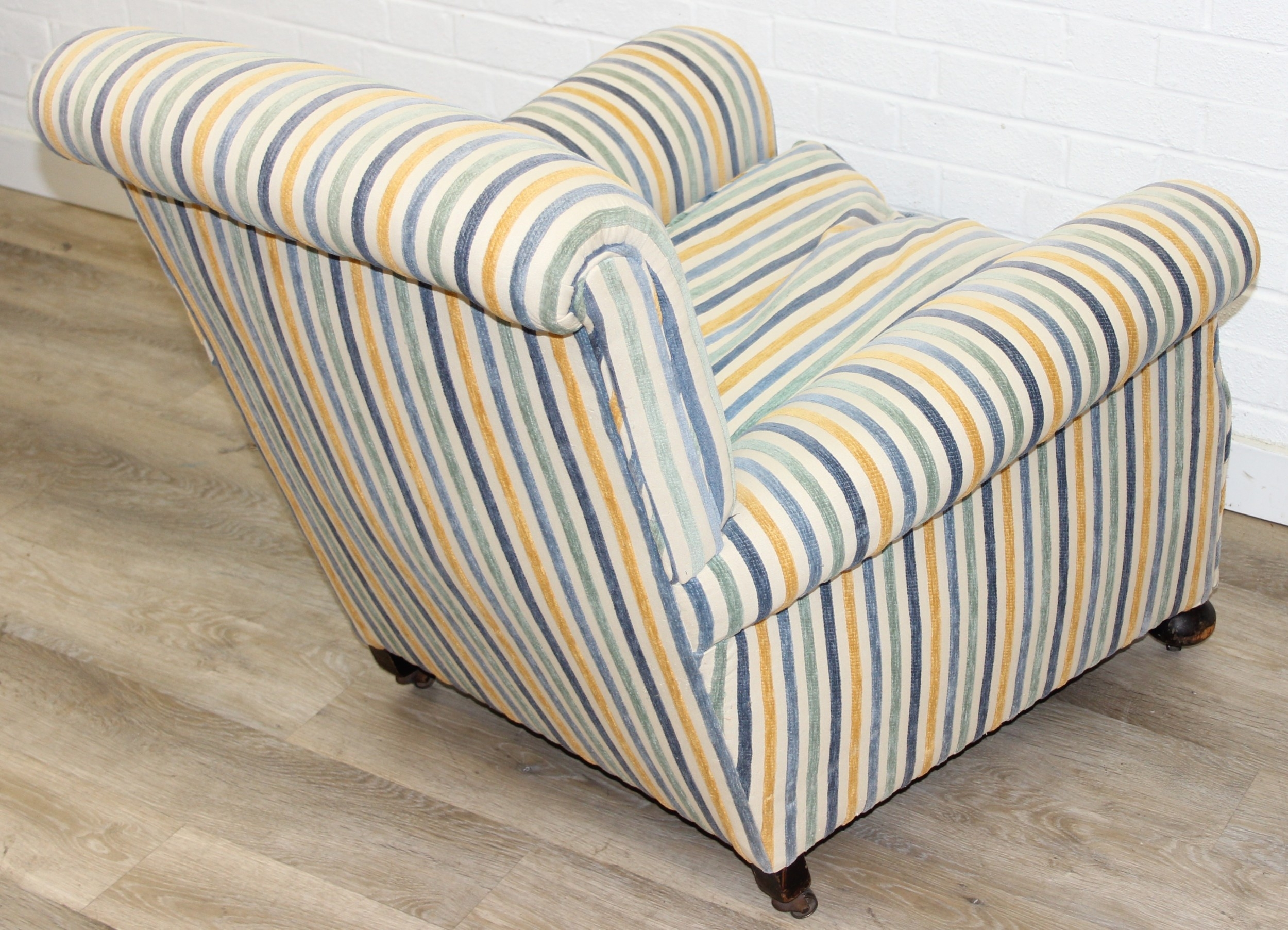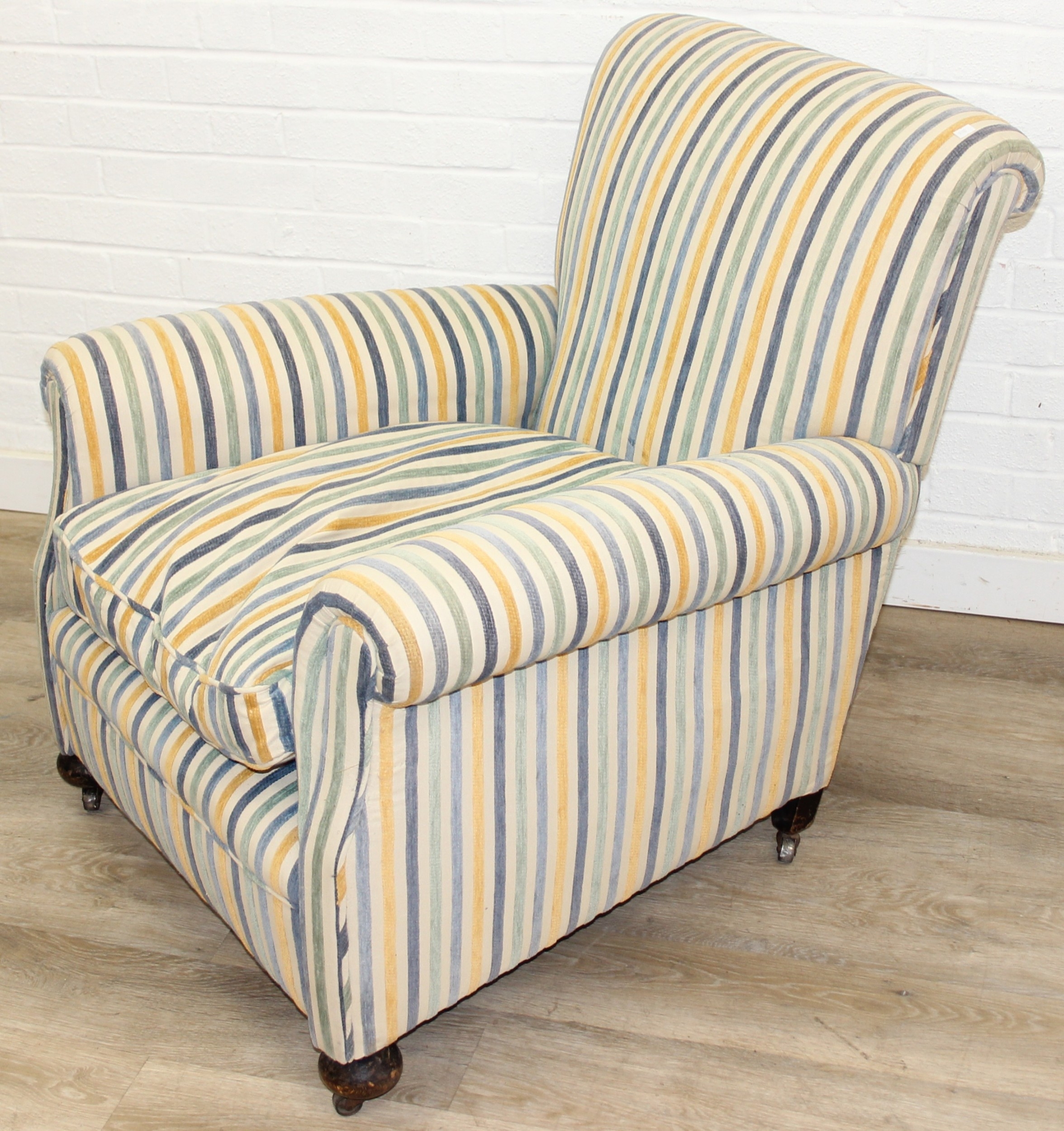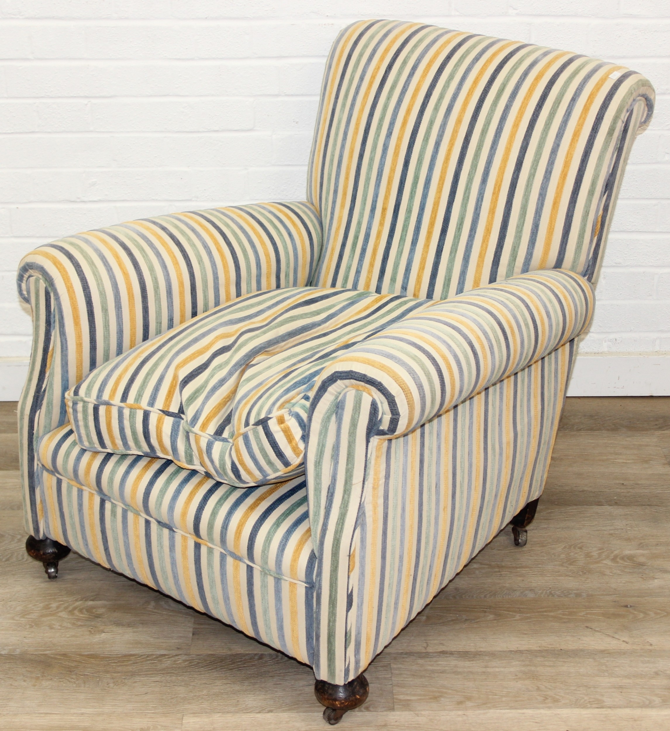 In the manner of Howard & Sons, an antique deep seated armchair with multi-coloured stripey upholstery, wooden legs with brass castors, 80cm x 80cm x 85cm