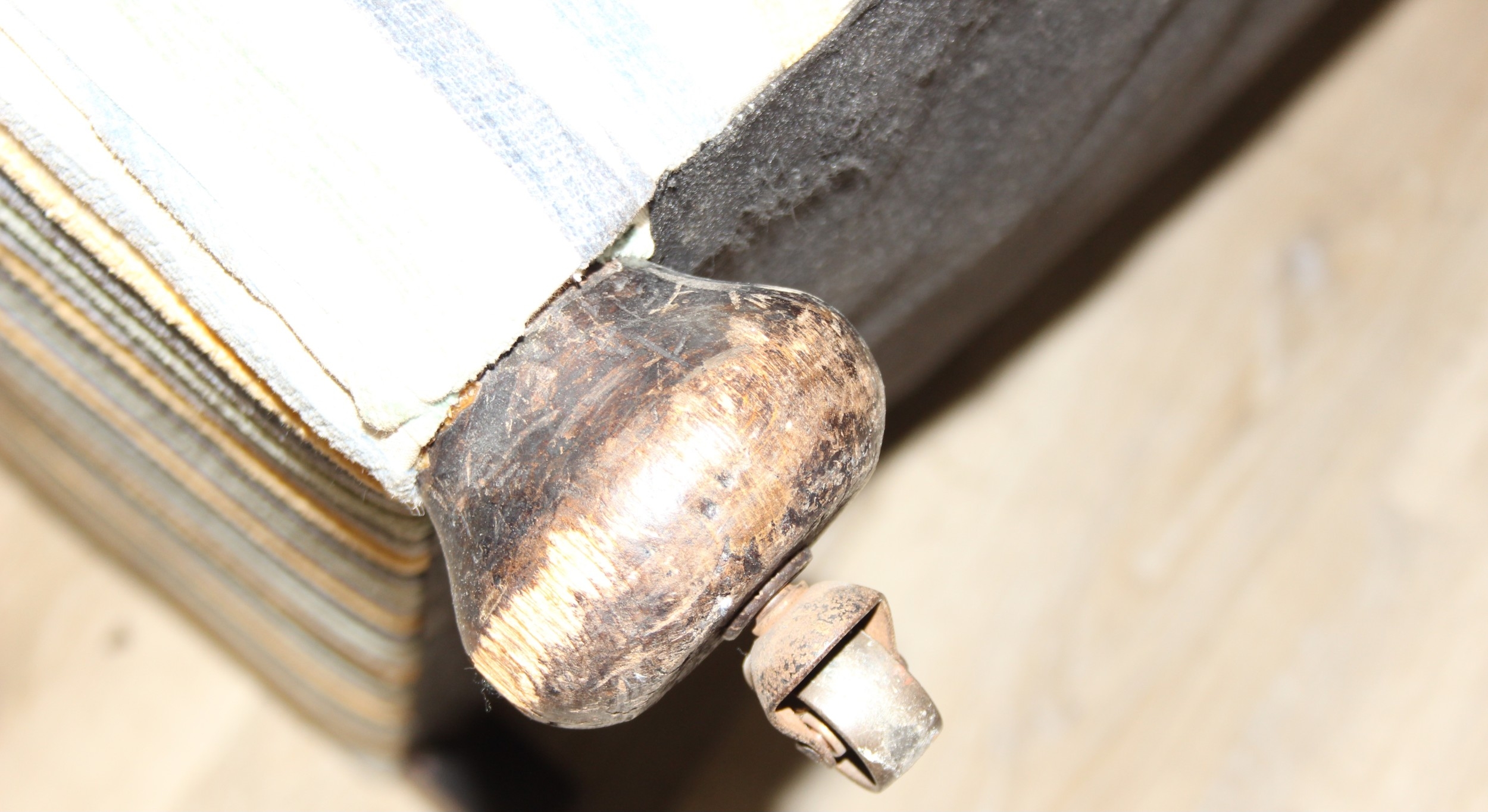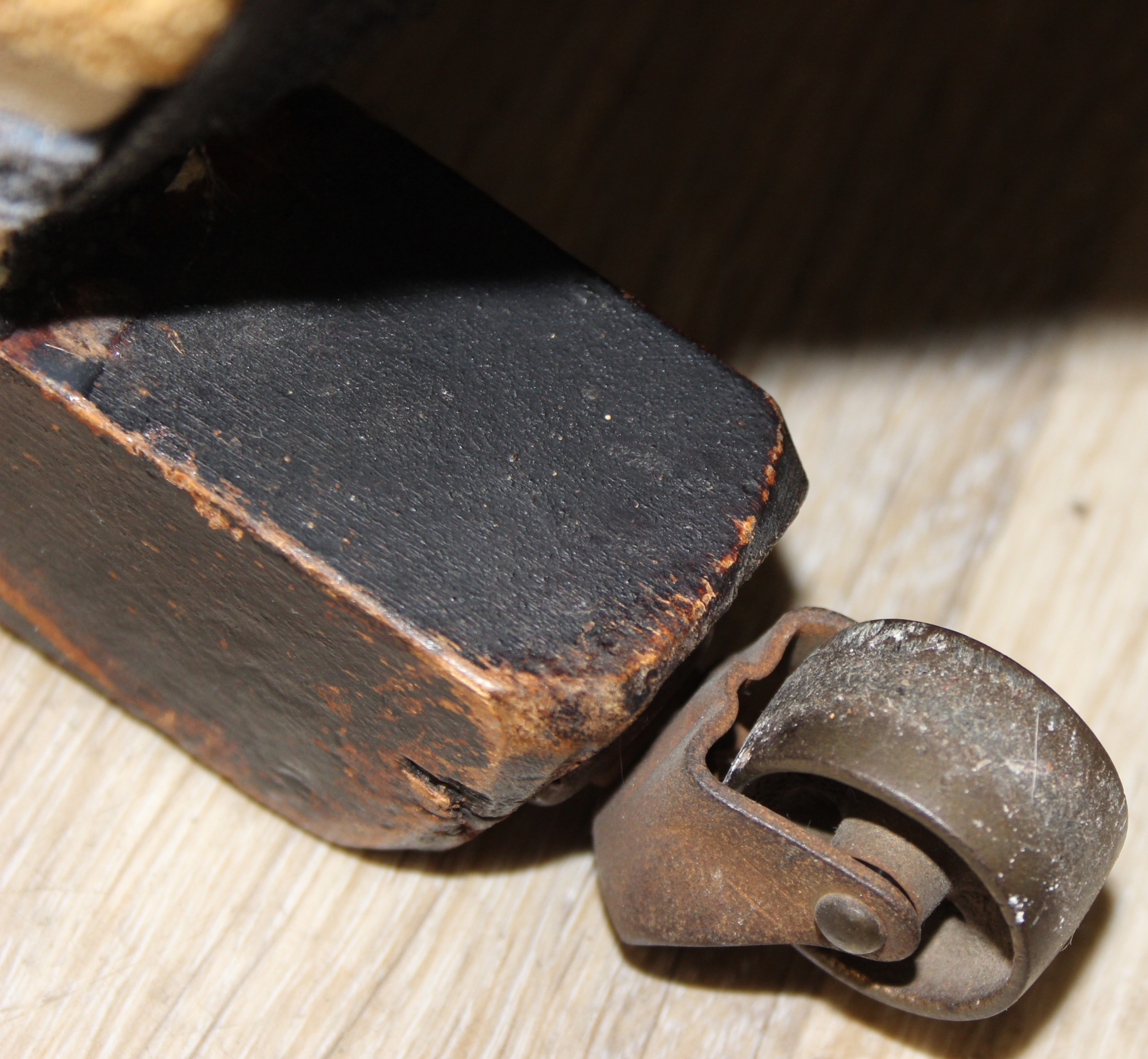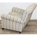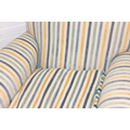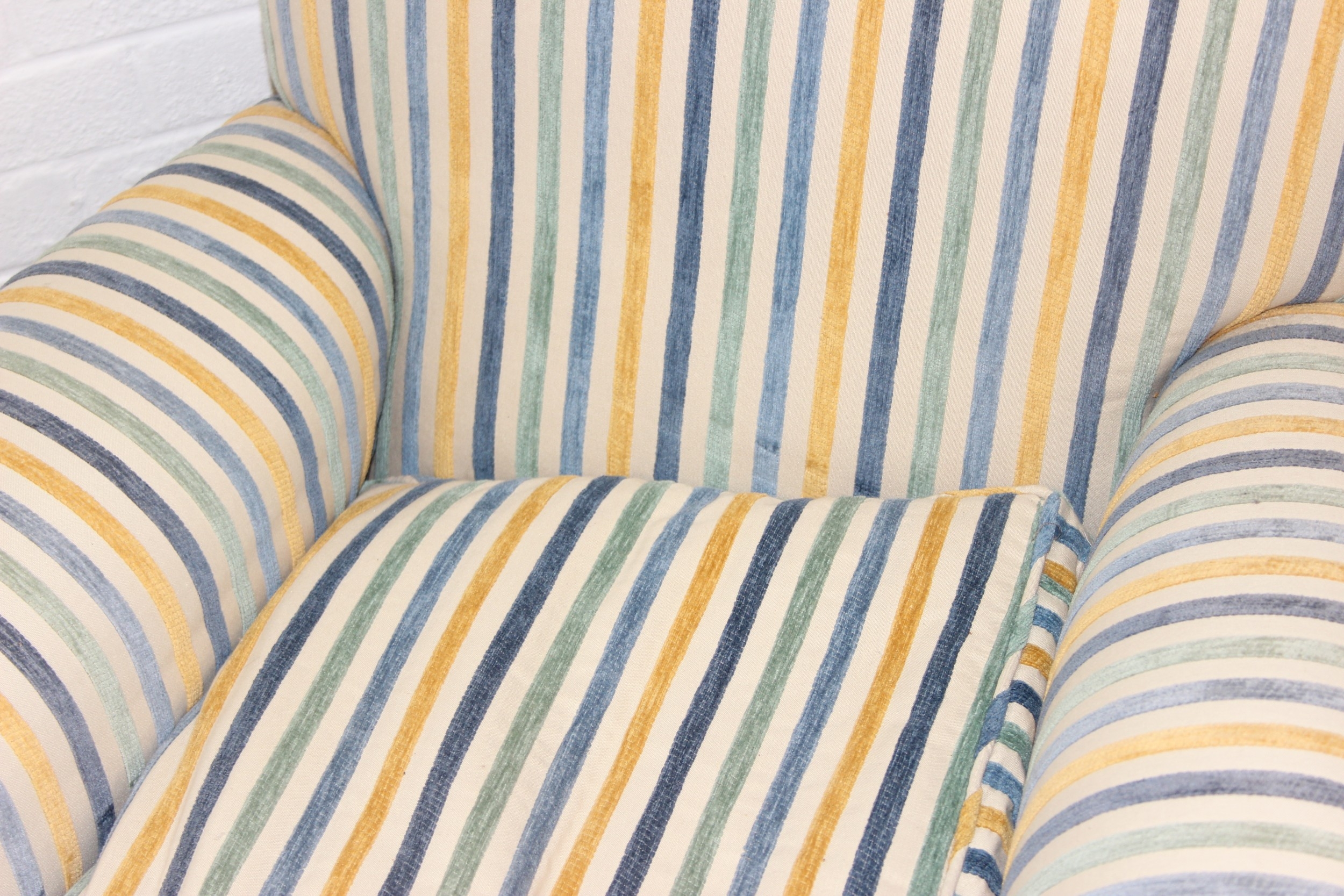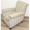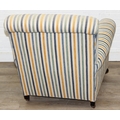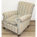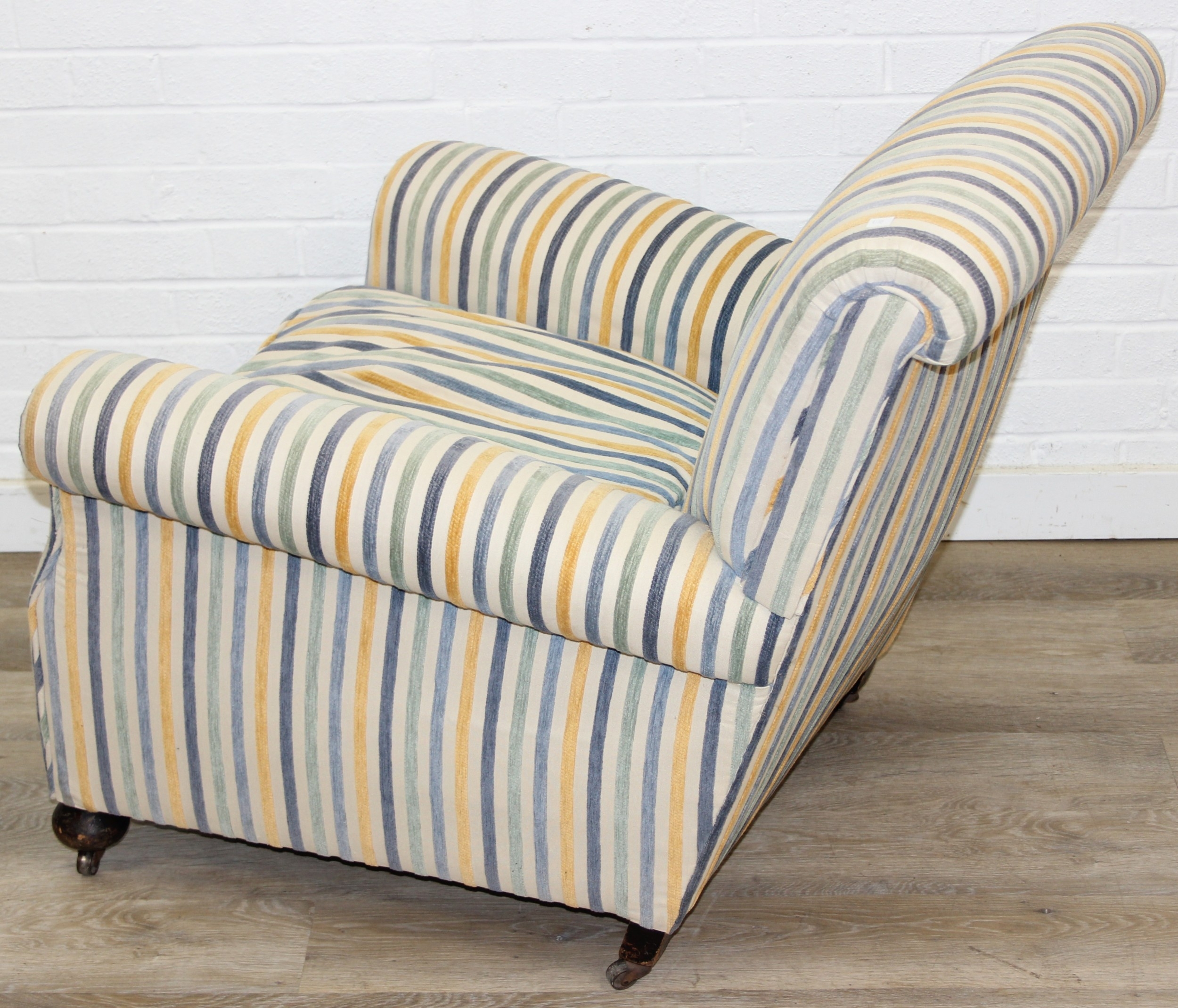 In the manner of Howard & Sons, an antique deep seated armchair with multi-coloured stripey upholstery, wooden legs with brass castors, 80cm x 80cm x 85cm