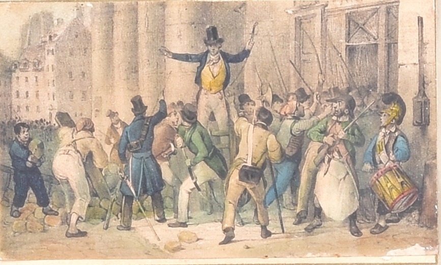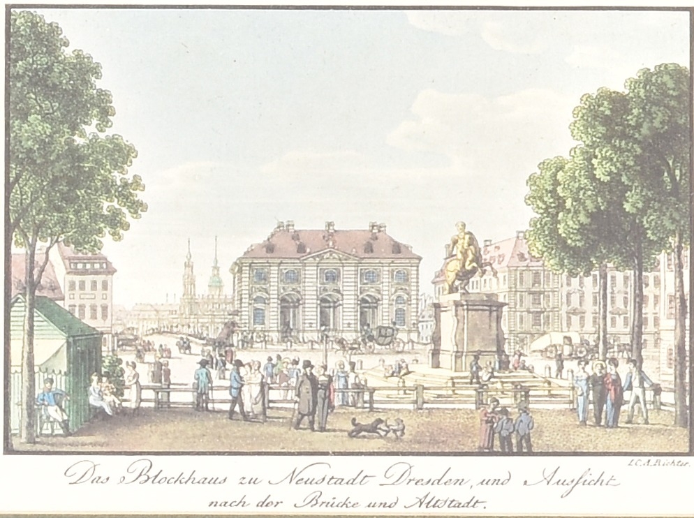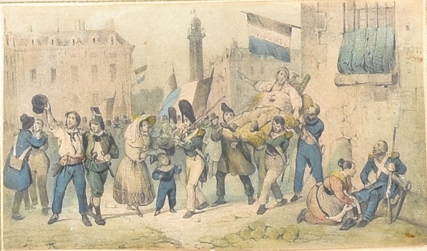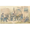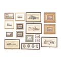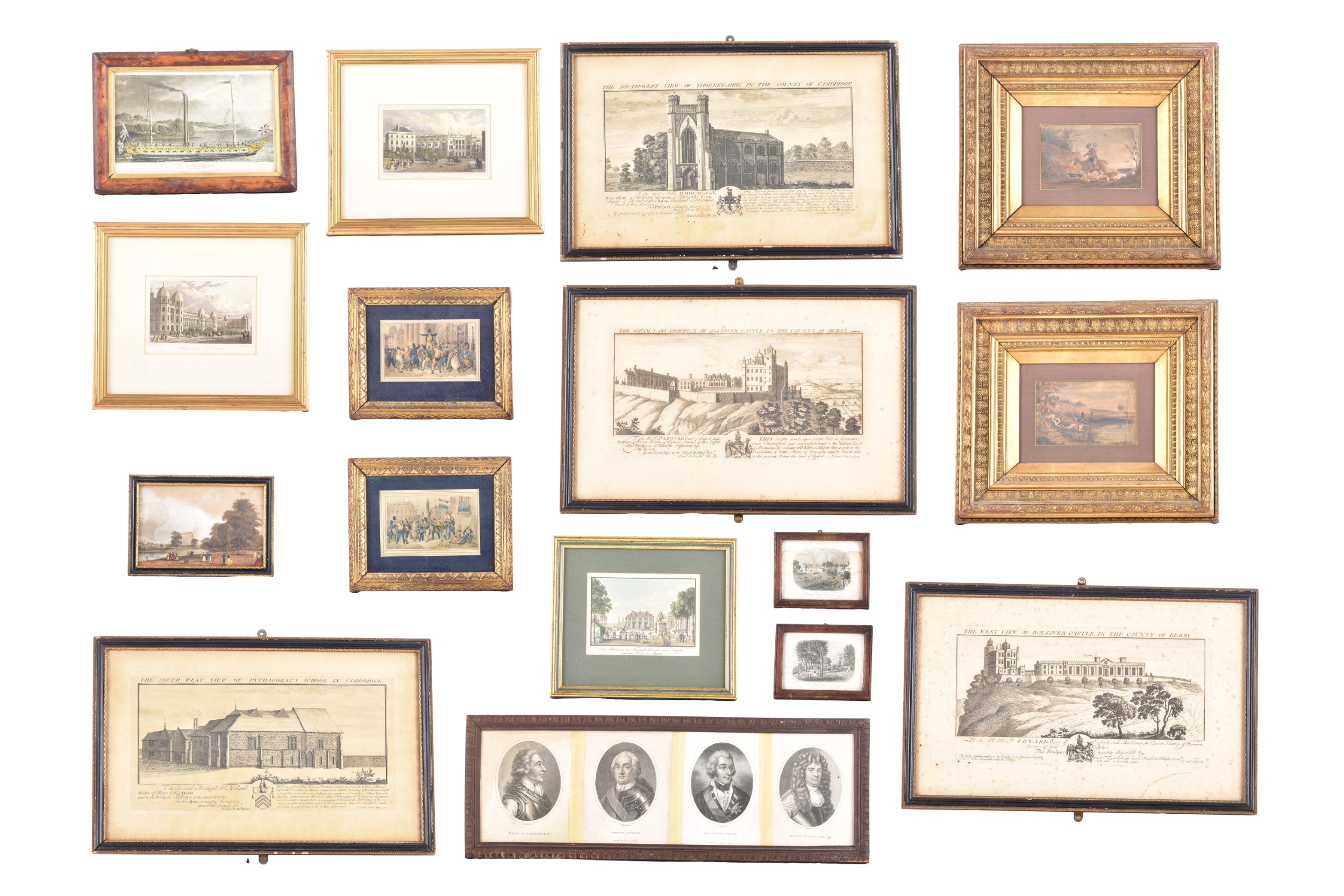 A quantity of vaious framed prints to include scenes of Richmond Surrey, the French Revolution, prospects of Bolsiver Castle and a pair of hunting scenes in gilt frames, gilt and black frames and glazed. (16)