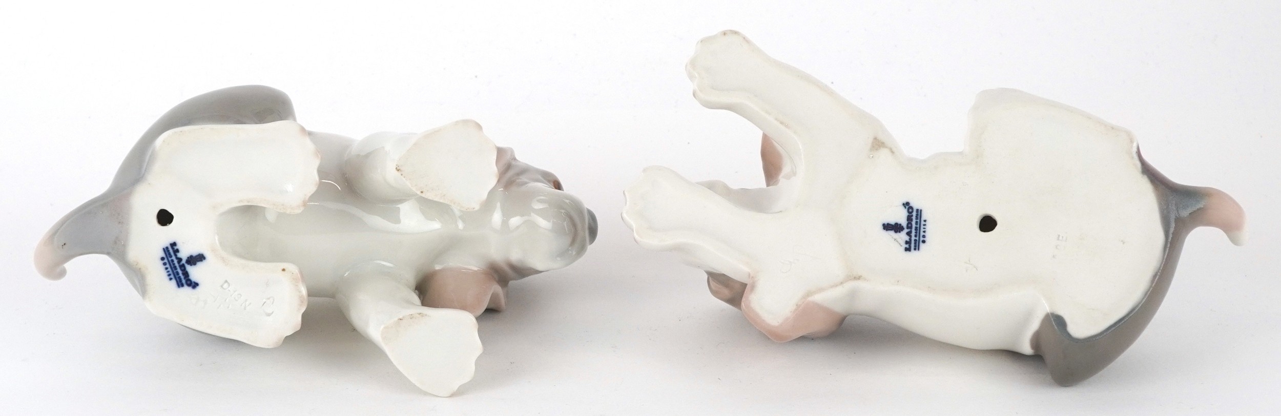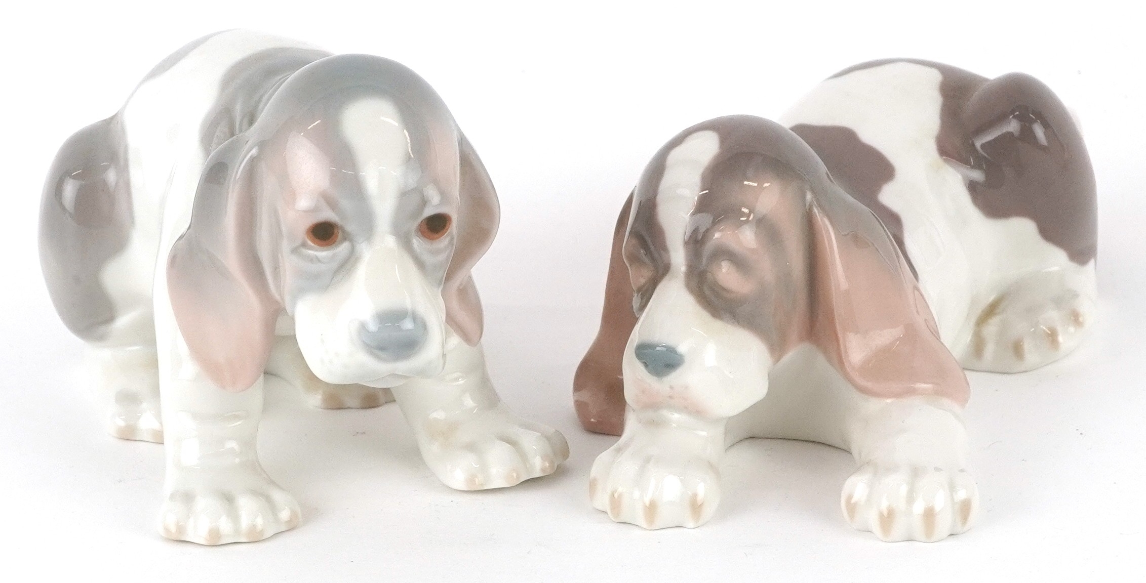 Two Lladro porcelain models of dogs, D-13N, AOE, the largest 18cm in length.