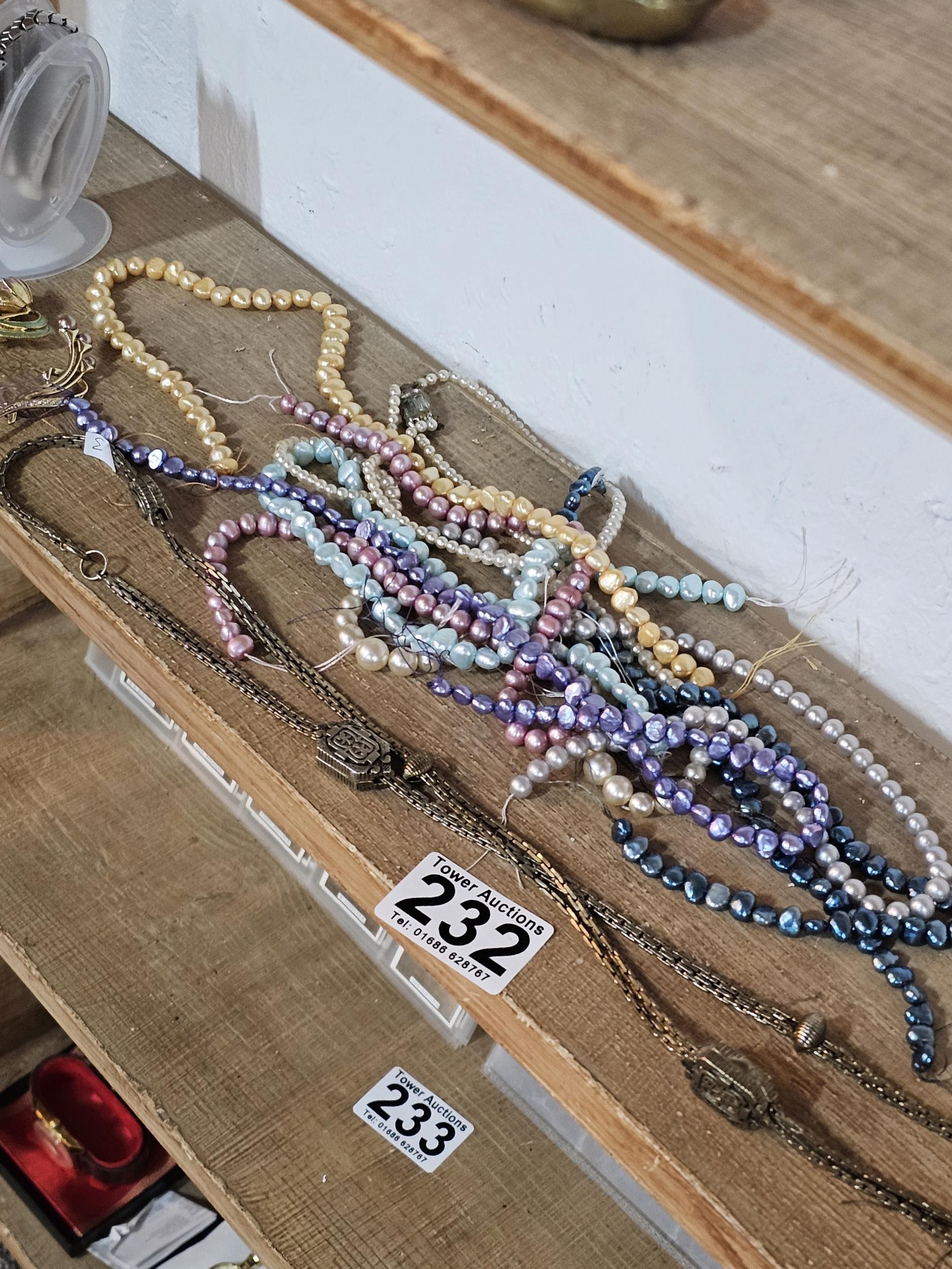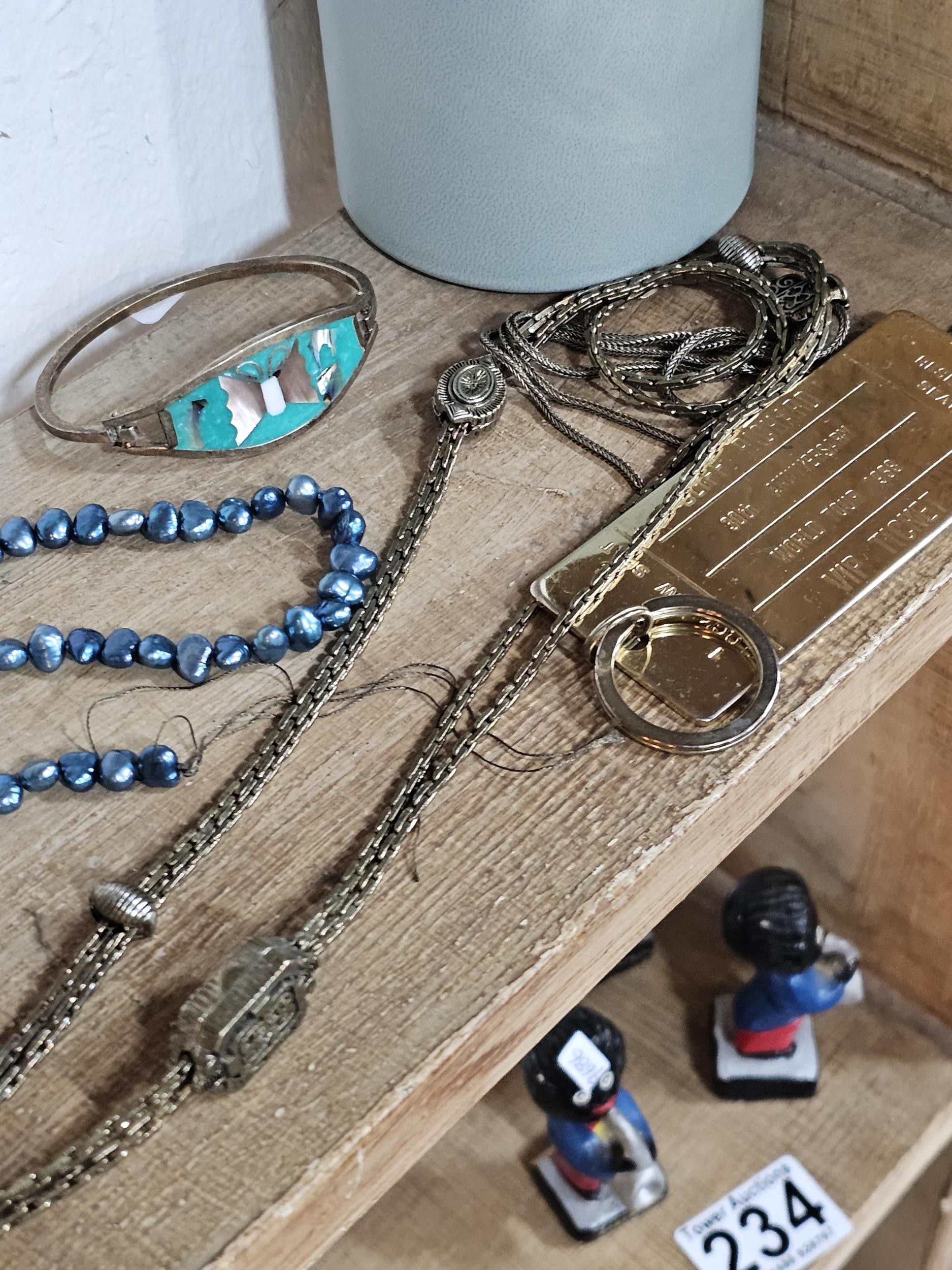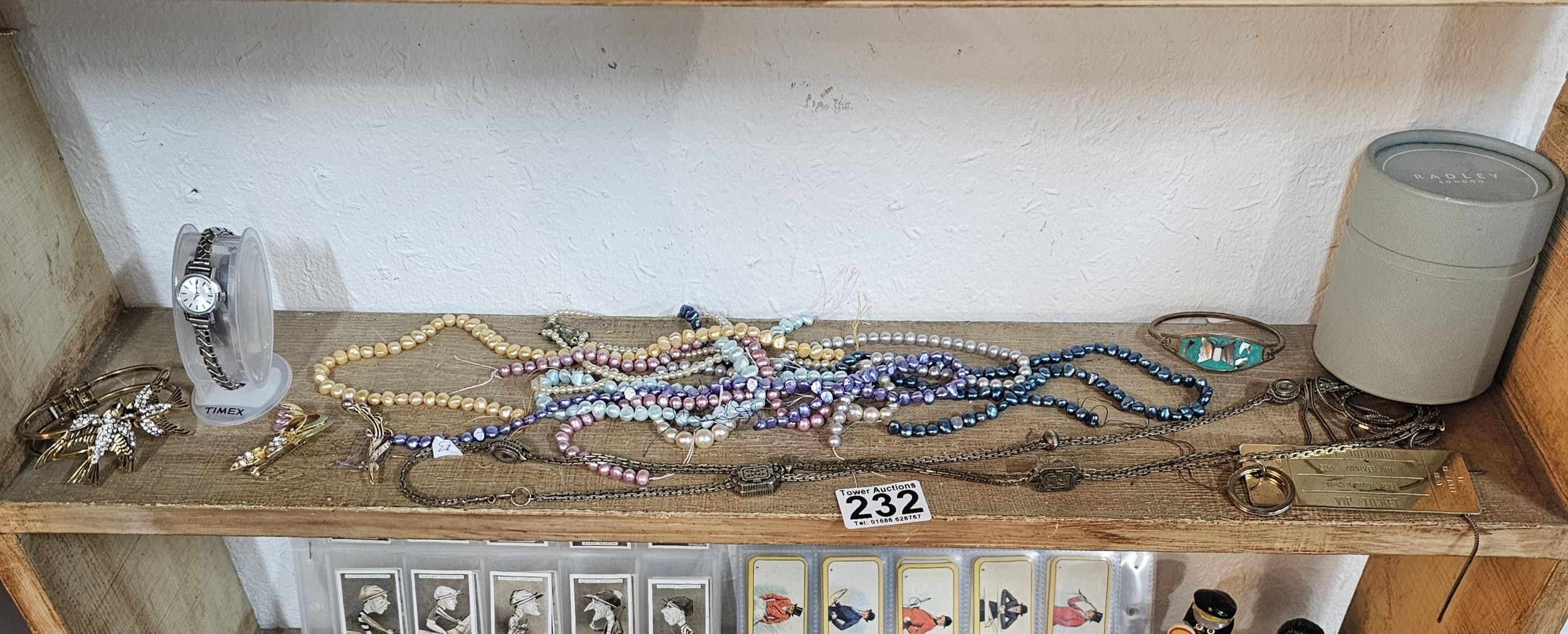 A small quantity of costume jewellery to include beaded necklaces, a metal bracelet with enamel picture to the top, a Timex ladies watch, a Radley ladies watch etc