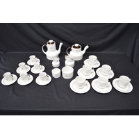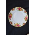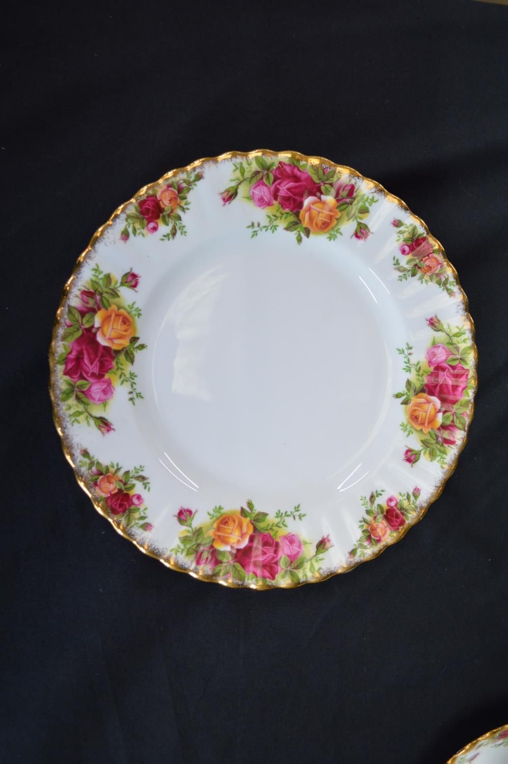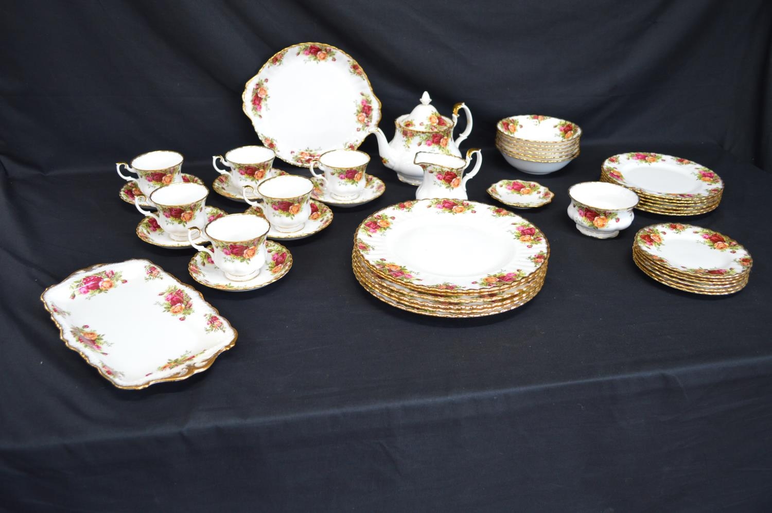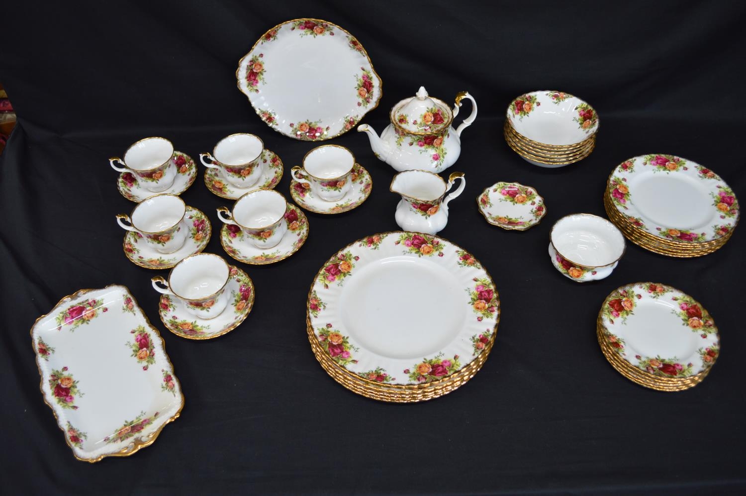 Royal Albert Old Country Roses six plate setting tea and dinner service to comprise: six tea cups, six 14cm saucers, milk jug, sugar bowl, teapot, 11.5cm dish, six 16cm plates, six 21cm plates, six 26cm plates, six 16cm bowls, 26cm cake plate and 29cm two handled tray