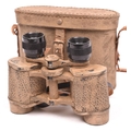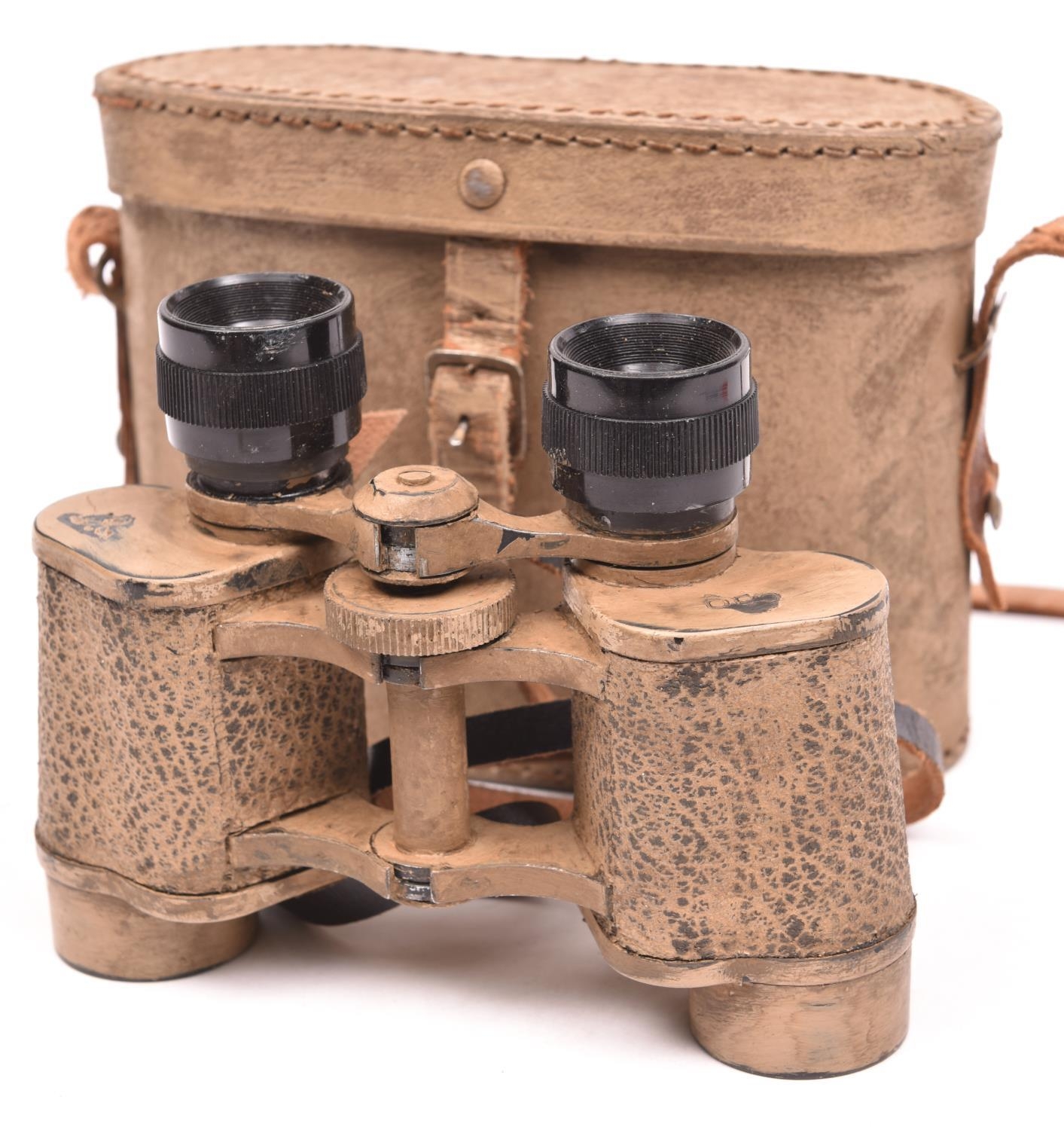 A Third Reich binocular, with eagle stamp and maker’s code “cog”, with sand coloured camouflage paint, presumably for Afrikakorps, in its sand coloured fibre case with leather straps. GC (paint on the barrels hinders focussing) £100-150