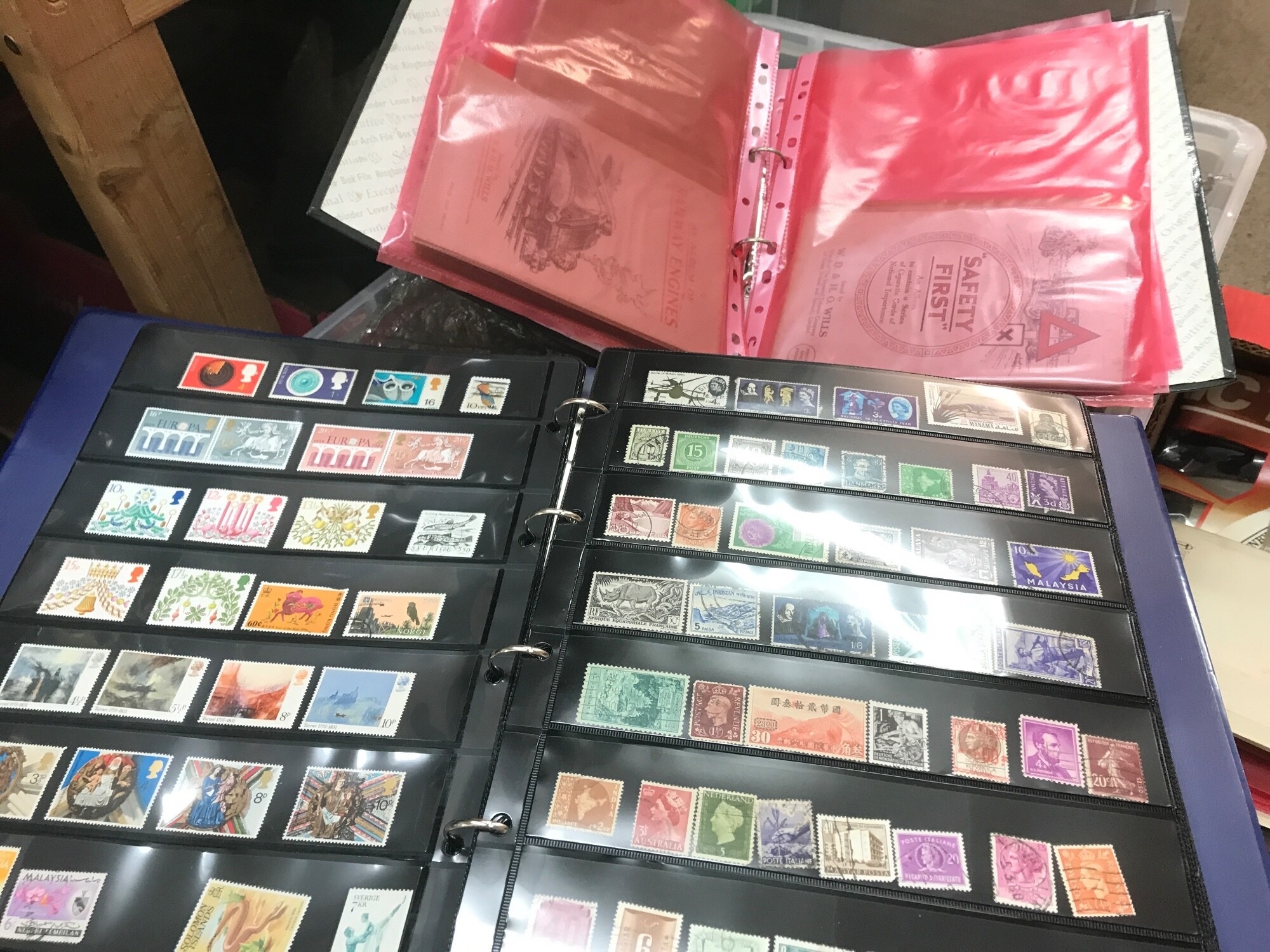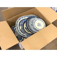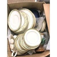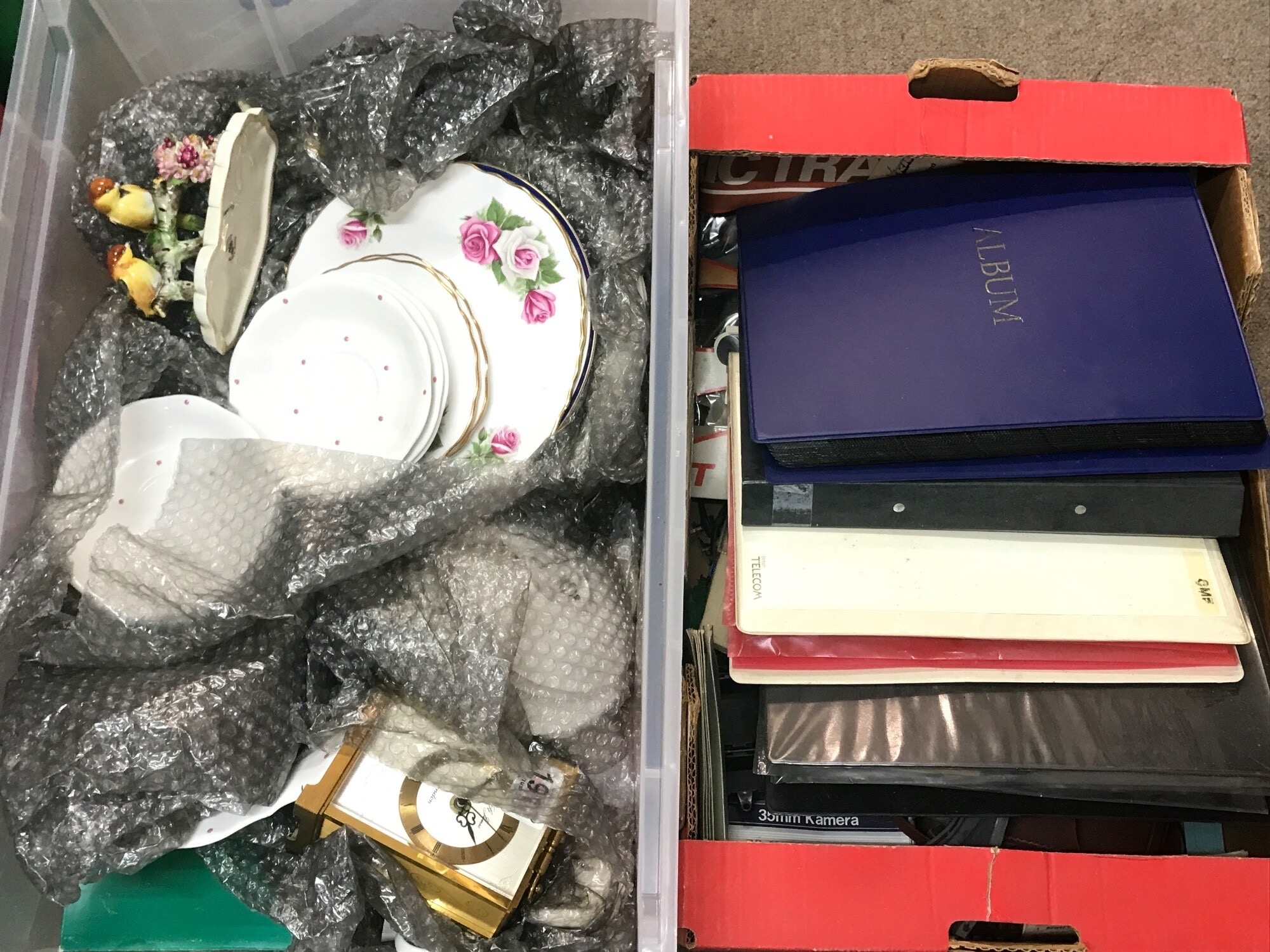 Two boxes of assorted items one containing ceramics such as Fine bone bell China, Royal Adderley birds, royal Worcester plates. The other box containing stamp albums and some toys. No reserve