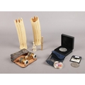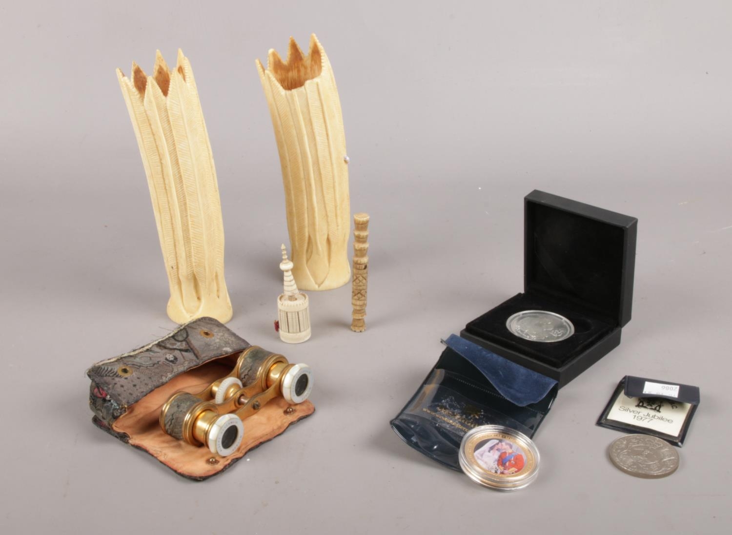 A selection of collectables. Ivory vases (18cm height), Vintage cased opera glasses, commemorative coins silver Jubilee 1977 etc.