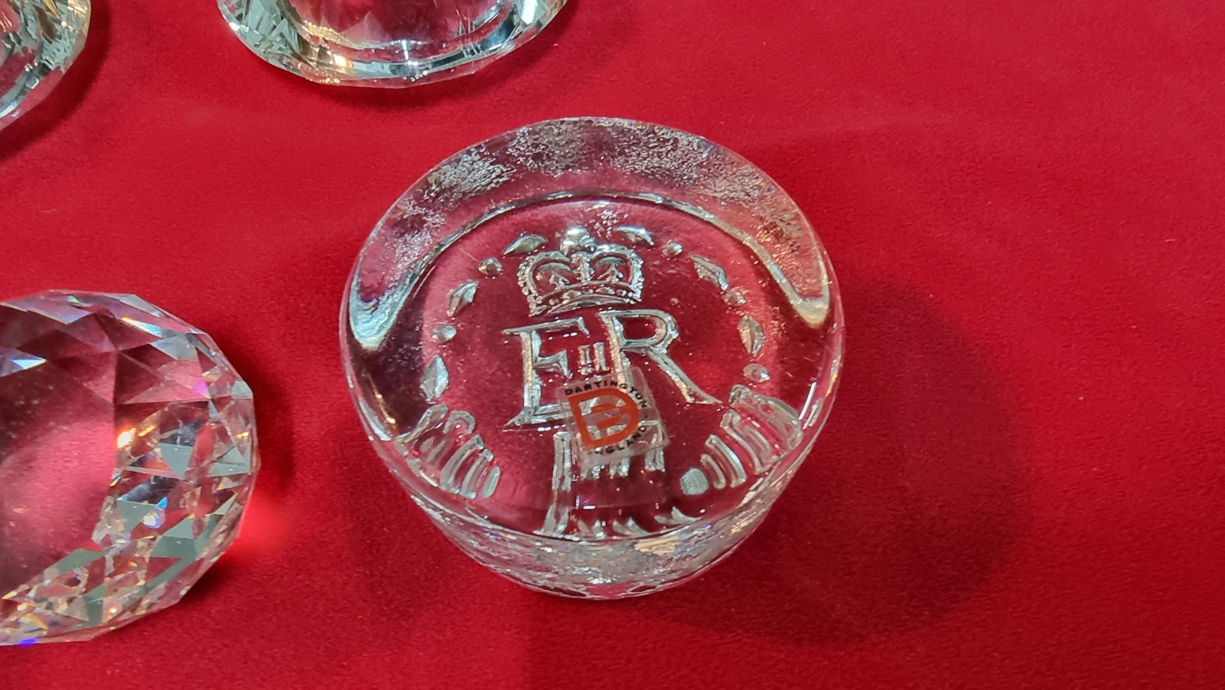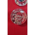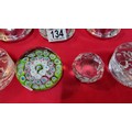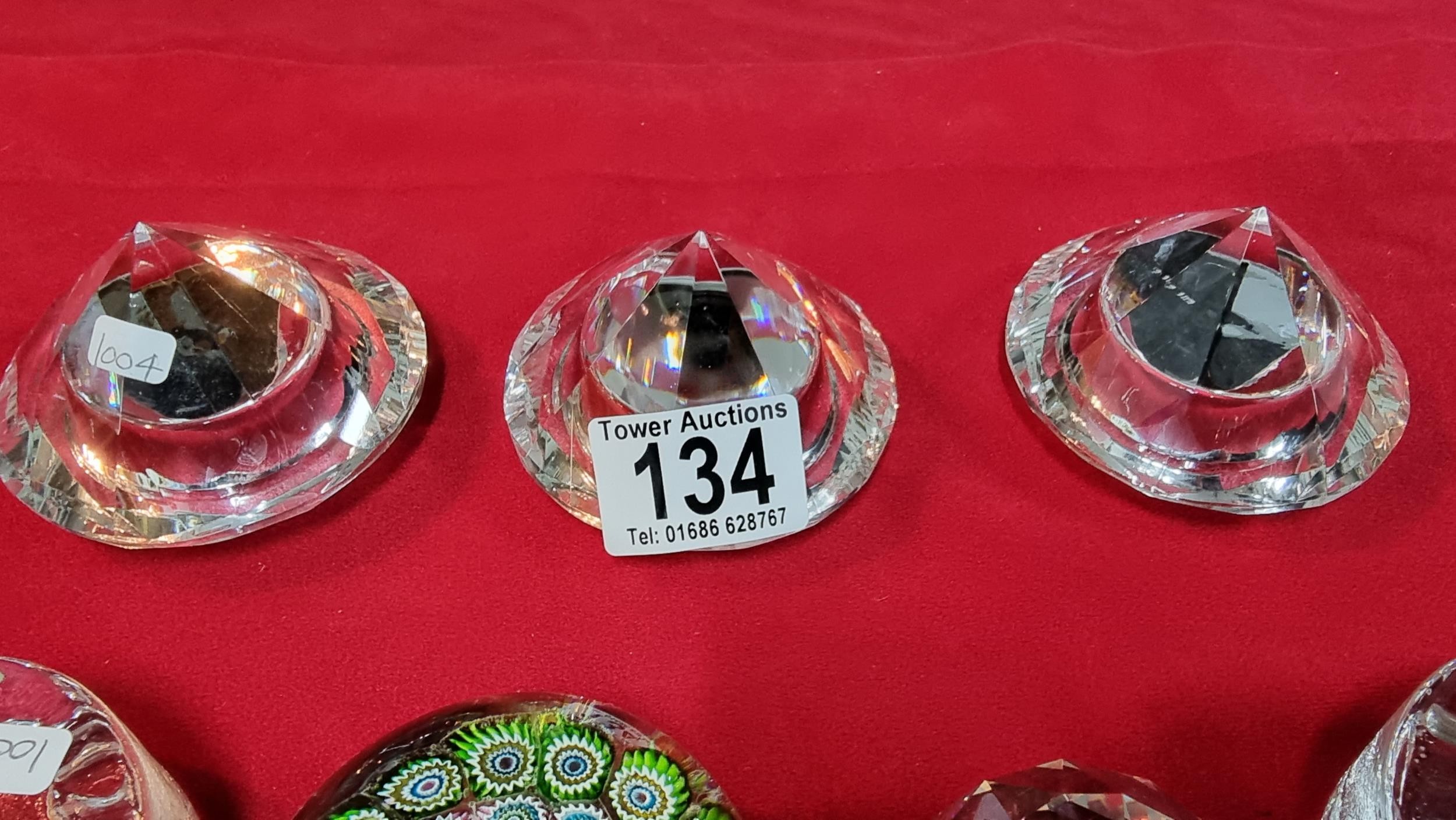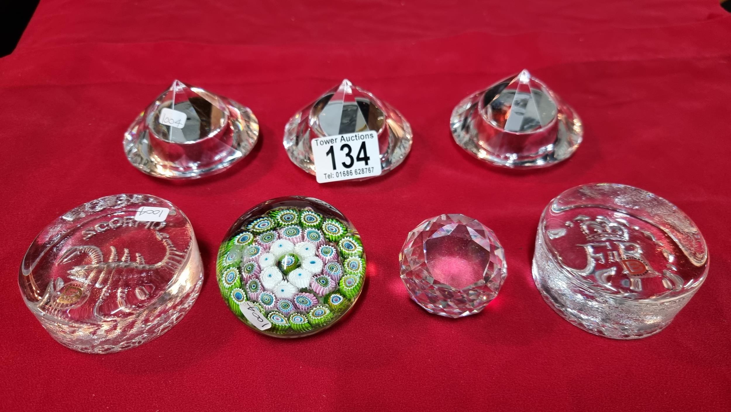 4x glass paperweights, 2x by Dartington along with 3x glass diamond formed T-light holders