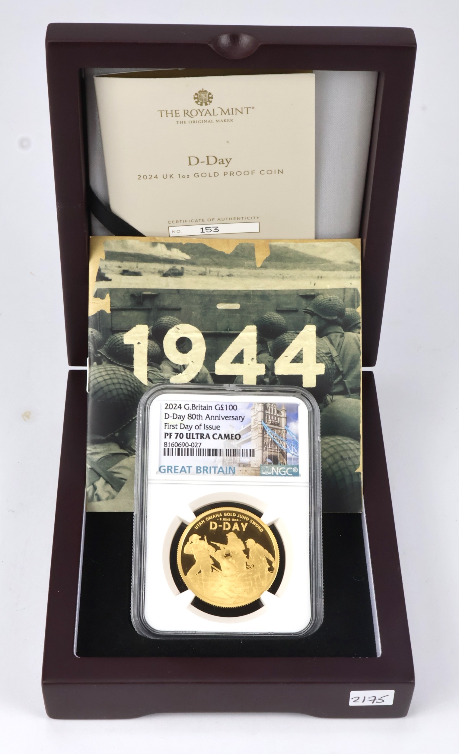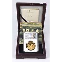 One Hundred Pounds 2024 "D-Day" gold proof (1oz). Slabbed as NGCPF70 Ultra Cameo. Boxed with a certificate